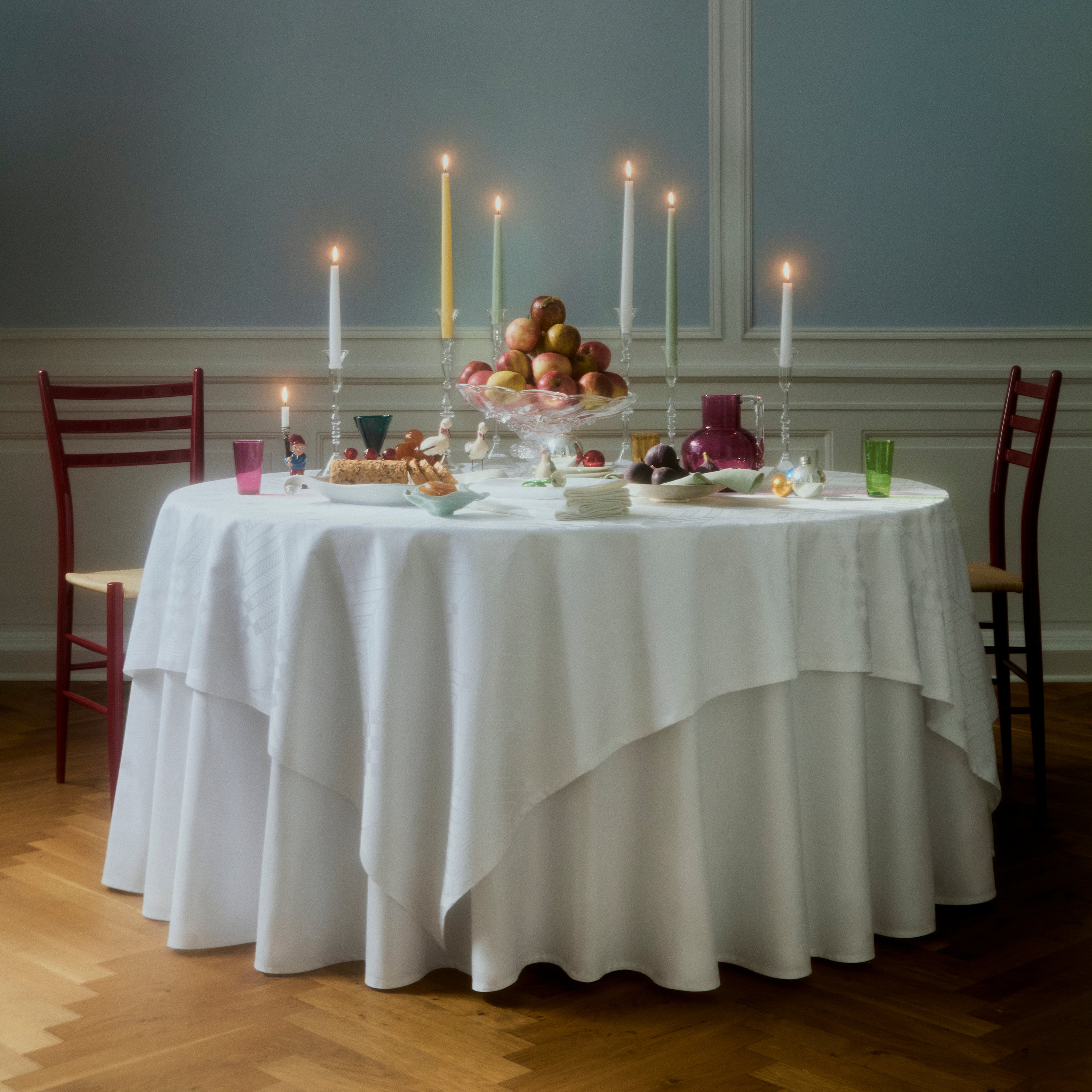Die klassische weiße Variante der Georg Jensen Damask Weihnachtstischdecke ist eine elegante Grundlage für die festliche Tischdekoration.