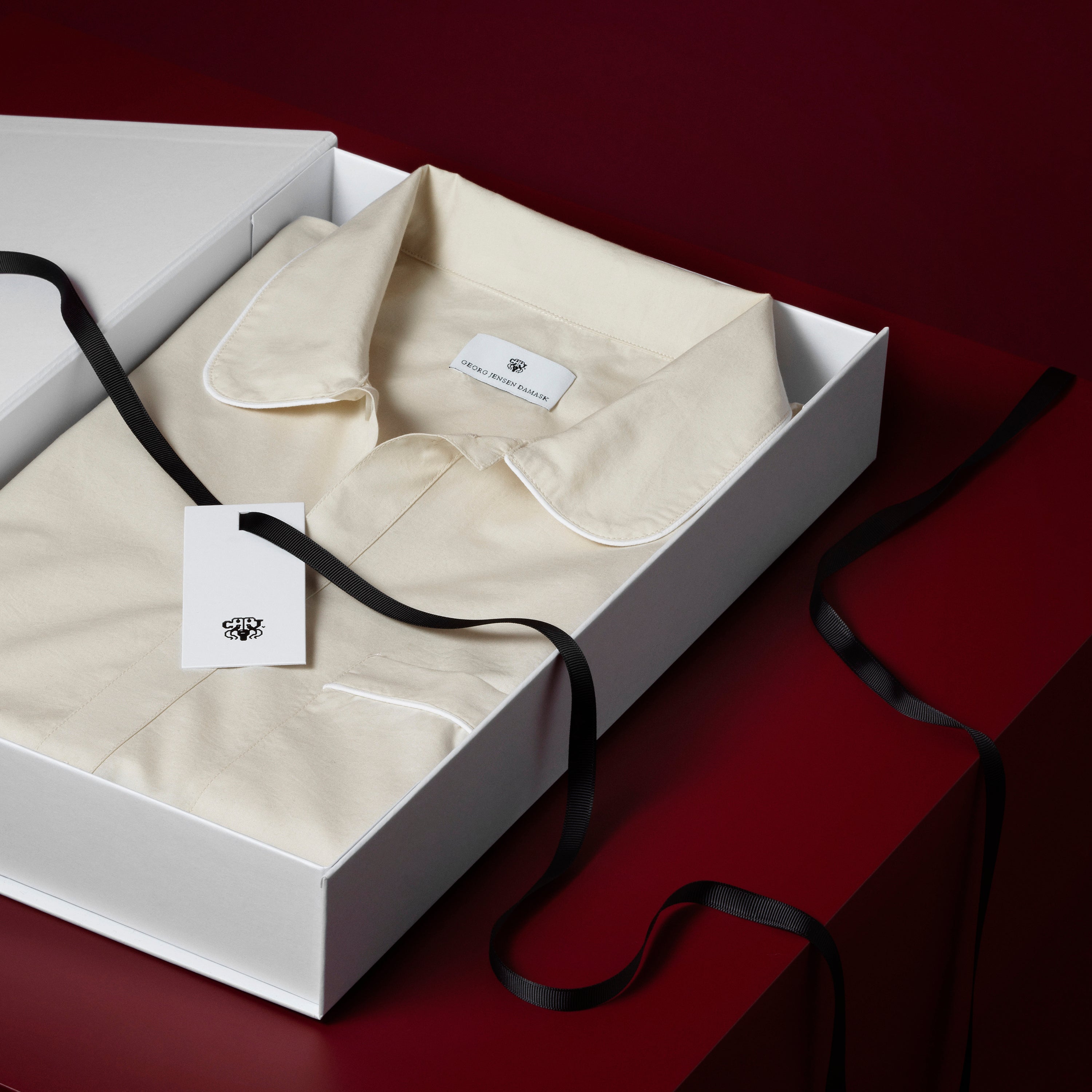 Percale-gewebter Pyjama mit klassischem Schnitt und eleganten Details wie Seitenschlitzen, Brusttasche, abgerundeten Kragen und weißen Paspelierungen.