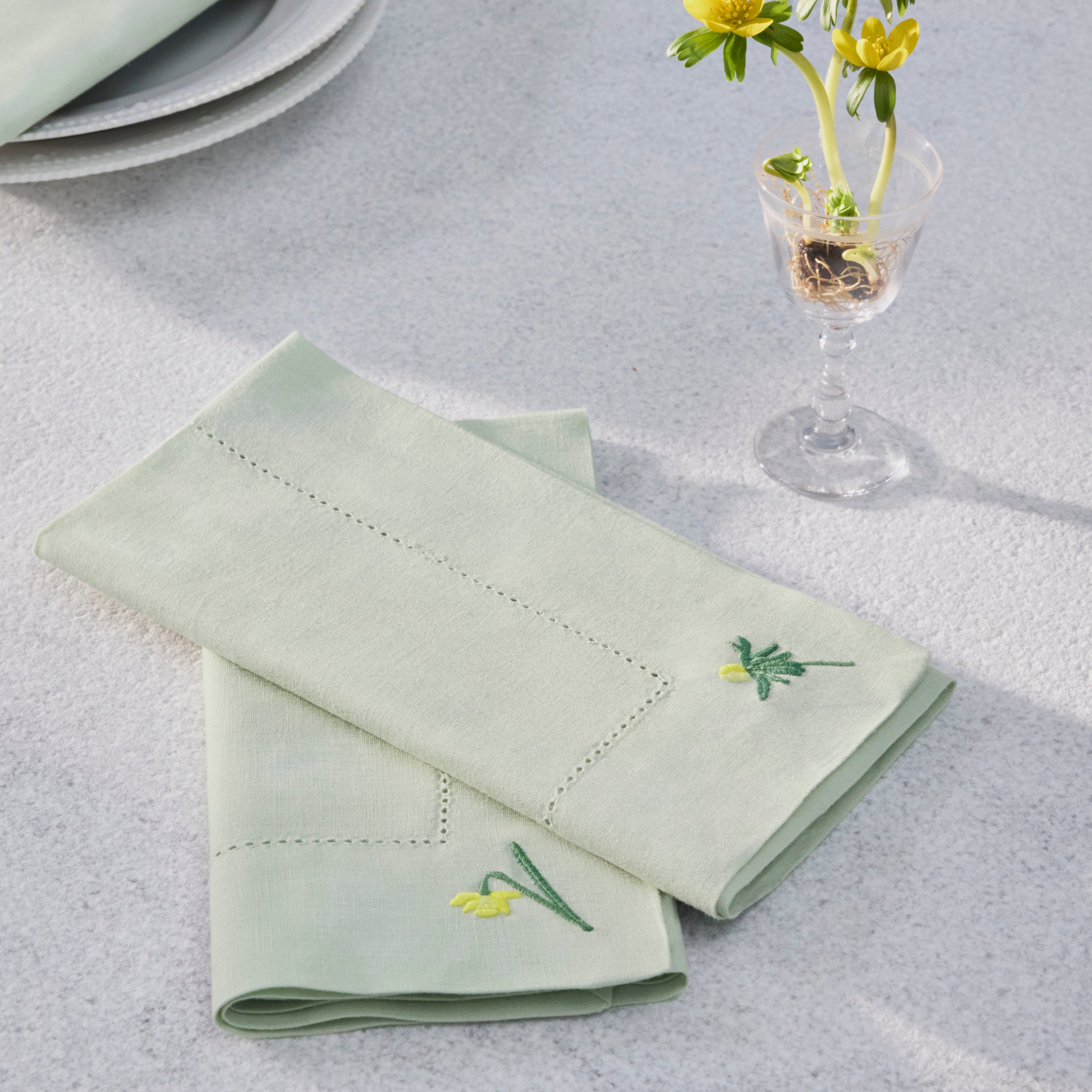 Narzissen, Winterlinge und Anemonen. Die neuen Spring servietten sind mit Motiven der ersten Frühlingsblumen bestickt. Jetzt erhalten Sie 2 Stück zum Einführungspreis.