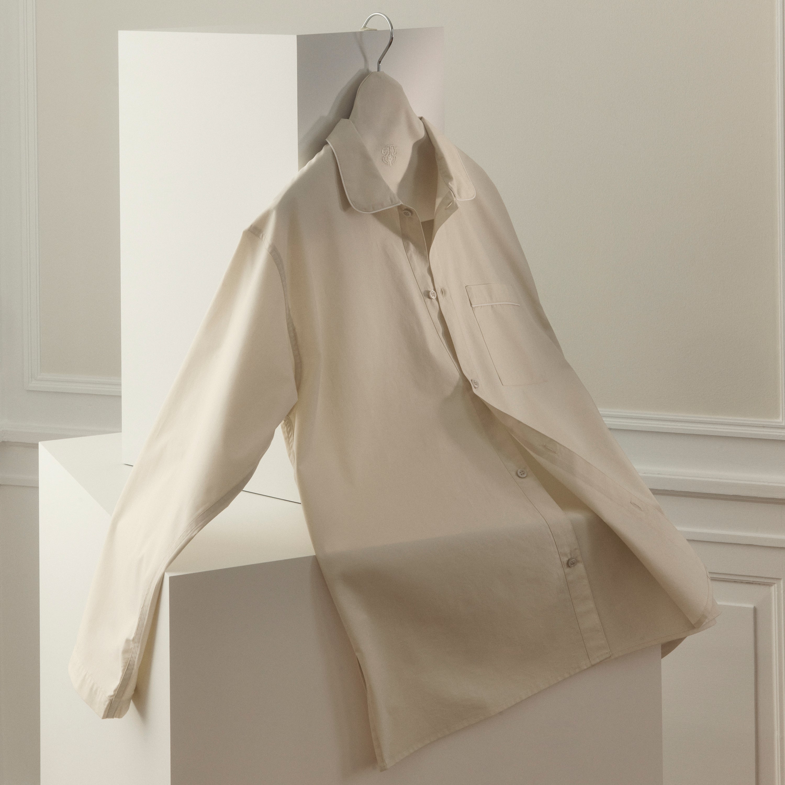 Percale-gewebter Pyjama mit klassischem Schnitt und eleganten Details wie Seitenschlitzen, Brusttasche, abgerundeten Kragen und weißen Paspelierungen.
