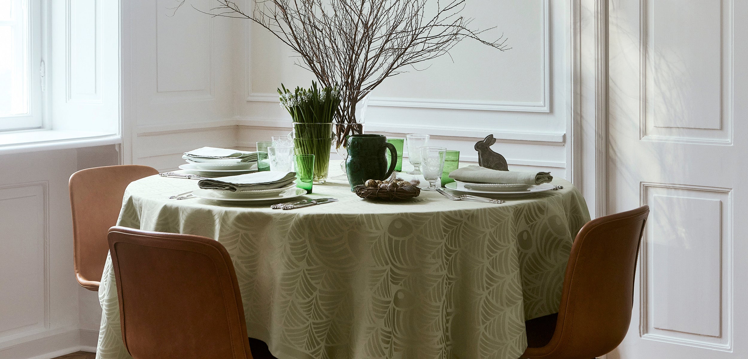 Das ikonische Osterdesign von Georg Jensen Damask bildet einen einladenden Rahmen um den Ostertisch.