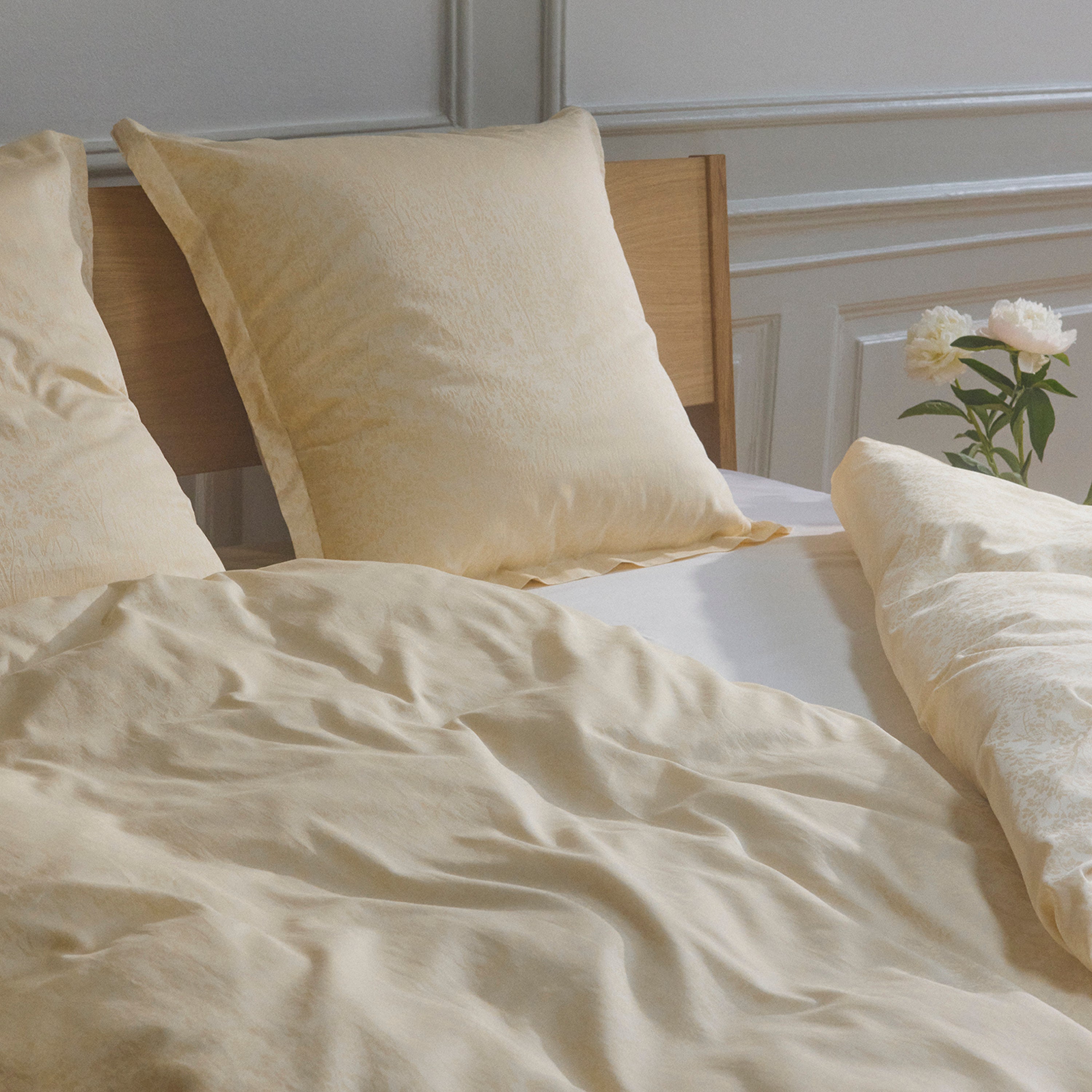 Frisch ausgetriebene Bäume, Rehe und Kaninchen treten dezent im Damastgewebe des Forest‑Bettwäschedesigns hervor. Das historische Motiv stammt von einem Gobelin aus dem 19. Jahrhundert, der im Archiv von Georg Jensen Damask gefunden wurde.