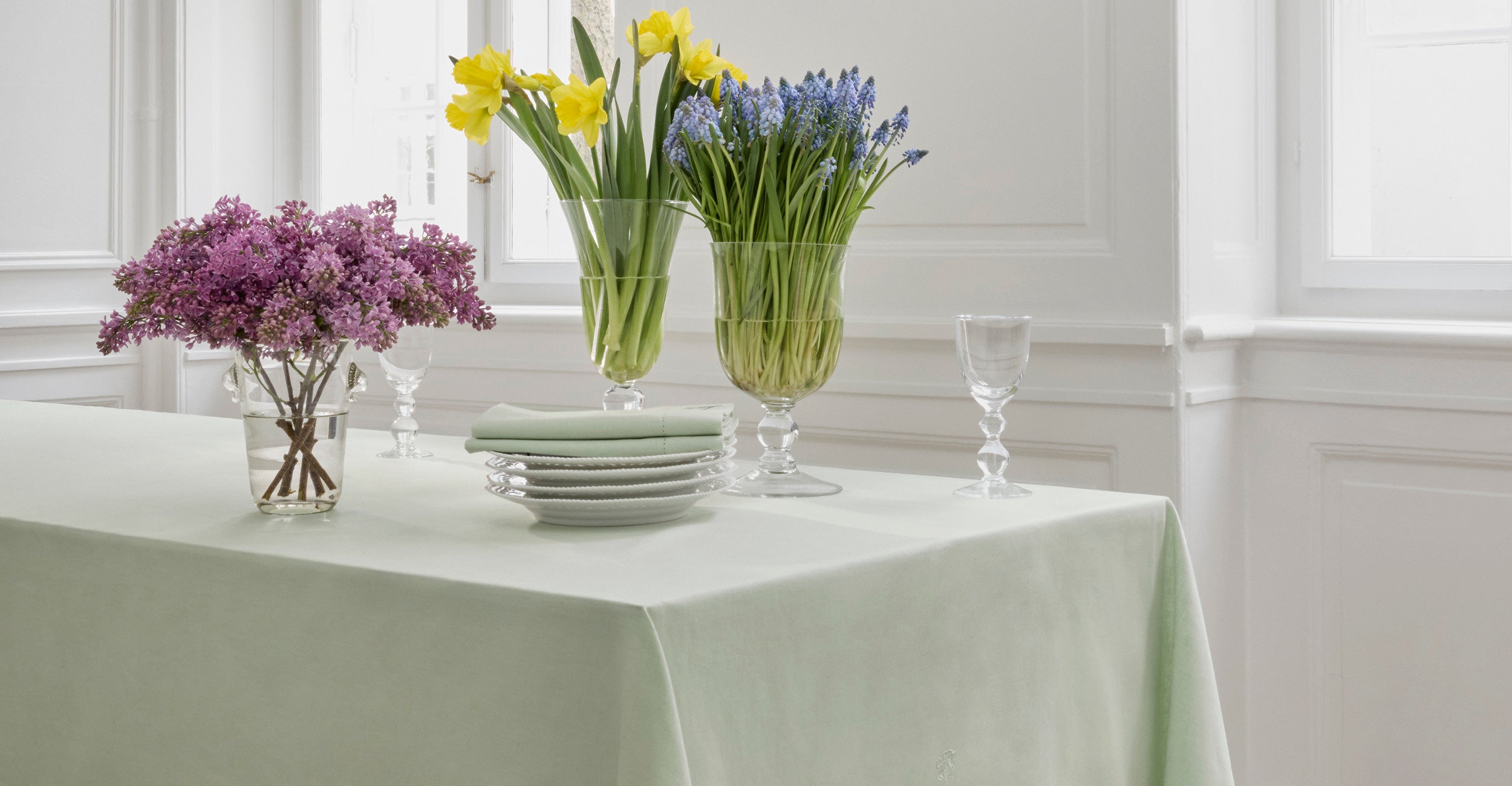 Georg Jensen Damask lanciert Picot – eine schöne und schlichte Tischdecke aus Leinen und Baumwolle mit eleganter Hohlsaumkante.