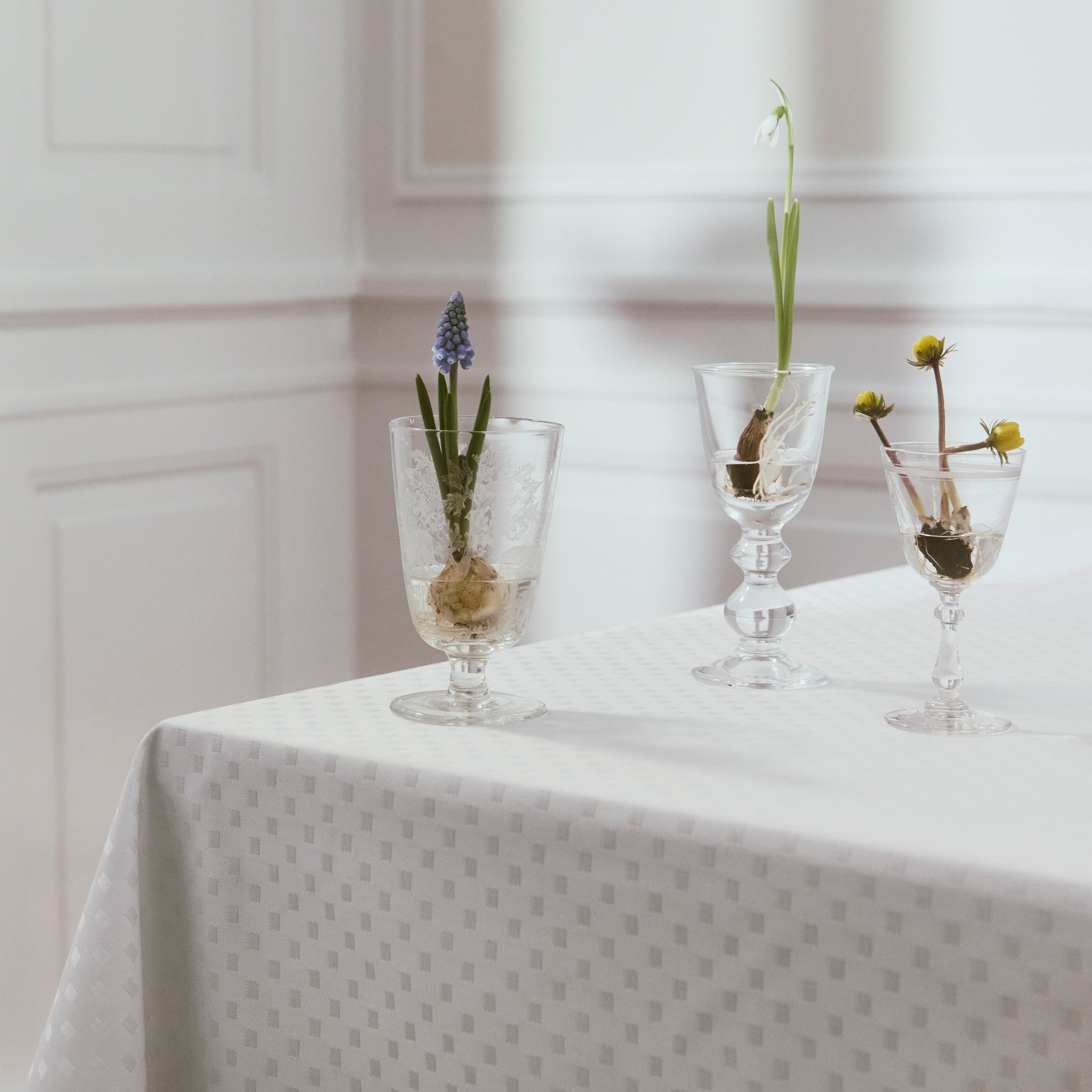 Georg Jensen Damask hat alles für die Tischdekoration. Von damastgewebten Tischdecken und Servietten in schönen Designs bis hin zu handgezogenen Stumpenkerzen in passenden Farben.