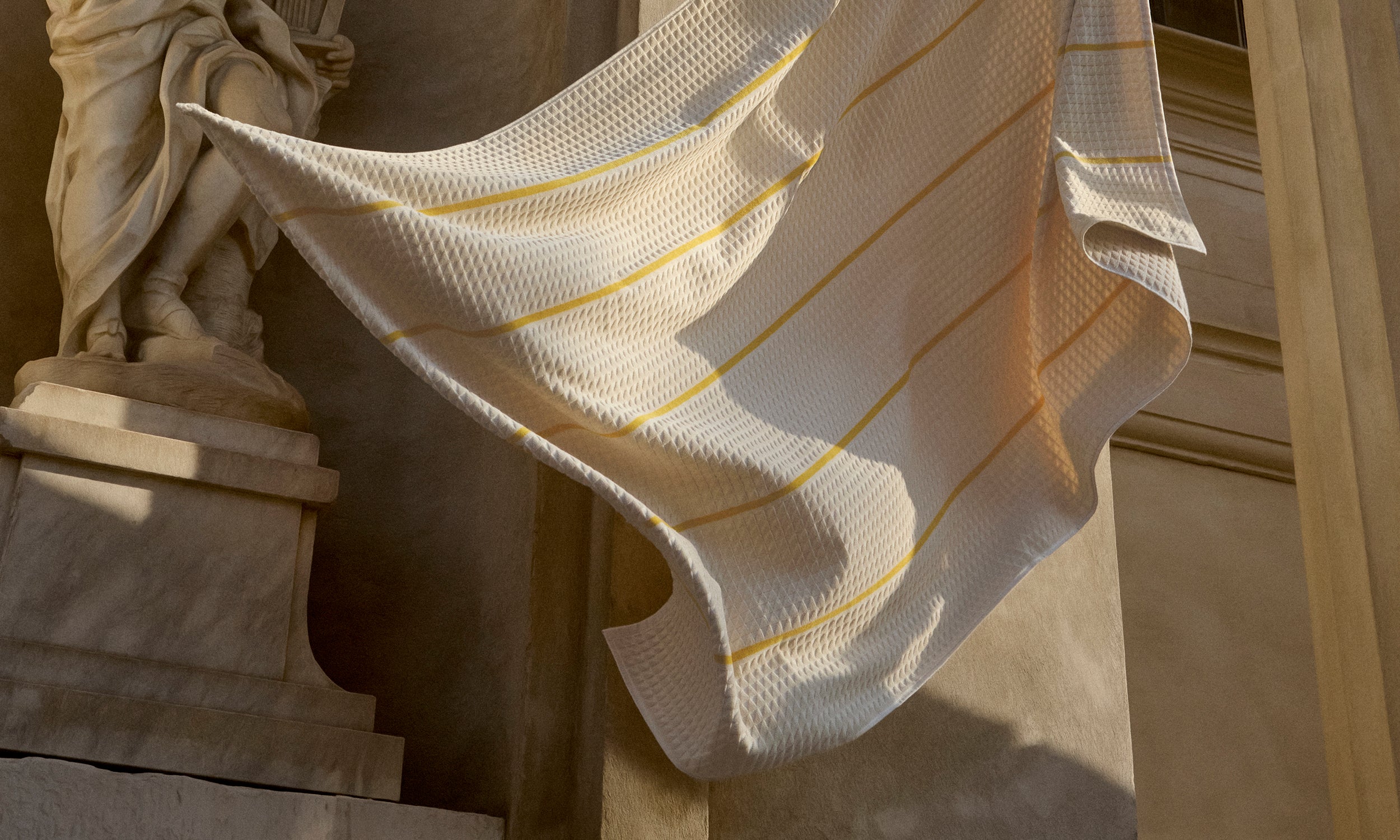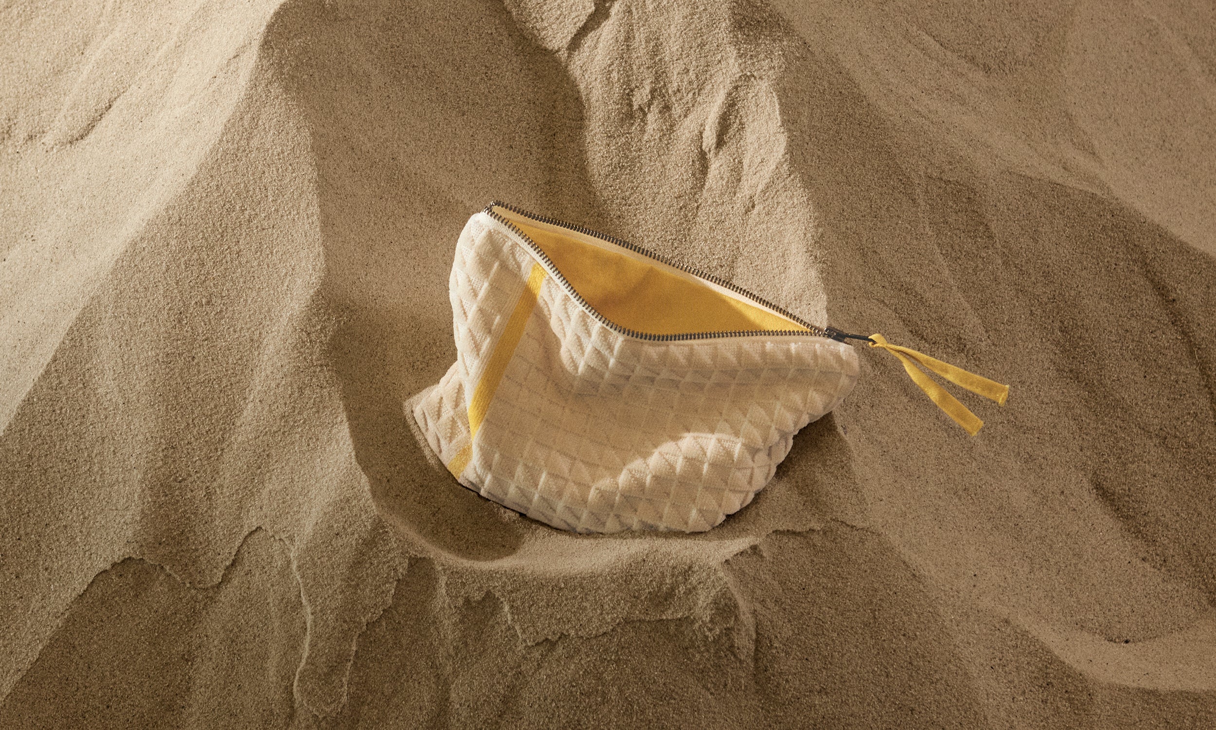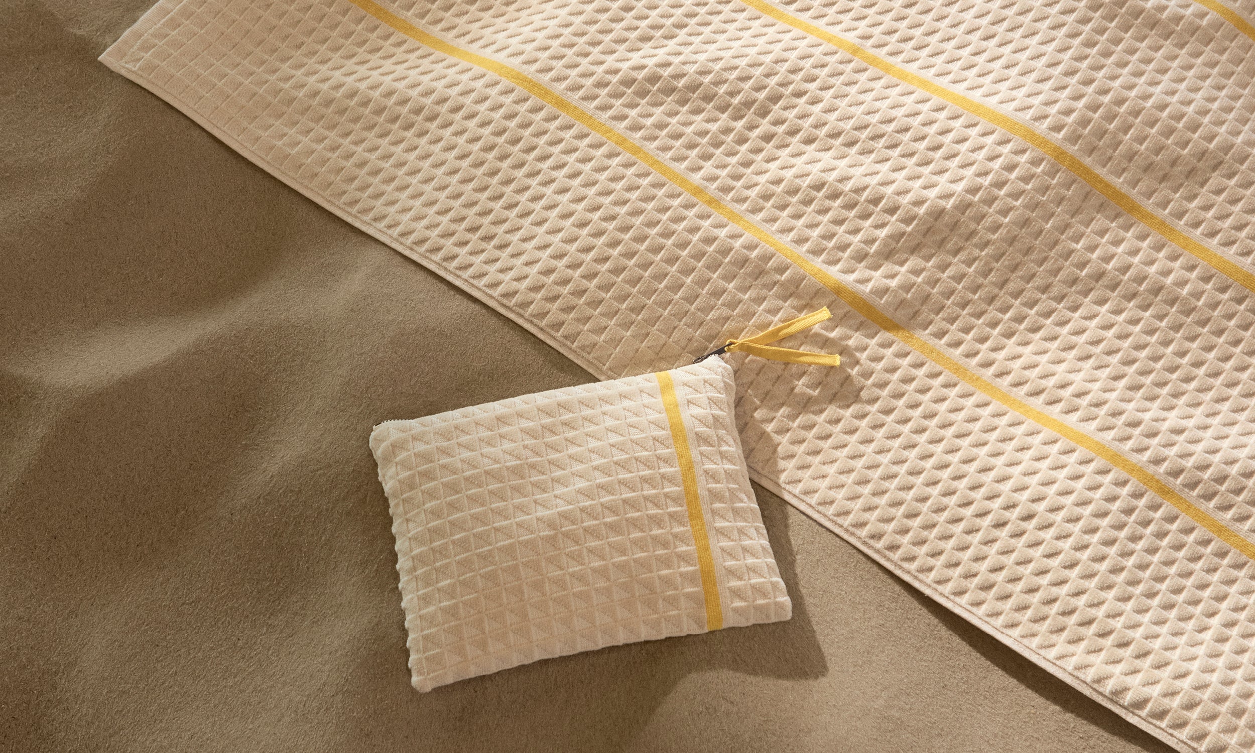 Mit Facet nutzte Jette Nevers die Jacquard-Webtechnik, um ein elegantes Schattenspiel in den zusammenhängenden Dreiecken des Musters zu erzeugen. Im Special Edition Strandtuch und in der Clutch wird die schöne Geometrie in weichem Veloursfrottee durch vertikale Teilungen mit sonnenblumengelben Streifen hervorgehoben.