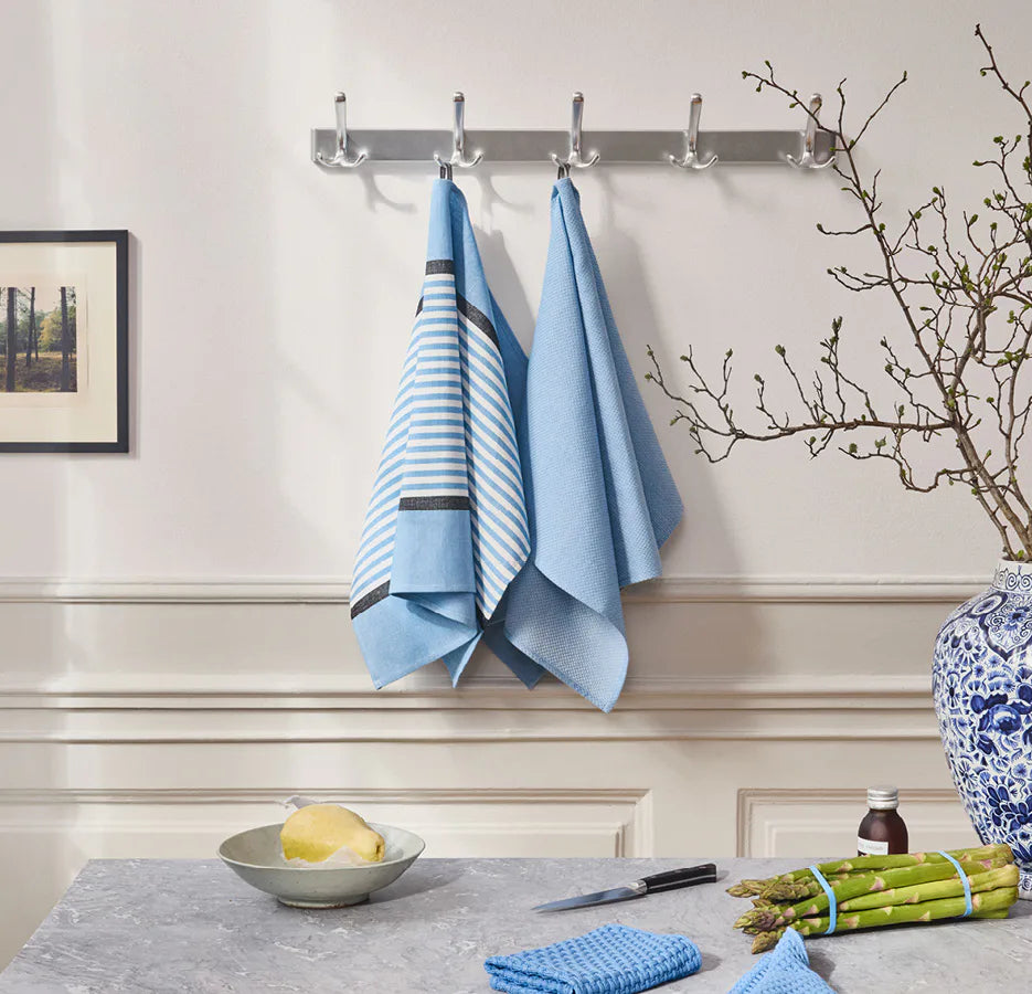Georg Jensen Damasks blå farve Bright Blue er både sofistikeret og let, retrospektiv og moderne. Den klare blå er et forfriskende pust til køkkenet og fås blandt andet på vistestykket Abild, på køkkenhåndklædet 1959 og på karkluden Nors.