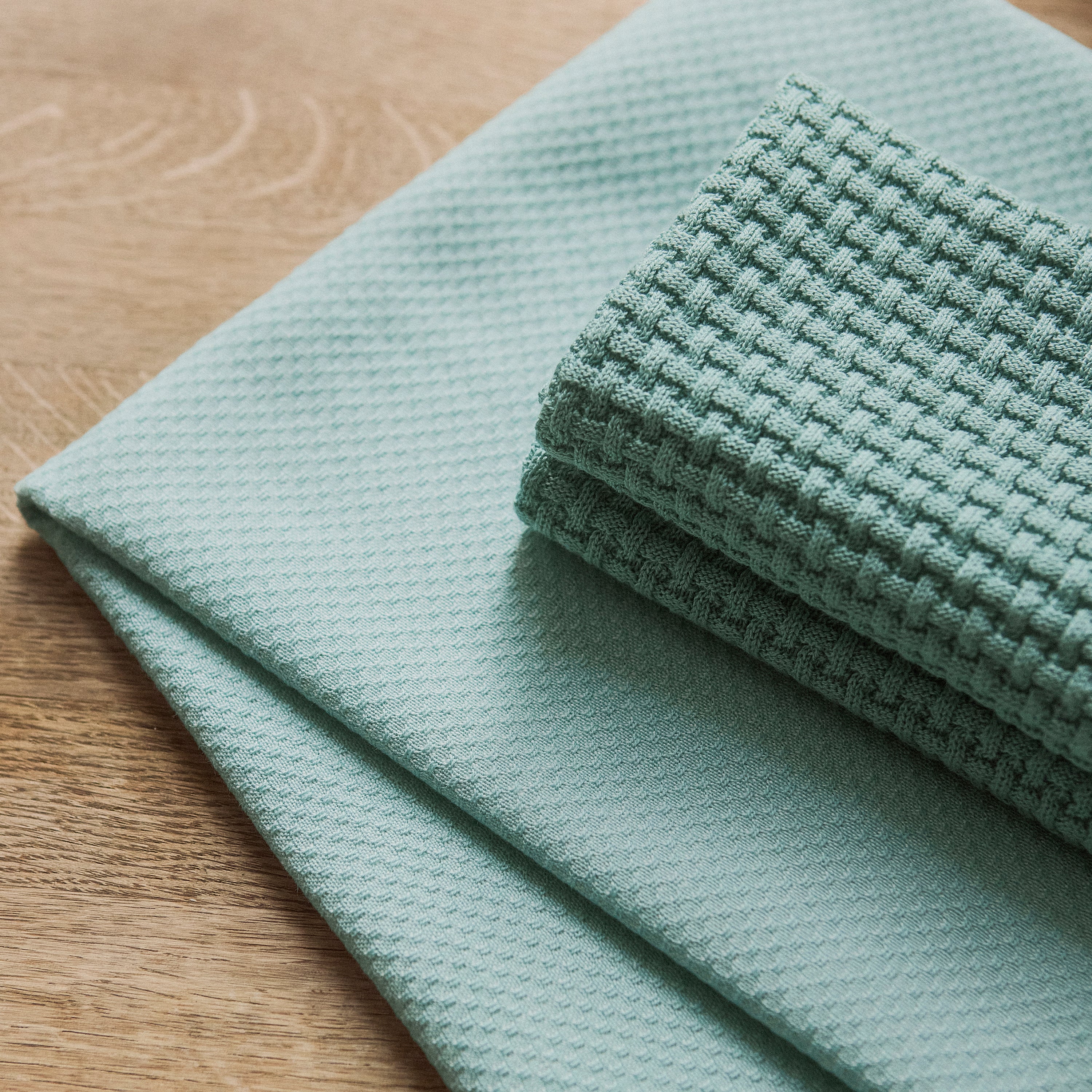 1959 er et klassisk, vævet køkkenhåndklæde i blød bomuld. Køkkenhåndklædets særlige, vaflede struktur sikrer en optimal tørreevne, og den kraftige kvalitet gør det muligt at bruge det både som håndklæde og viskestykke. Den klare, blågrønne farve, Deep Glass, er inspireret af farven på råglas.