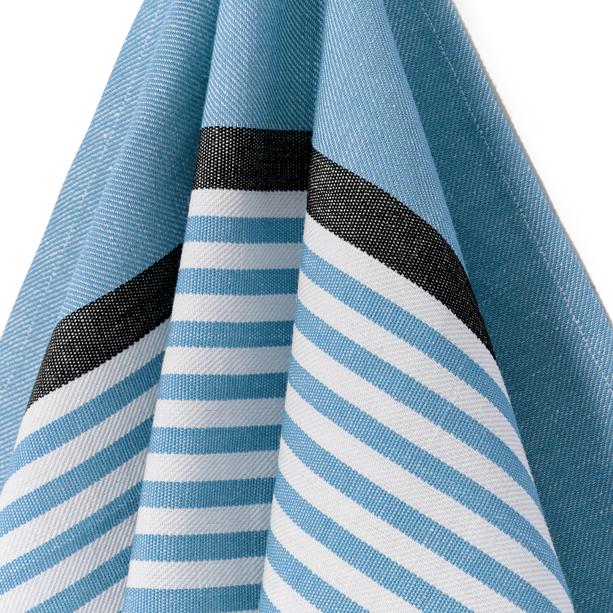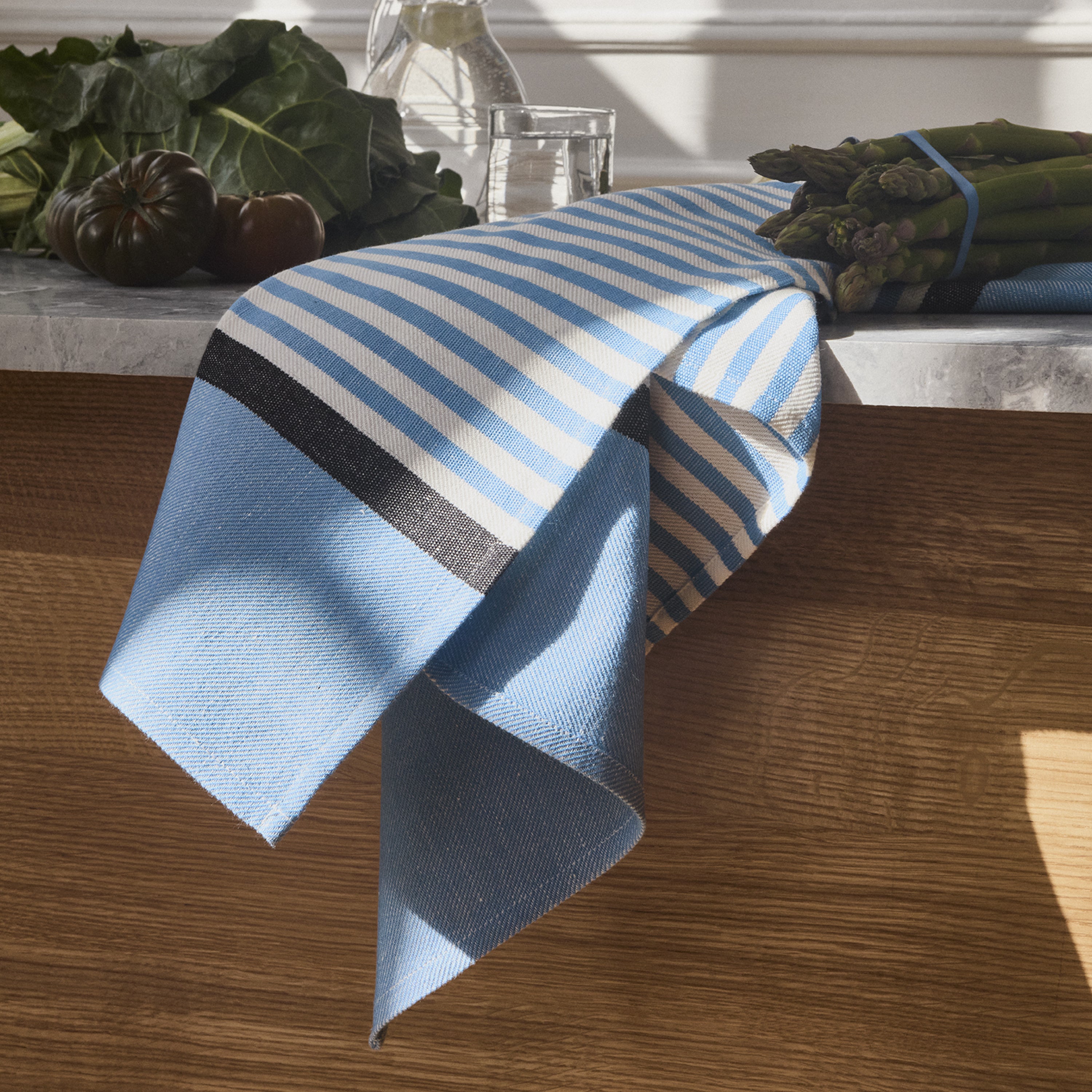 Det stribede viskestykke Abild er et velkendt design i Georg Jensen Damasks kollektion. Viskestykket er designet i 1991 af Bent Georg Jensen og vævet i en kraftig hør- og bomuldskombination, der giver optimale tørreegenskaber. Farven Bright Blue er en klar blå farve.