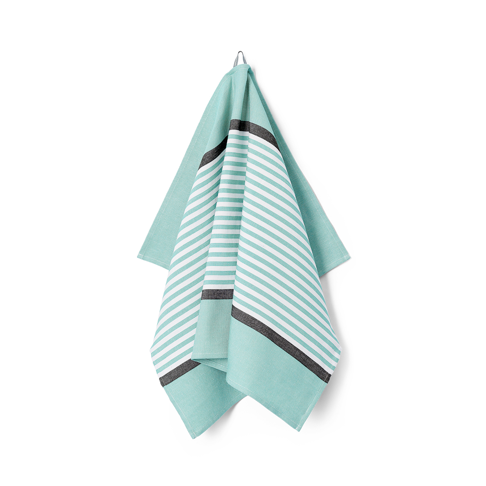 Det stribede Abild viskestykke er en klassiker i Georg Jensen Damasks kollektion. Abild er designet af væver og tekstilingeniør Bent Georg Jensen, som forener kvalitet, funktion og design på elegant vis. Viskestykket er vævet i en kombination af 50 % hør og 50 % bomuld, der giver det optimale tørreegenskaber. Den klare, blågrønne farve, Deep Glass, er inspireret af farven på råglas.