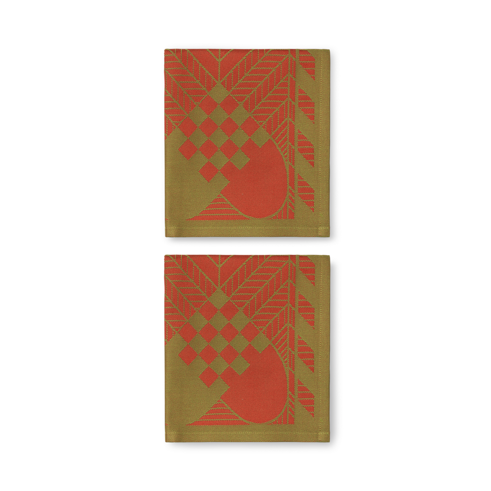 Den helt klassiske farvekombination i julerød og guld har en særlig plads i hjertet hos mange og har været i vores kollektion lige siden lanceringen i 1975. I al sin smukke enkelhed værner dækkeservietten i den oprindelige farvekombination om traditionerne. Matchende stofservietter fuldender udtrykket.