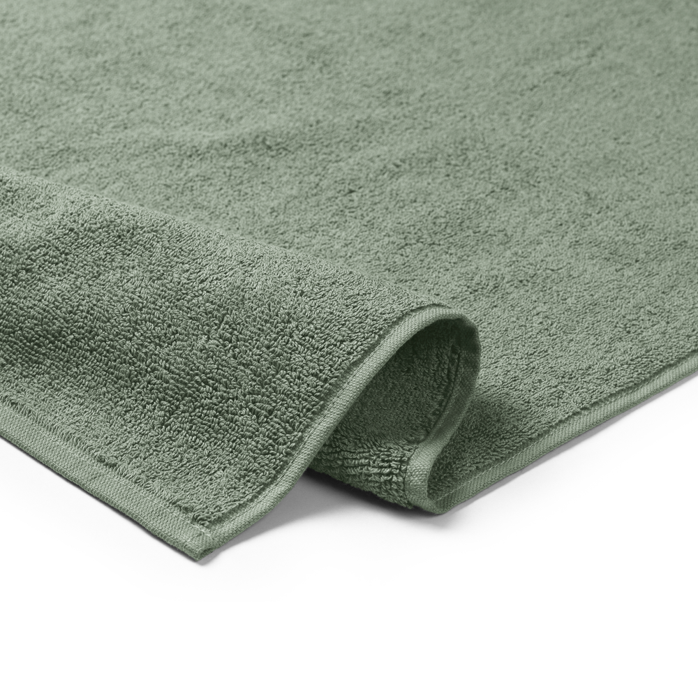 Det tykke badehåndklæde i den støvede grønne nuance Mineral Green føles både blødt og behageligt mod huden og bliver kun bedre, jo mere det bliver brugt. Farven trækker naturen ind på badeværelset