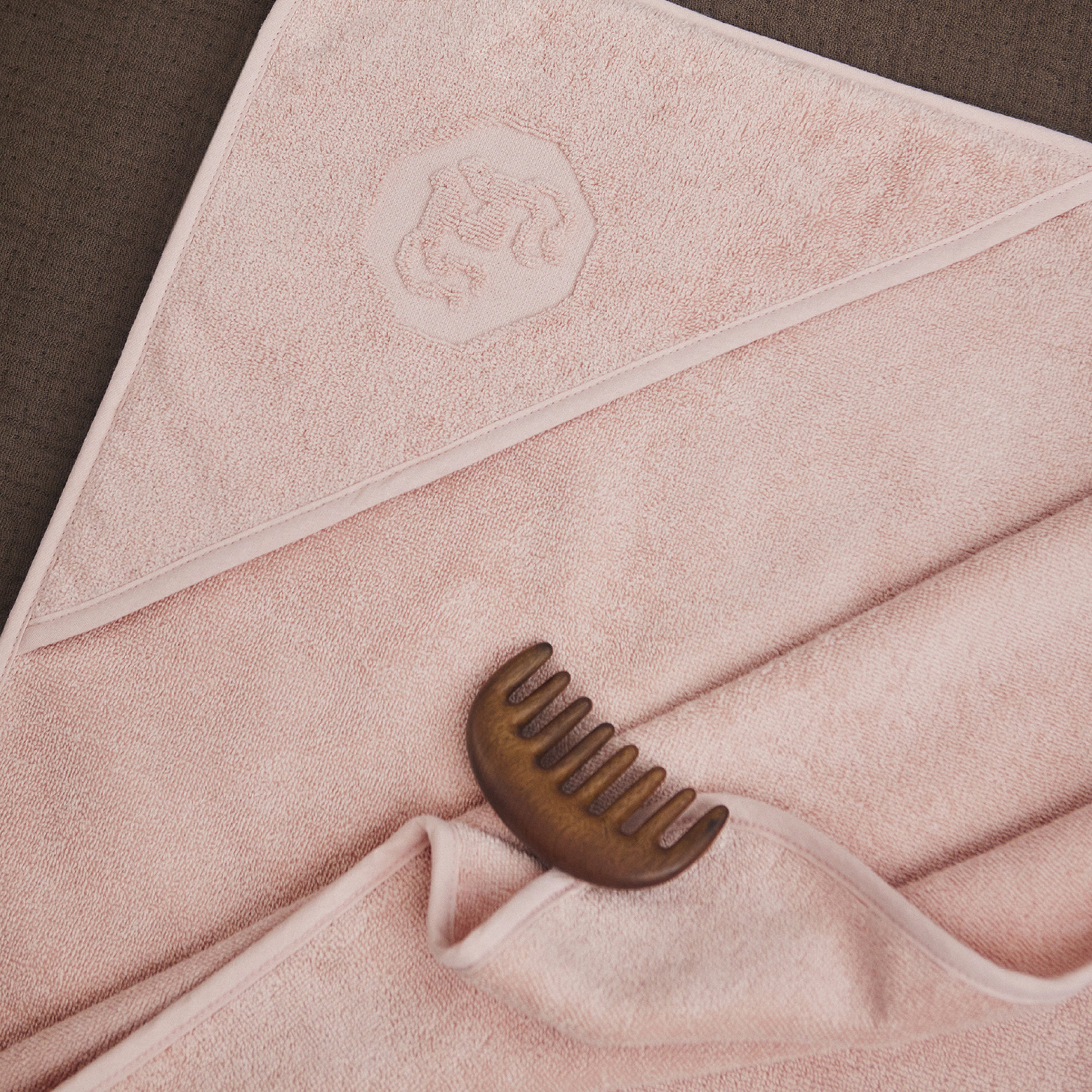 Blødt og tykt håndklæde med hætte til babyer og mindre børn. Den økologiske bomuldsfrotté svøber barnet i hverdagsluksus efter badet.