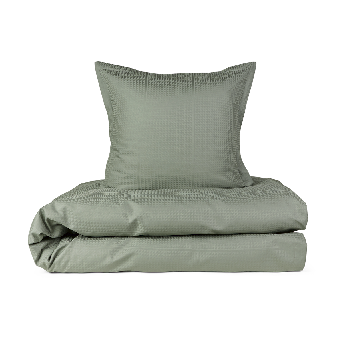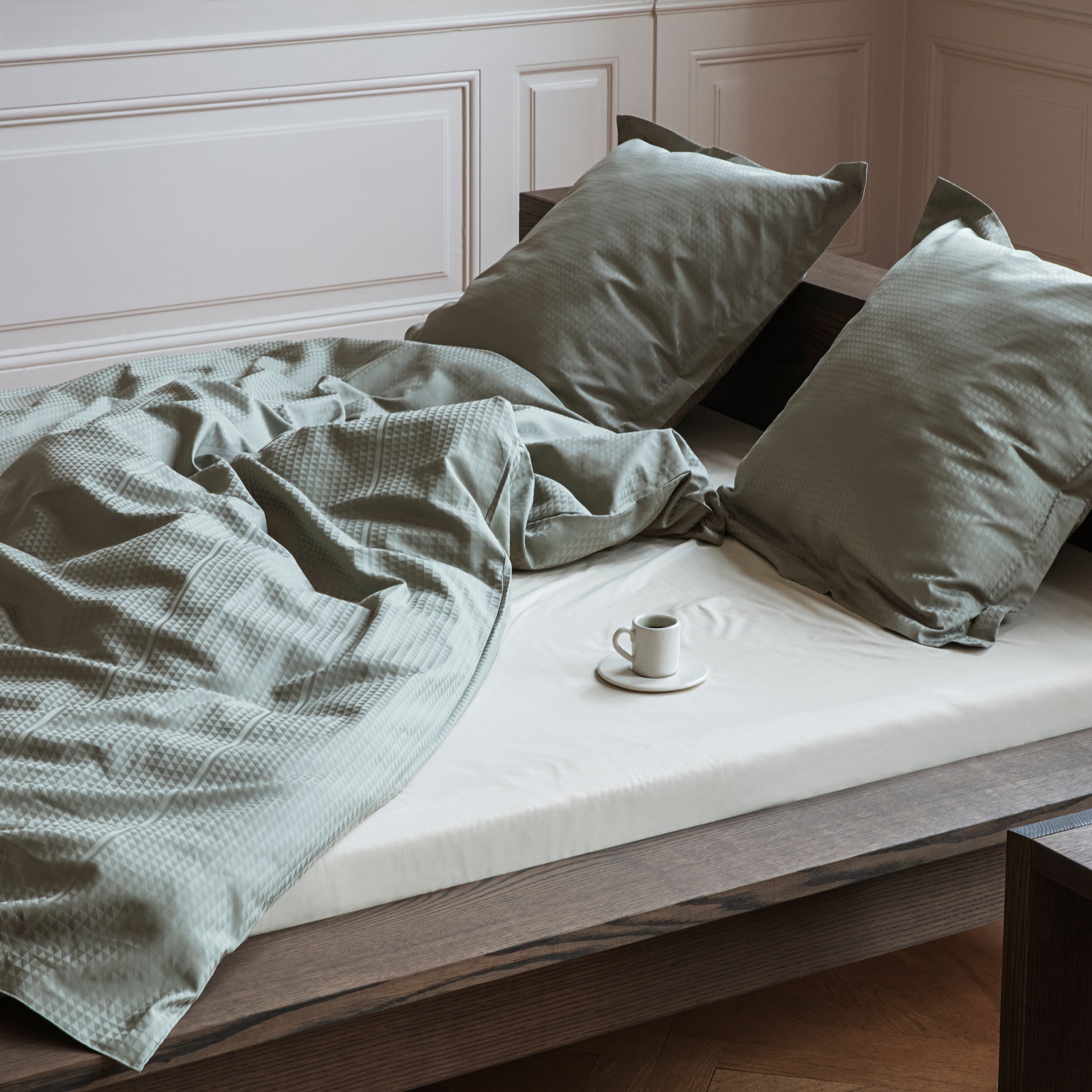 Georg Jensen Damasks Facet sengetøj har et stringent design og er damaskvævet i 100 % kæmmet bomuld, som giver en blød og glat overflade. Med Facet designet benytter tekstilkunstner Jette Nevers den klassiske damaskvævning til at skabe et elegant skyggespil, der smukt fremhæves i den mørkegrønne farve Mineral Green.