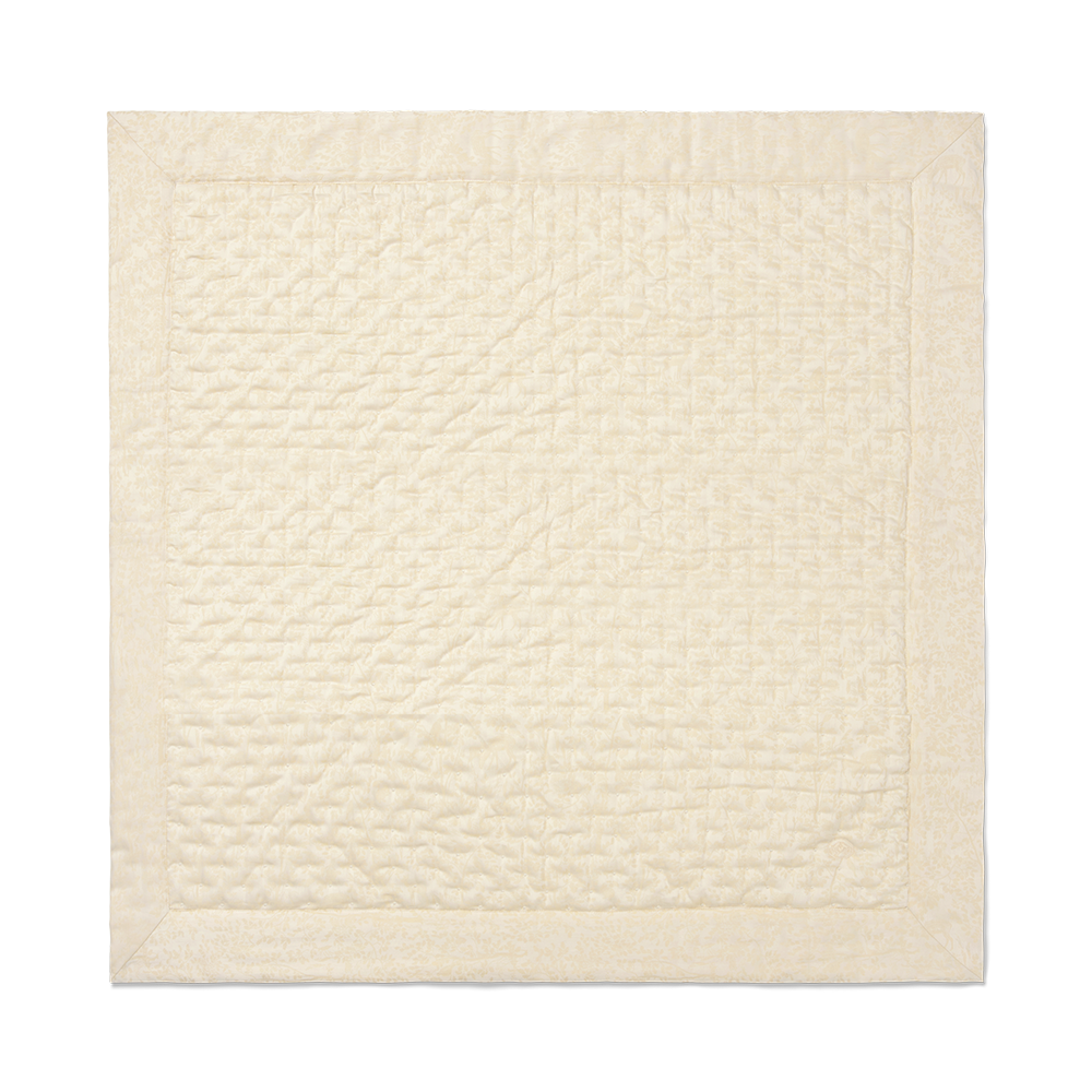 Det quiltede tæppe i farven Misty Yellow er en del af den jacquardvævede kollektion Forest, hvor et mønster af nyudsprungne træer, dådyr og kaniner er vævet ind i tekstilet. Tæppet er i økologisk bomuld.