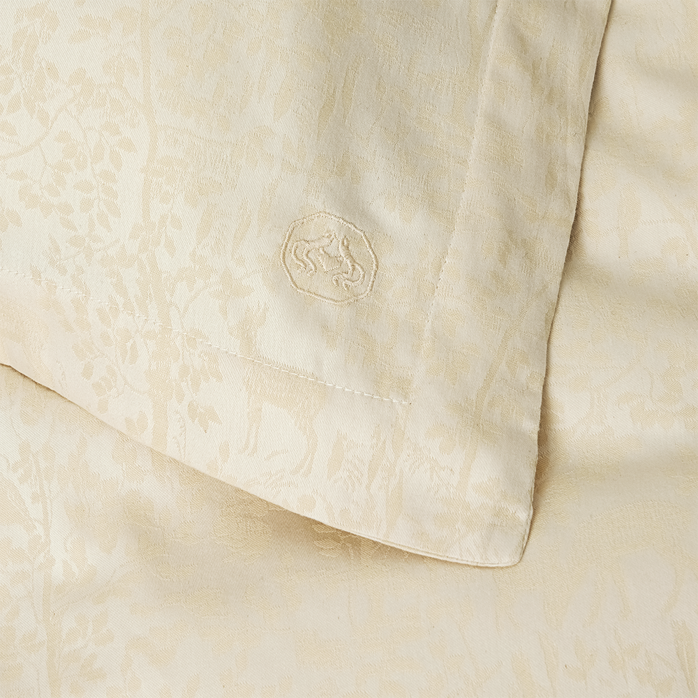 Sengesæt fra kollektionen Forest i økologisk bomuld i den lysegule farve Misty Yellow. Motivet på Forest kollektionen er hentet fra en gobelin fra 1800-tallet fundet i Georg Jensen Damasks arkiver.