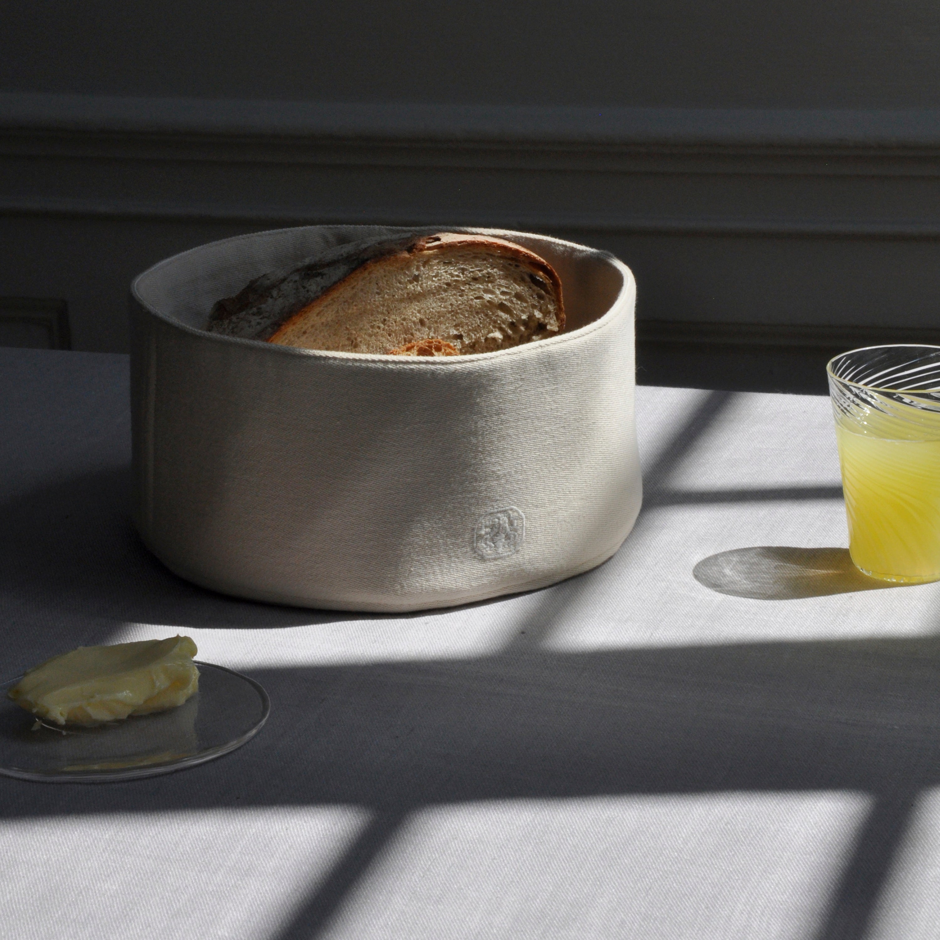 Plain-brødkurv er syet af satinvævet overskudstekstil fra Georg Jensen Damask produktion, hvilket giver god mening i en verden af i dag. Tekstilet er i 100 % bomuld og designet er skabt, så det holder i årtier. Brødkurven er en del af en lille kollektion af accessories i tekstiler til køkkenet, hvor du desuden finder kaffehætte, tehætte, grydelapper og forklæder