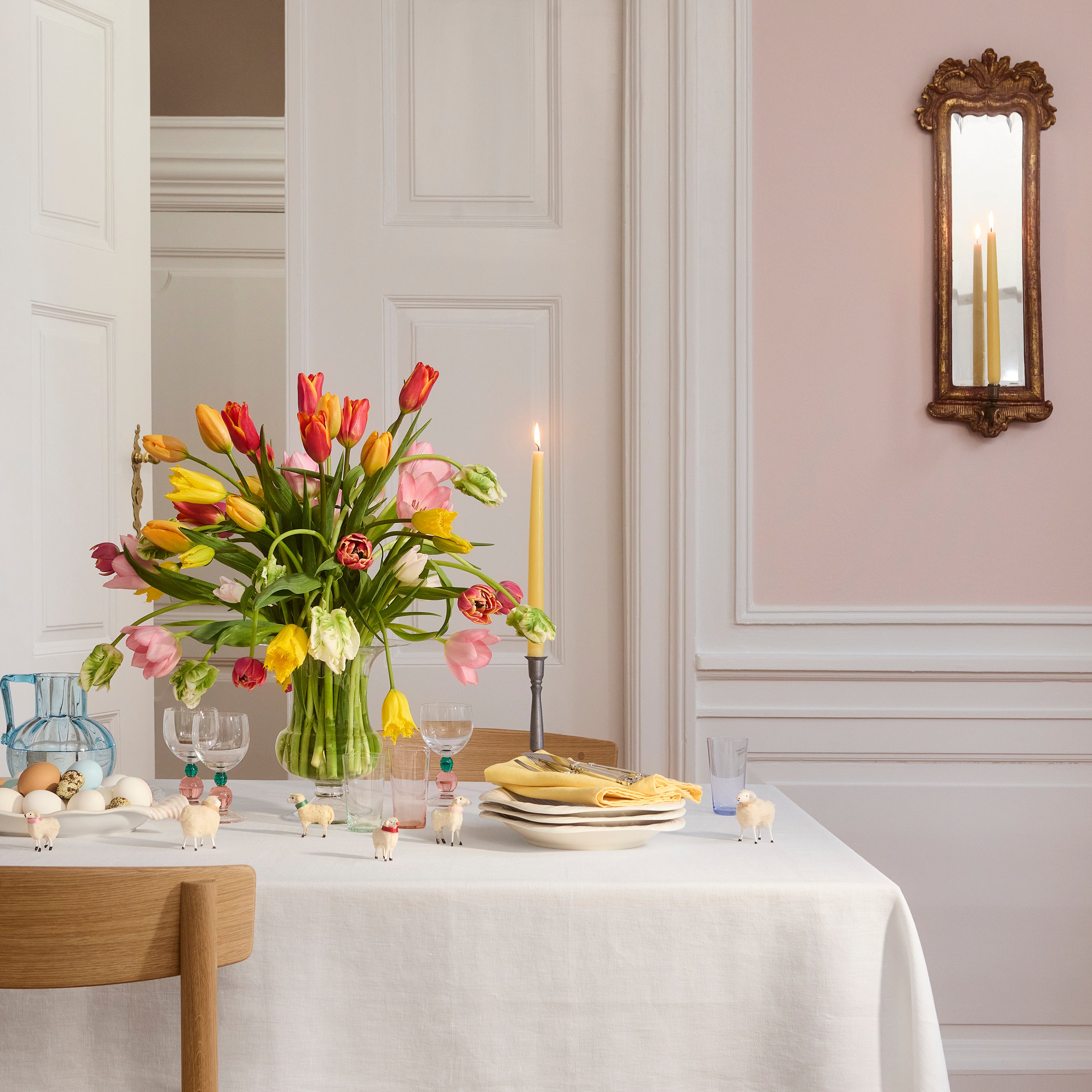 Som materiale er hør blødt og tungt, men først og fremmest luksuriøst. Dugen er smuk, selvom den ikke er nystrøget. Det gør det oplagt at variere og lege med udtrykket i opdækningen. Hørservietter i grå eller hvid med broderet logo fuldender udtrykket.