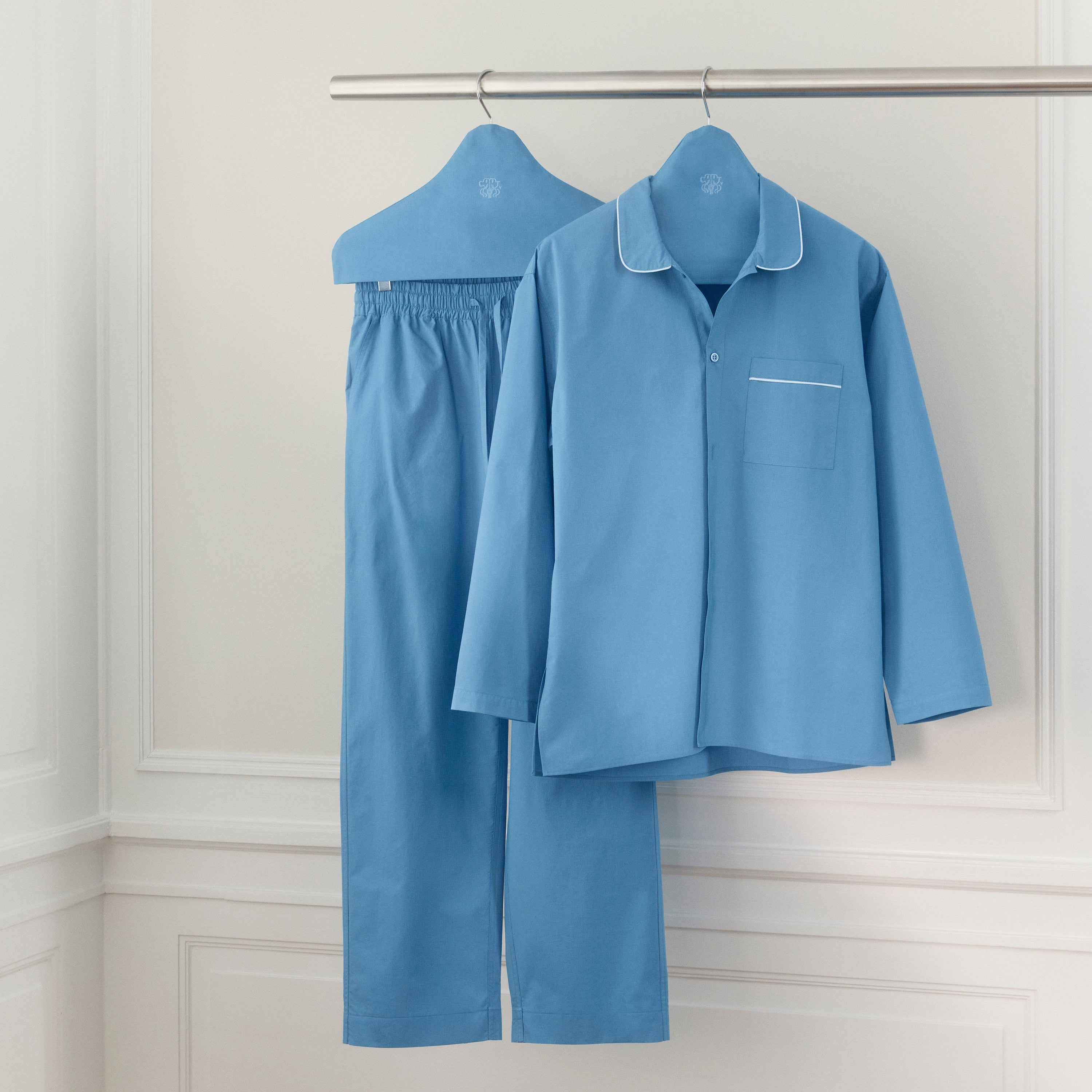Unisex pyjamas percalevævet i supimabomuld. Pyjamassen har et klassisk snit og elegante, hvide pipings. Bright Blue er en mættet nuance af blå med referencer til den klare sommerhimmel.
