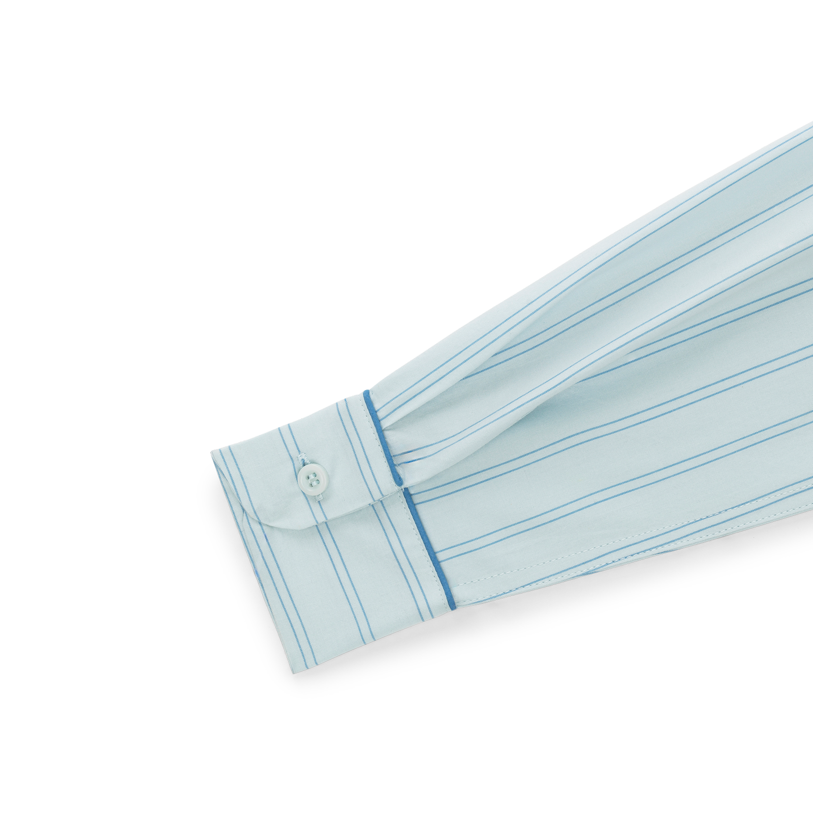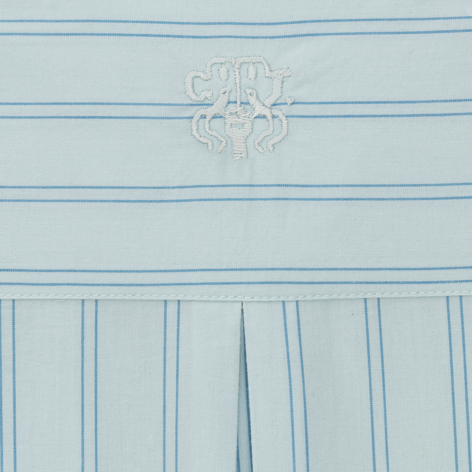 Skjortekjole til børn percalevævet i supimabomuld. Skjortekjolen har et klassisk snit, elegante pipings og slanke nålestriber i Bright Blue med en baggrund i farven Minimal Blue - en helt let variant af lyseblå med et strejf af aqua.