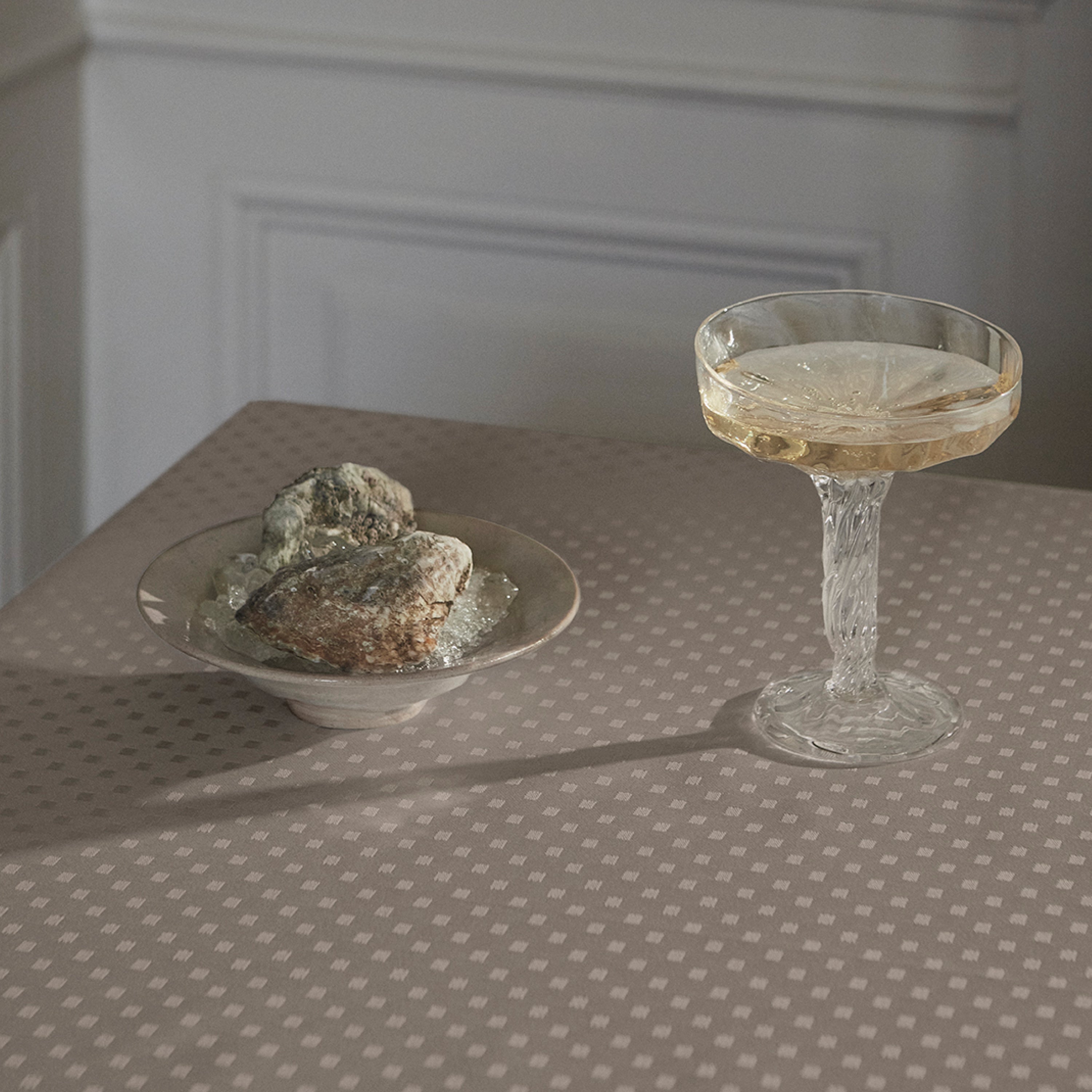 Klassisk damaskvævet dug med et helt enkelt mønster af stiliserede snefnug. Fortolkningen af snefnuggets geometri er så enkelt, at dugen også kan benyttes på andre tider af året, hvor den med sit eksklusive udtryk løfter borddækningen.