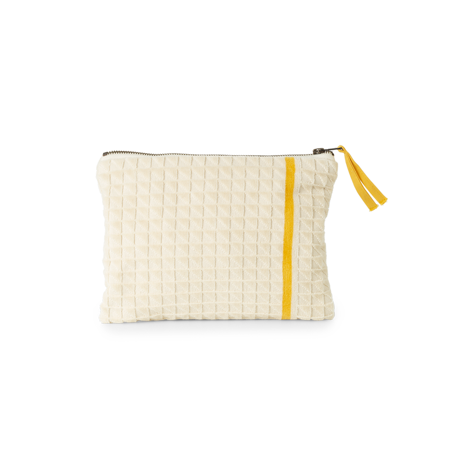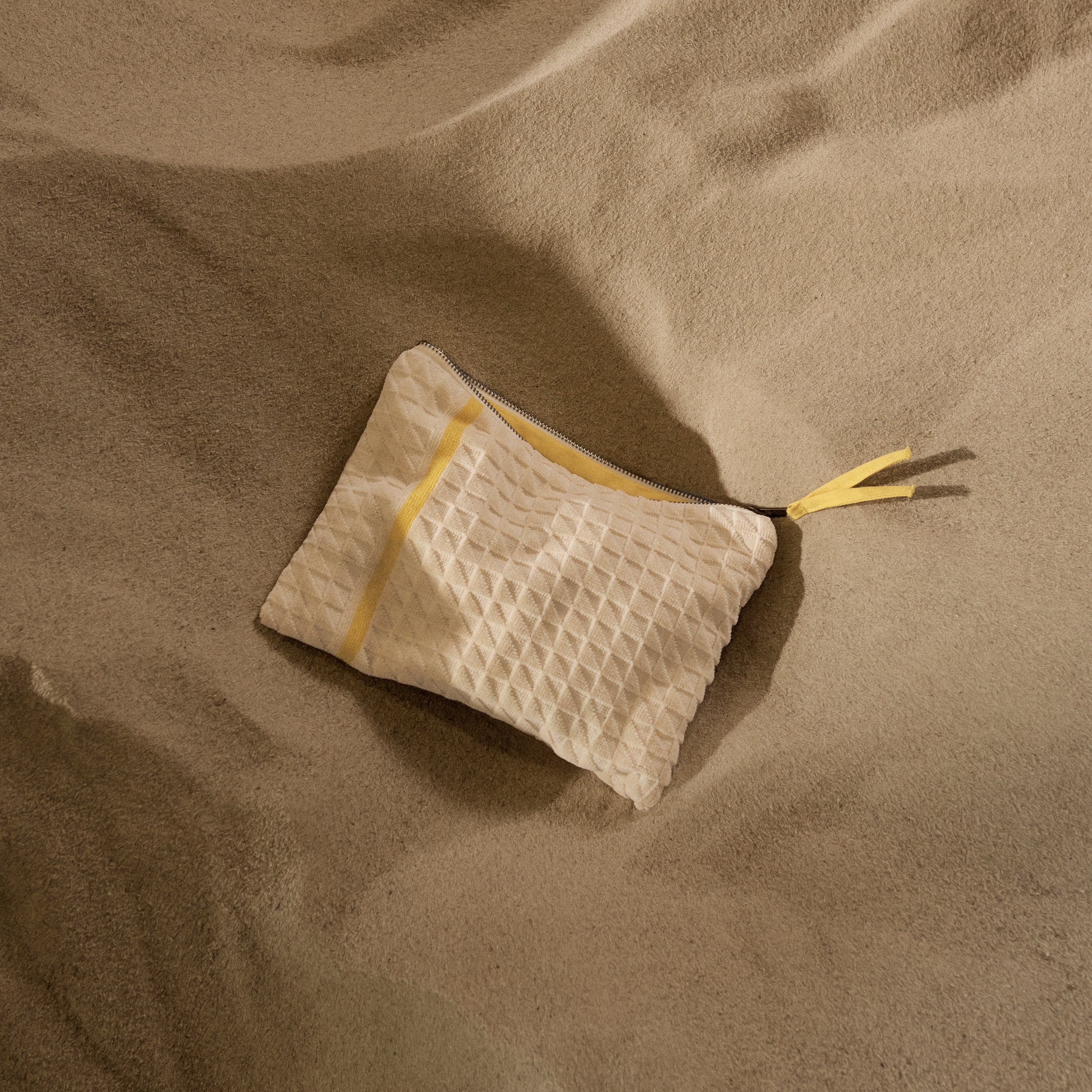 Strandhåndklædet og clutchen er jacquardvævet i dobbelttvundet, kæmmet bomuld, som giver en særlig blød og glat overflade. Sandfarven er inspireret af klassiske sandstensfacader og varme strande.