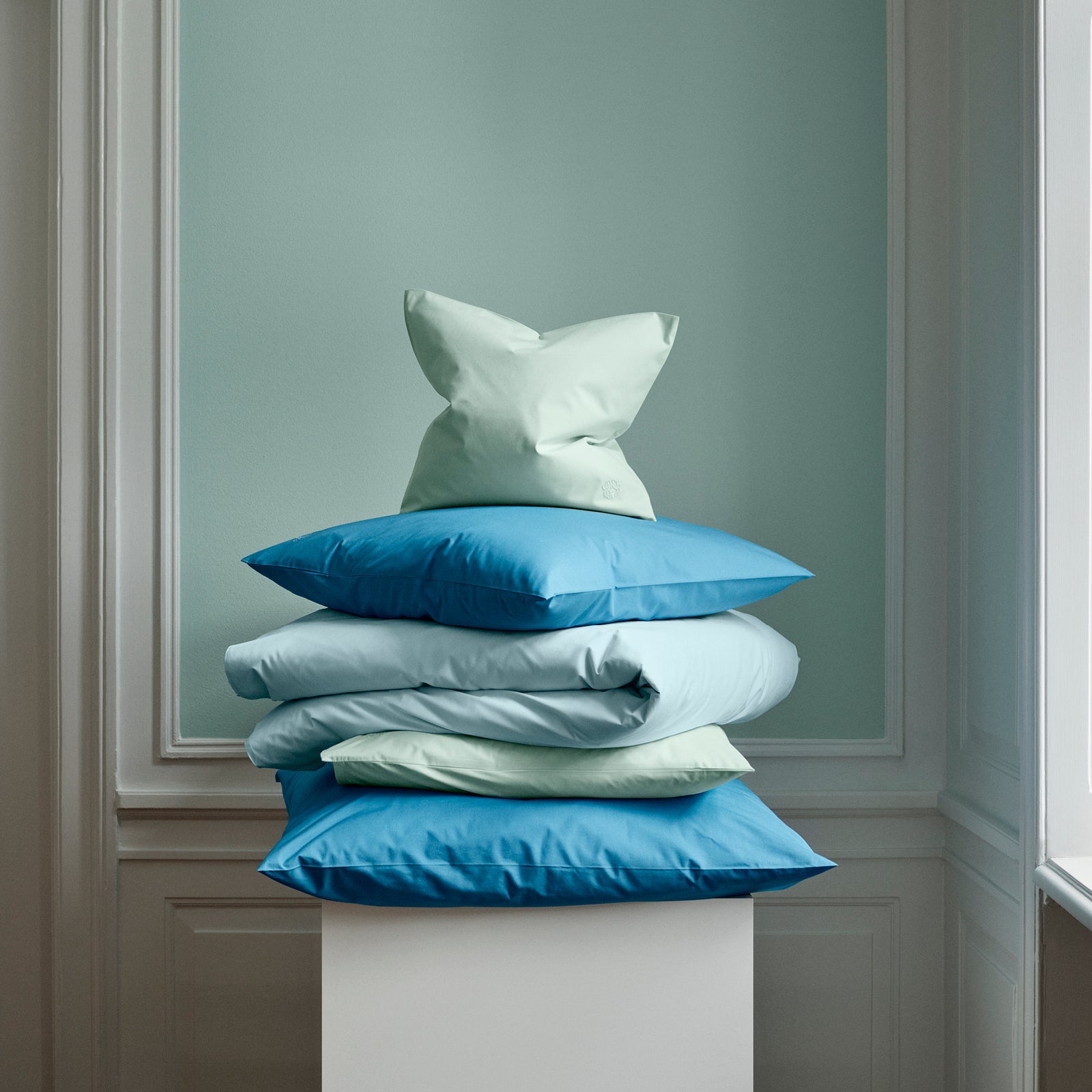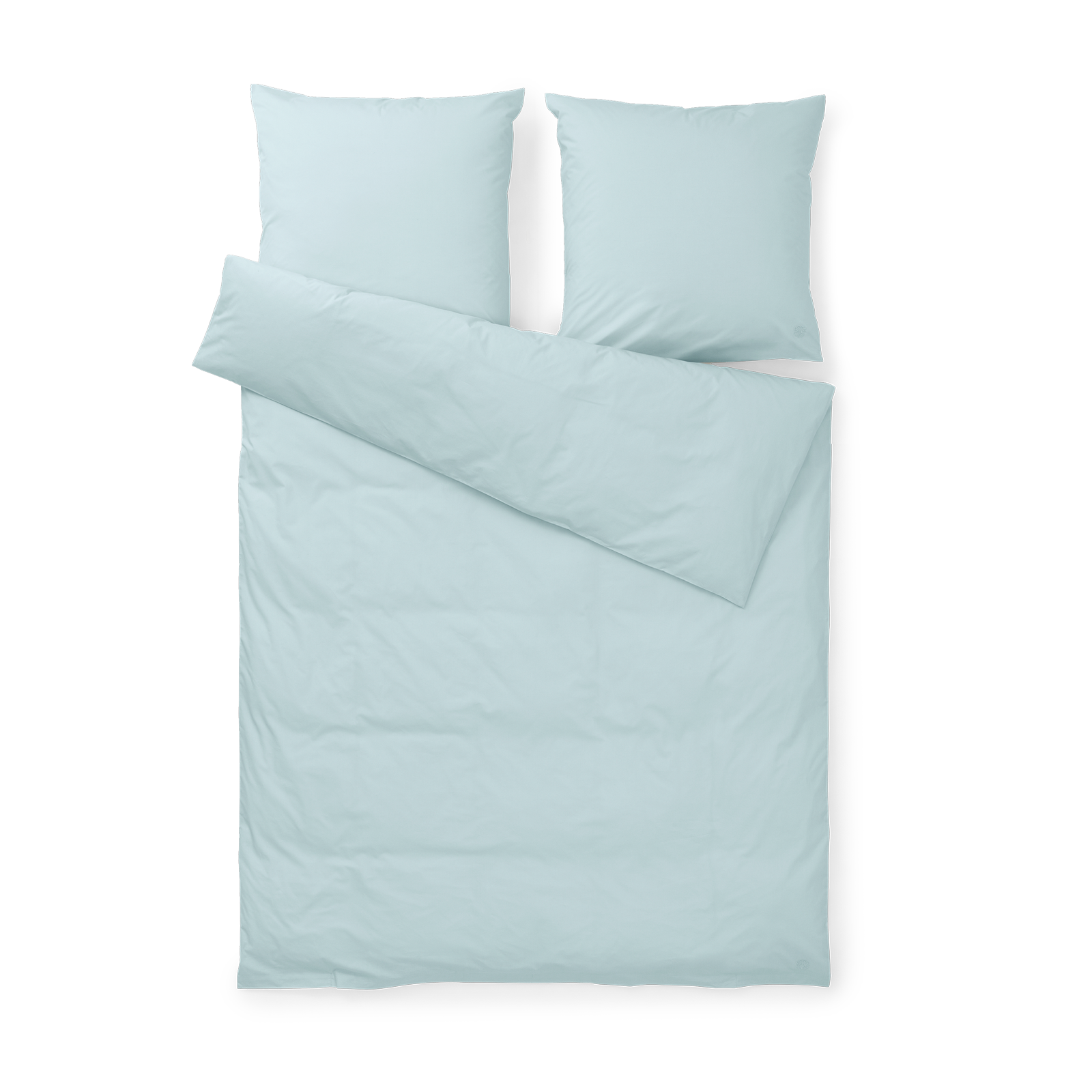 Dynebetrækket lukkes med bændler og hovedpudebetrækkene har kuvertlukning. Sengesættet bærer Georg Jensen Damasks ikoniske logo som et diskret broderi. Minimal Blue er en helt let variant af lyseblå med et strejf af aquanuancer.