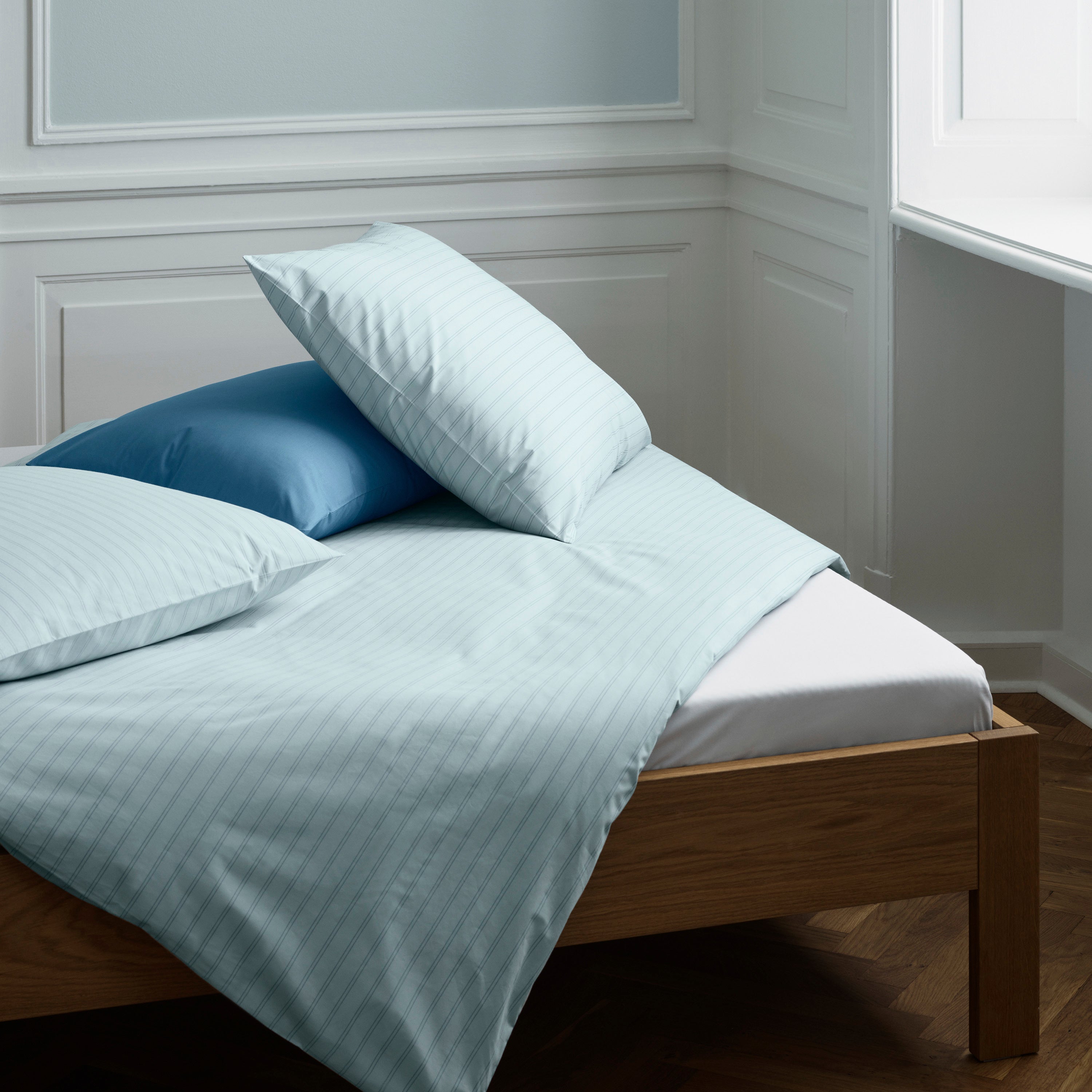 Supima Pinstripe sengesættet har slanke nålestriber i Bright Blue med en baggrund i farven Minimal Blue – en helt let variant af lyseblå med et strejf af aqua.