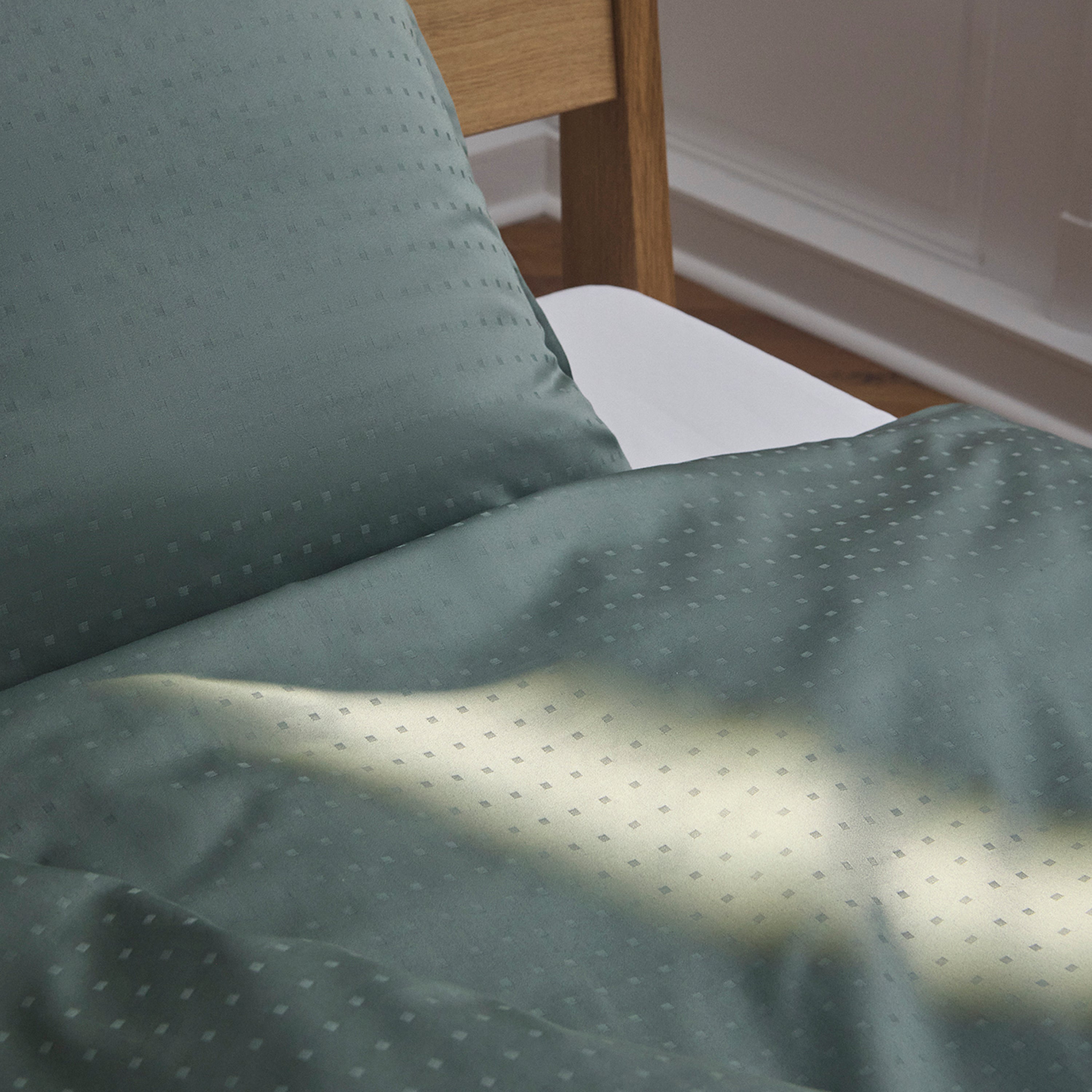 2 Bettwäsche‑Sets aus weichem und glänzendem Stoff mit geometrischem Muster. Das klare Design mit kleinen Würfeln kommt in der reflektierenden Satinbindung besonders schön zur Geltung und verleiht der Light Bettwäsche einen leichten und harmonischen Ausdruck. Light ist Oeko‑Tex®‑zertifiziert und aus 100 % langstapeliger Baumwolle gewebt, was sie besonders strapazierfähig macht. Die Farbe Dusty Green ist ein gedämpftes Grün.