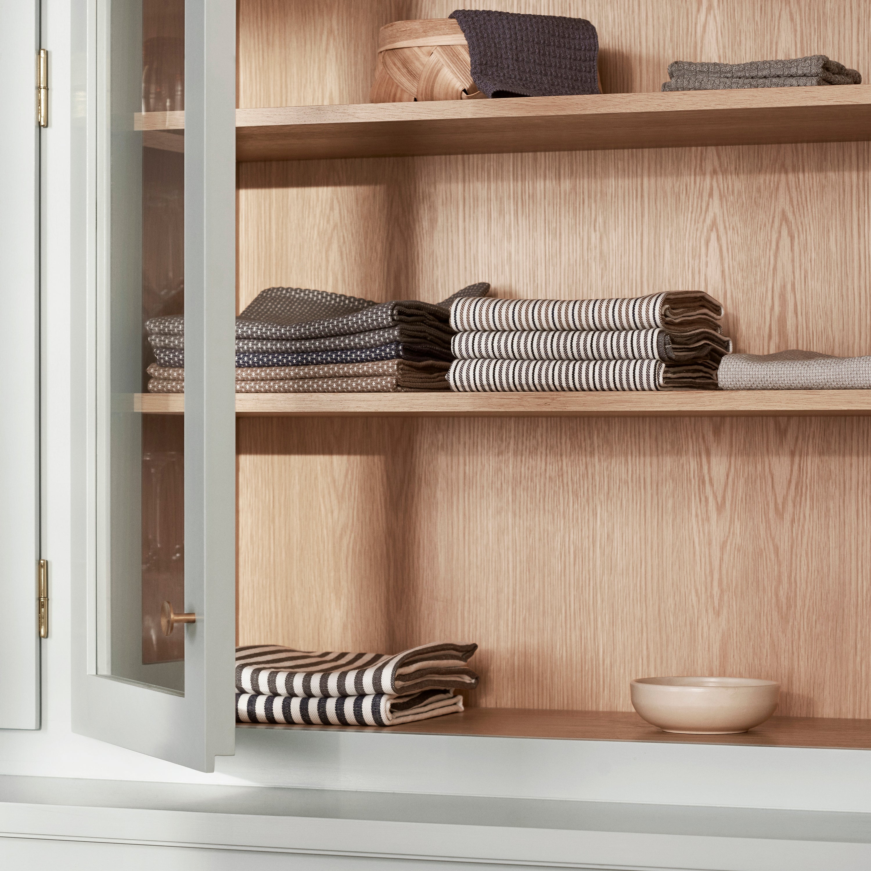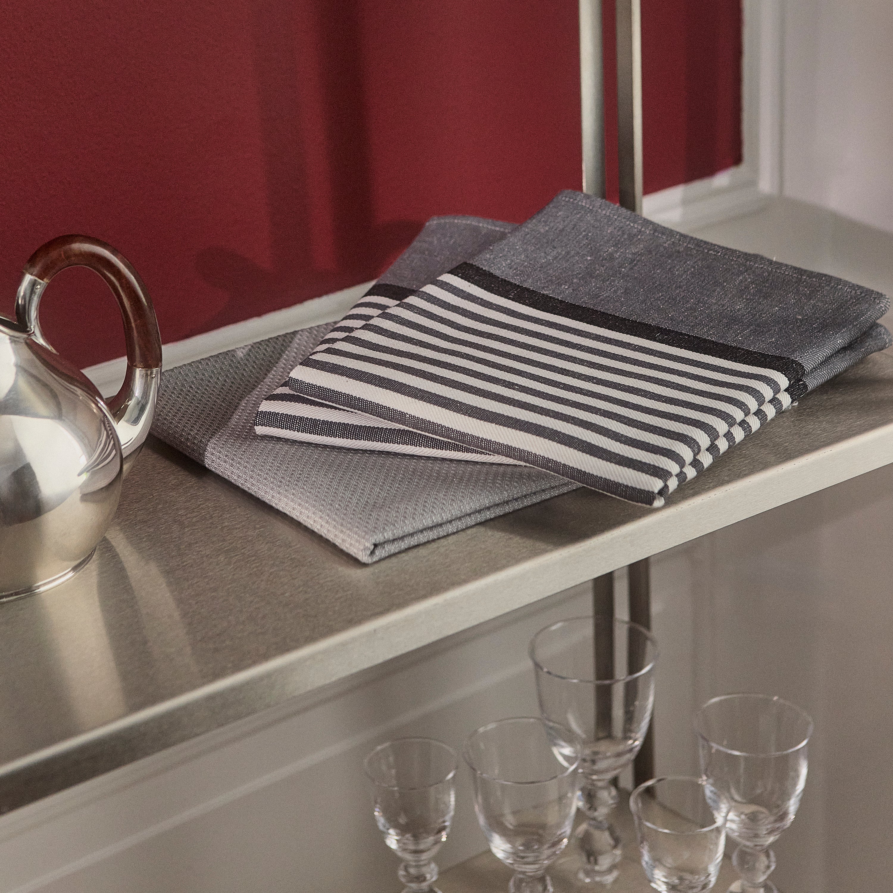 Klassisches Geschirrtuch mit harmonischen Streifen als tragendes Designelement. Gewebt in einem kräftigen Leinen-/Baumwollgemisch, das für optimale Trockeneigenschaften sorgt.