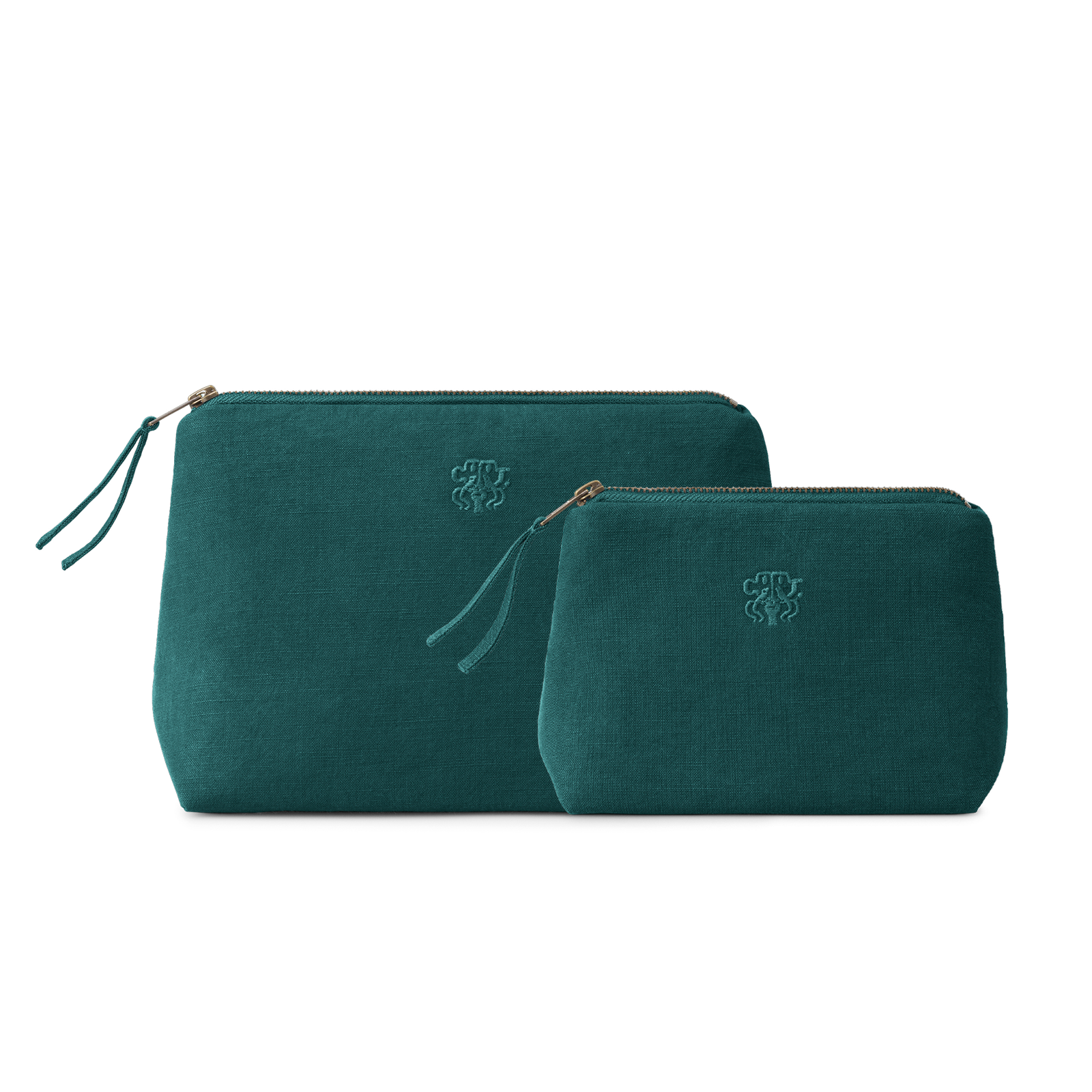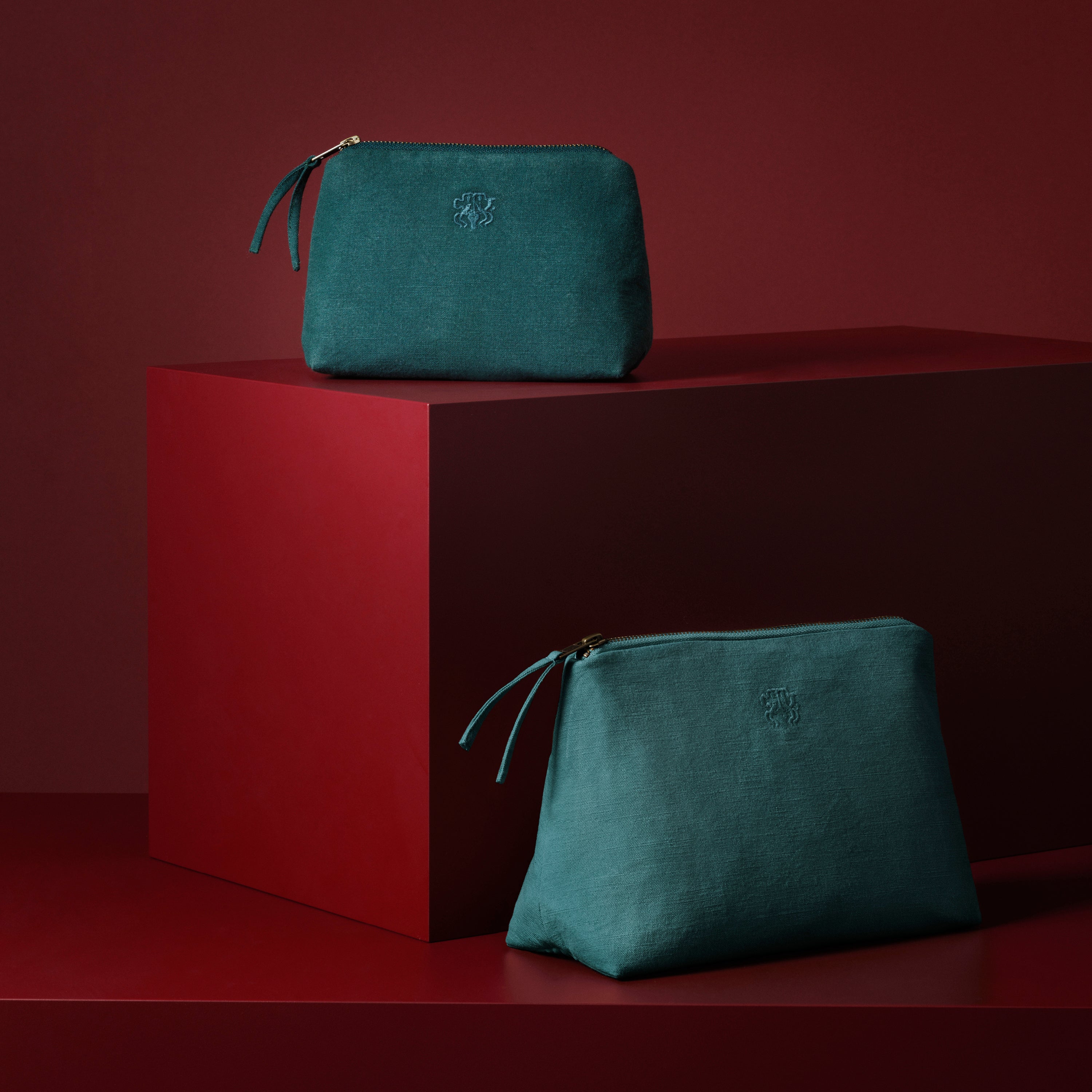 All Kulturbeutel und Kosmetiktasche in der Farbe Evergreen – ein ganz dunkles und kühles Grün. Der funktionale und geräumige Kulturbeutel und die Kosmetiktasche sind aus 100 % Baumwolle im Canvas-Gewebe gefertigt, mit einer Innentasche und dem Georg Jensen Damask Logo als elegantes Stickdetail.
