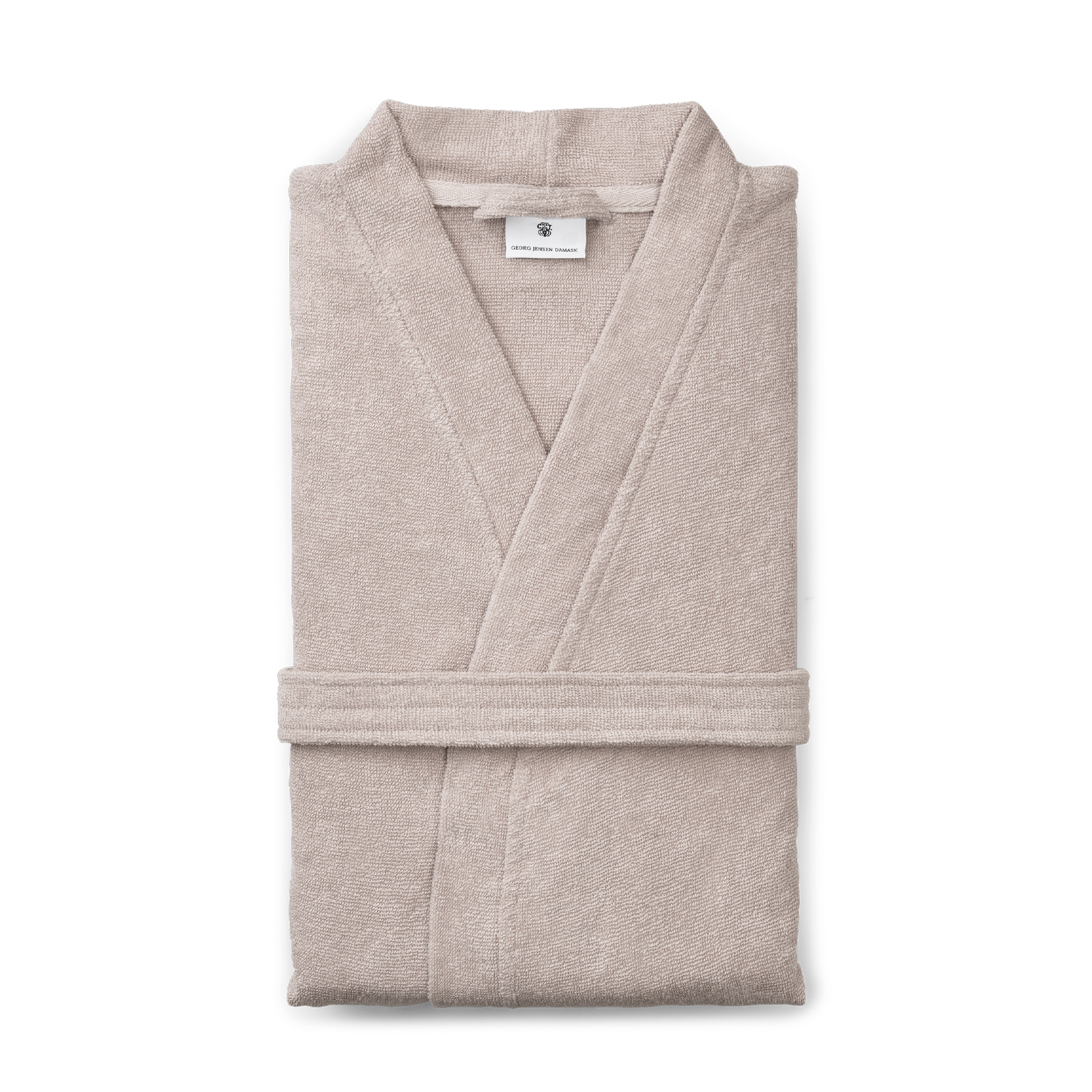Frottébademantel im klassischen Design mit Kimono‑Kragen, Taschen, Bindegürtel in der Taille und innenliegenden Nähten mit Einfassband. Der Terry‑Bademantel ist unisex und aus 100 % Baumwolle mit Schlingen aus doppelt gezwirnten und gekämmten Garnen gewebt, was eine schöne und glänzende Oberfläche verleiht.