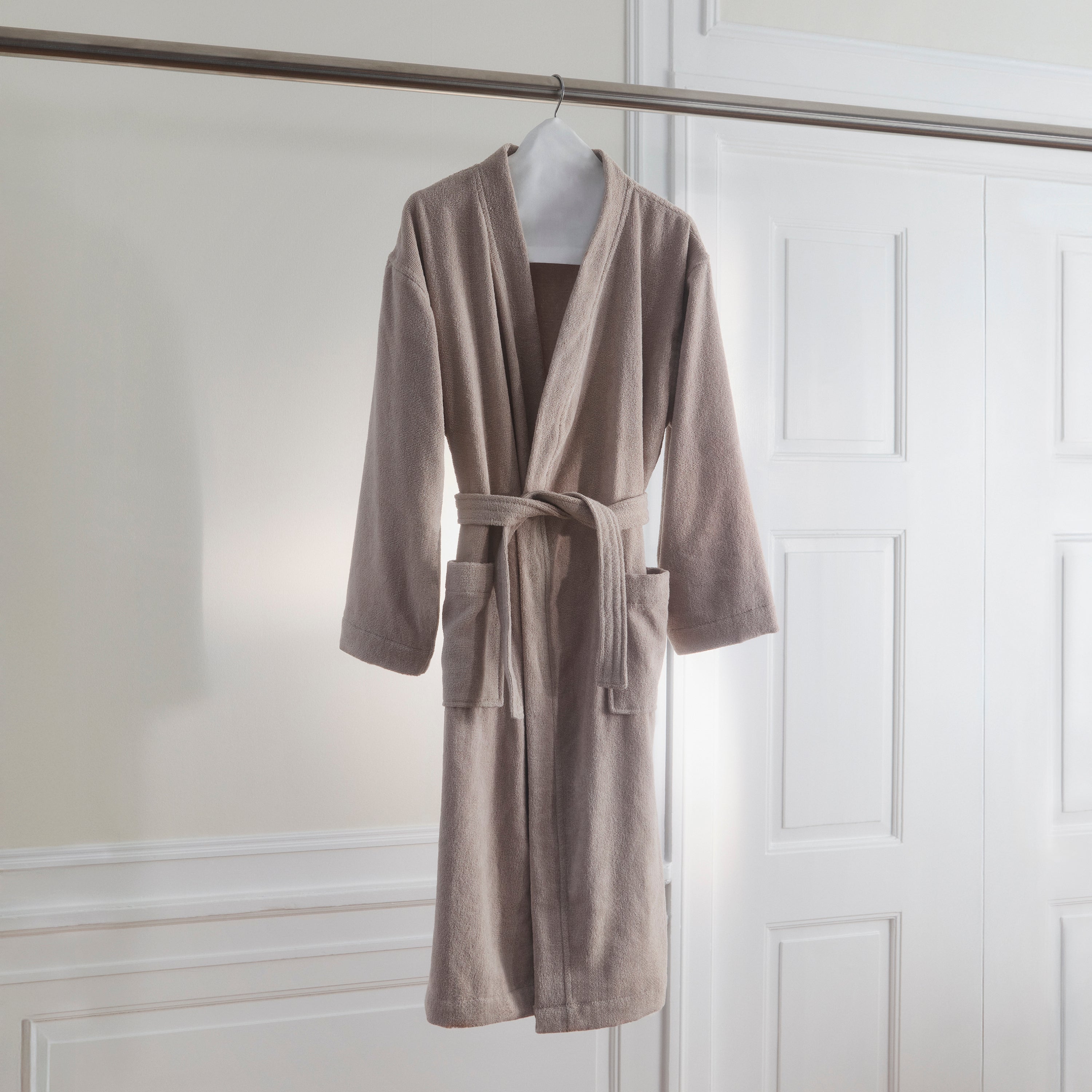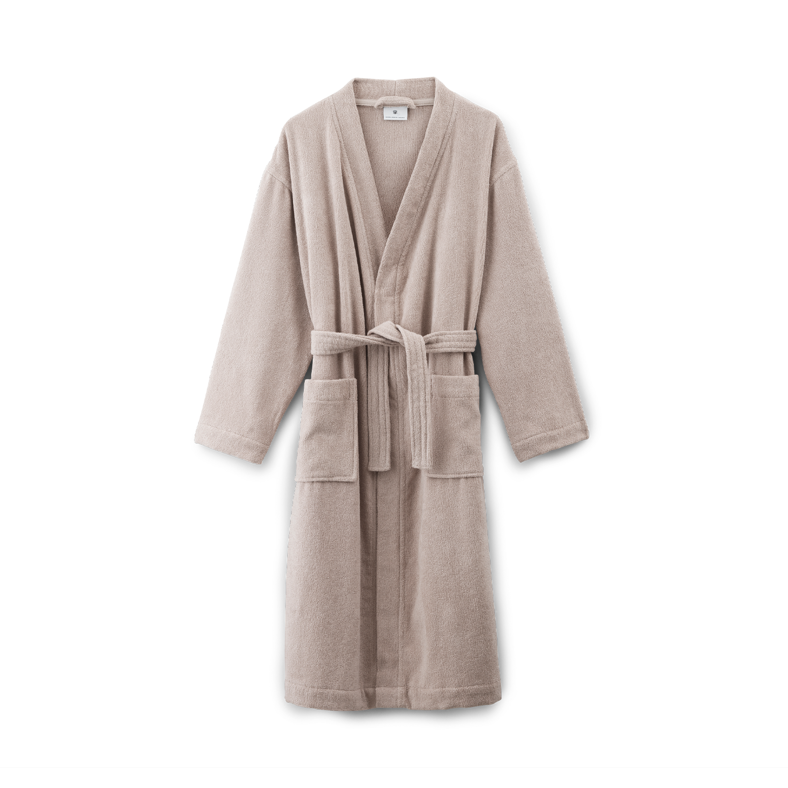 Frottébademantel im klassischen Design mit Kimono‑Kragen, Taschen, Bindegürtel in der Taille und innenliegenden Nähten mit Einfassband. Der Terry‑Bademantel ist unisex und aus 100 % Baumwolle mit Schlingen aus doppelt gezwirnten und gekämmten Garnen gewebt, was eine schöne und glänzende Oberfläche verleiht.