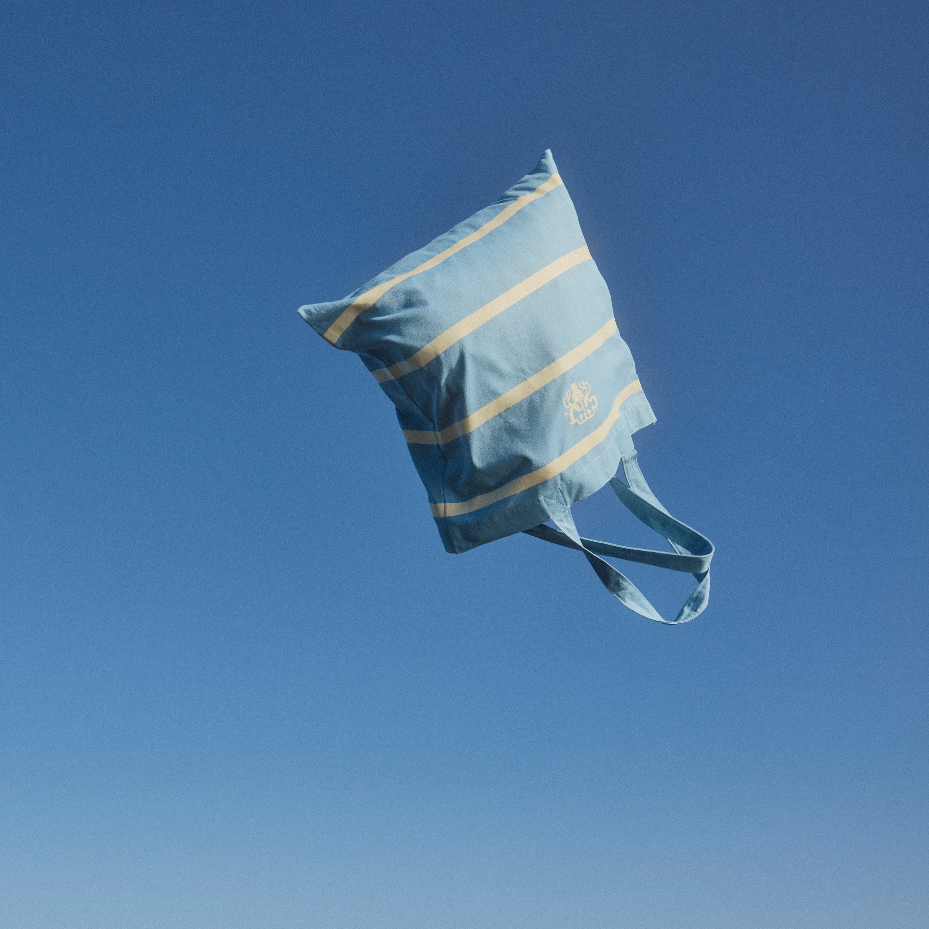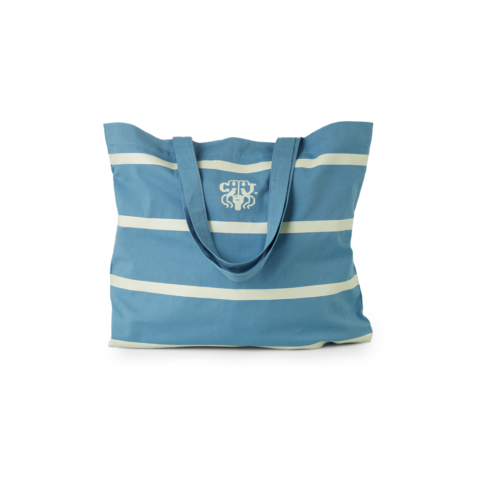 Eine gestreifte Canvas-Tasche in frischen, sommerlichen Farben. Diese geräumige Tasche ist aus 100 % Baumwolle gewebt und eignet sich perfekt für einen Ausflug an den Strand. Bei der Farbe Blue Sky handelt es sich um eine hellblaue Farbe mit sandfarbenen Streifen.