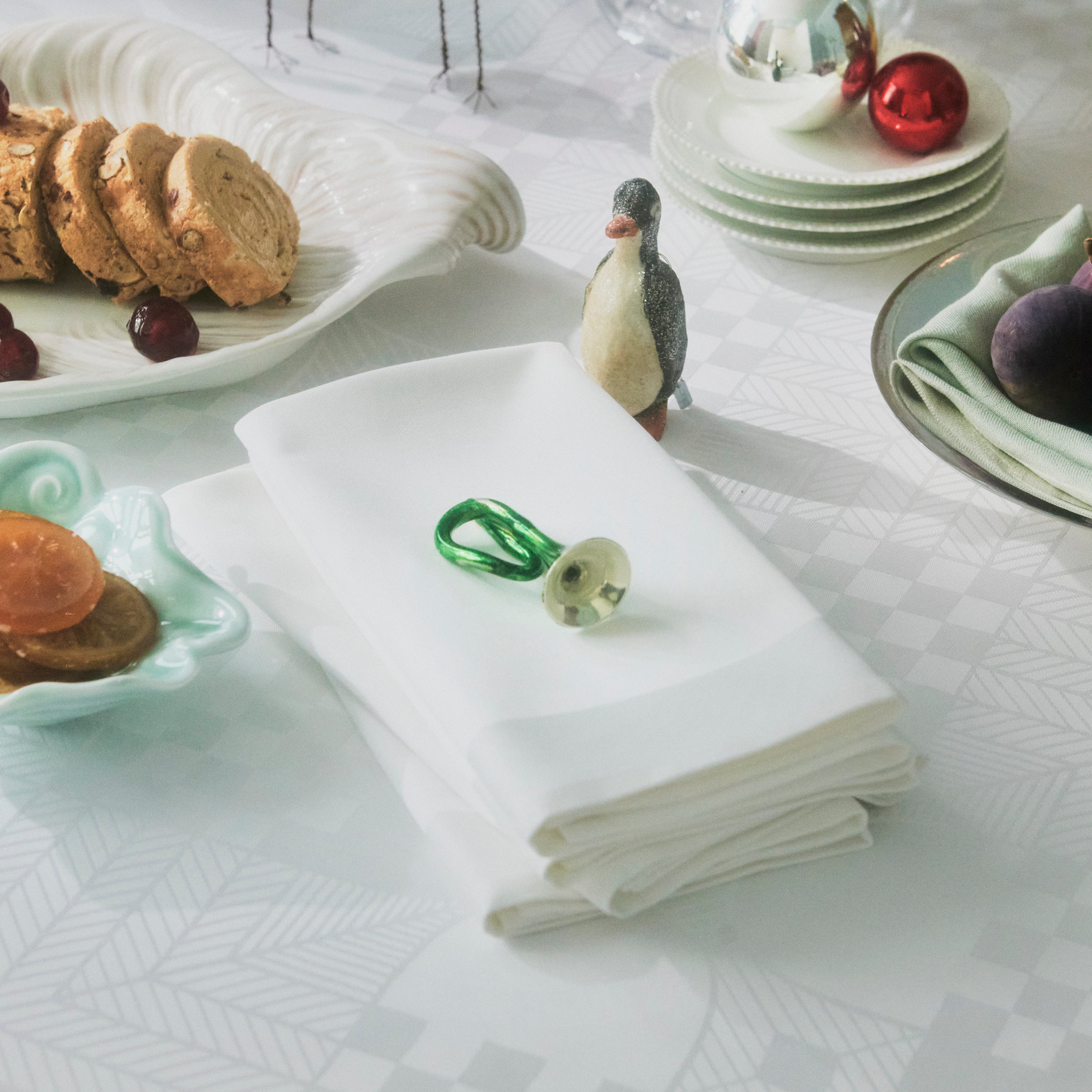 Die weiße Stoffserviette harmoniert mit allen Designs und Stilarten. In der Damastkollektion können darüber hinaus drei klassische Designs erwähnt werden, die allesamt weiße Tischdecken bieten: Die Designs Arne Jacobsen, Nanna Ditzel und Schneeflocke.