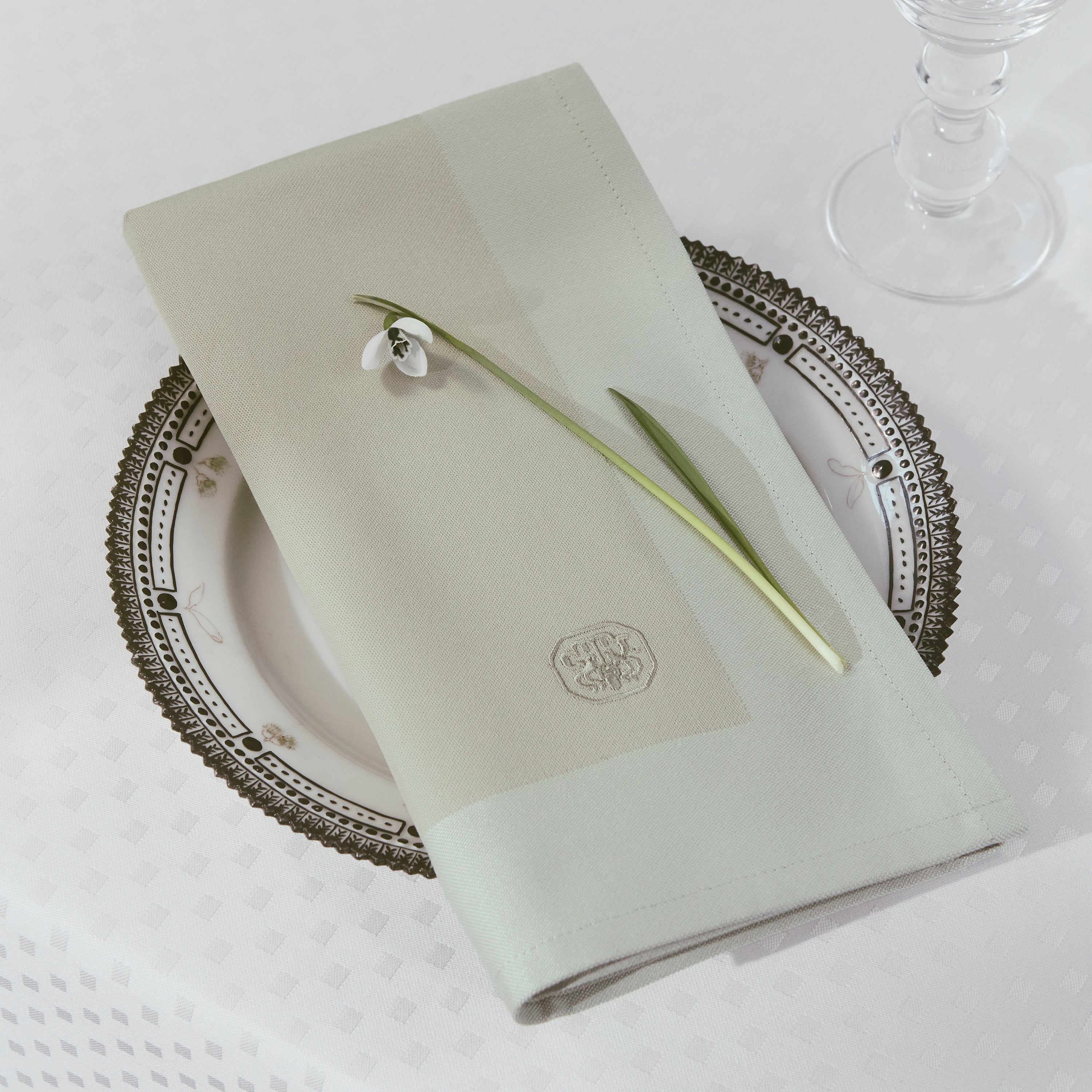 Unsere klassische serviette hat ein wunderschön gesticktes Logo. Die klassische Serviette aus Damastgewebe ist eine hübsche Ergänzung für den gedeckten Tisch. Mit ihrem schlichten Design und zeitlosen Ausdruck passt sie zu allen Gelegenheiten.