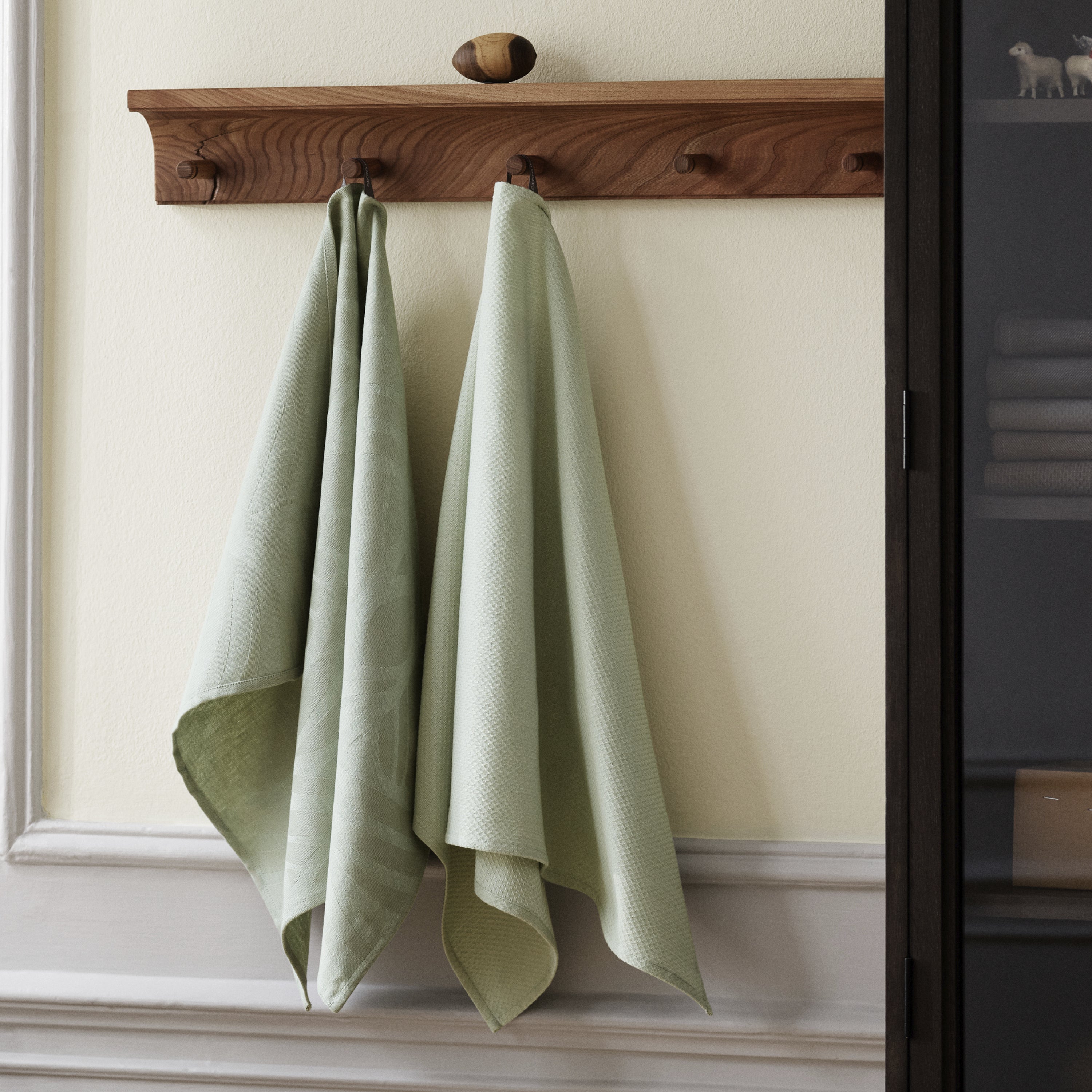 Das schlichte und zeitlose Ostermotiv des Geschirrtuch mit stilisierten Hühnern und Eiern wurde von Bodil Bødtker-Næss entworfen, die in den 1970er Jahren zum engeren Kreis der Textilkünstler um Georg Jensen Damask gehörte und auch hinter dem klassischen Weihnachtsherzmotiv steht, das ein charakteristisches Design der Kollektion ist.