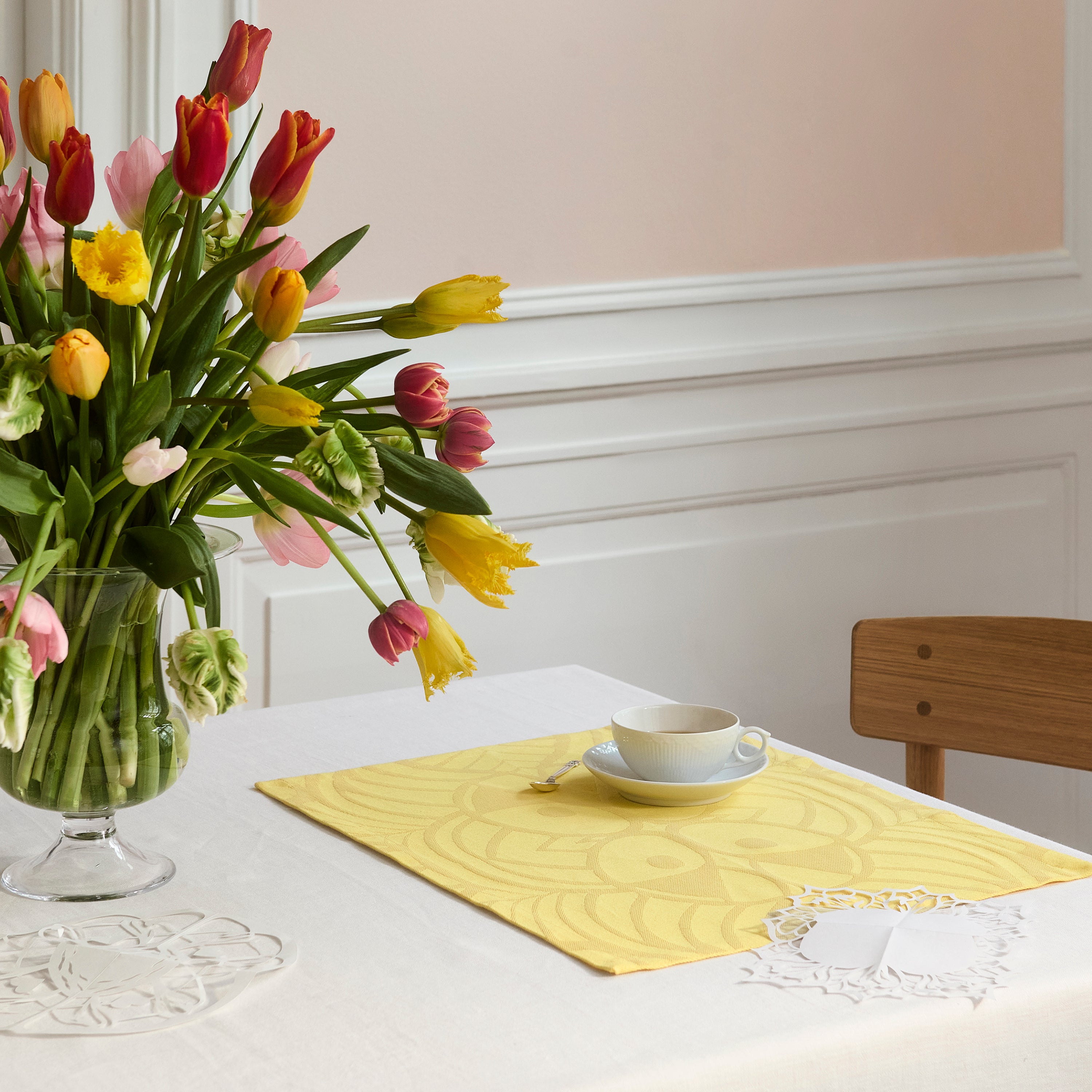 Das kräftige Damastgewebe aus 50% Leinen und 50% Baumwolle verleiht den Platzdeckchen einen rustikalen Look, durch den sie eher ungezwungen wirken, nichtsdestotrotz aber den Tisch in der Osterzeit wunderschön kleiden.