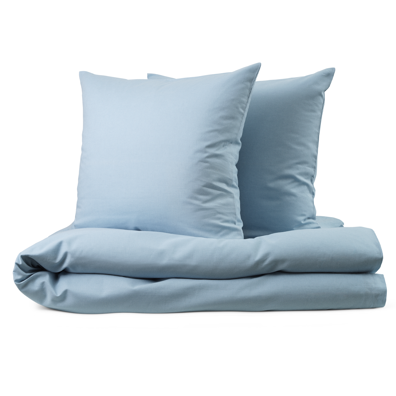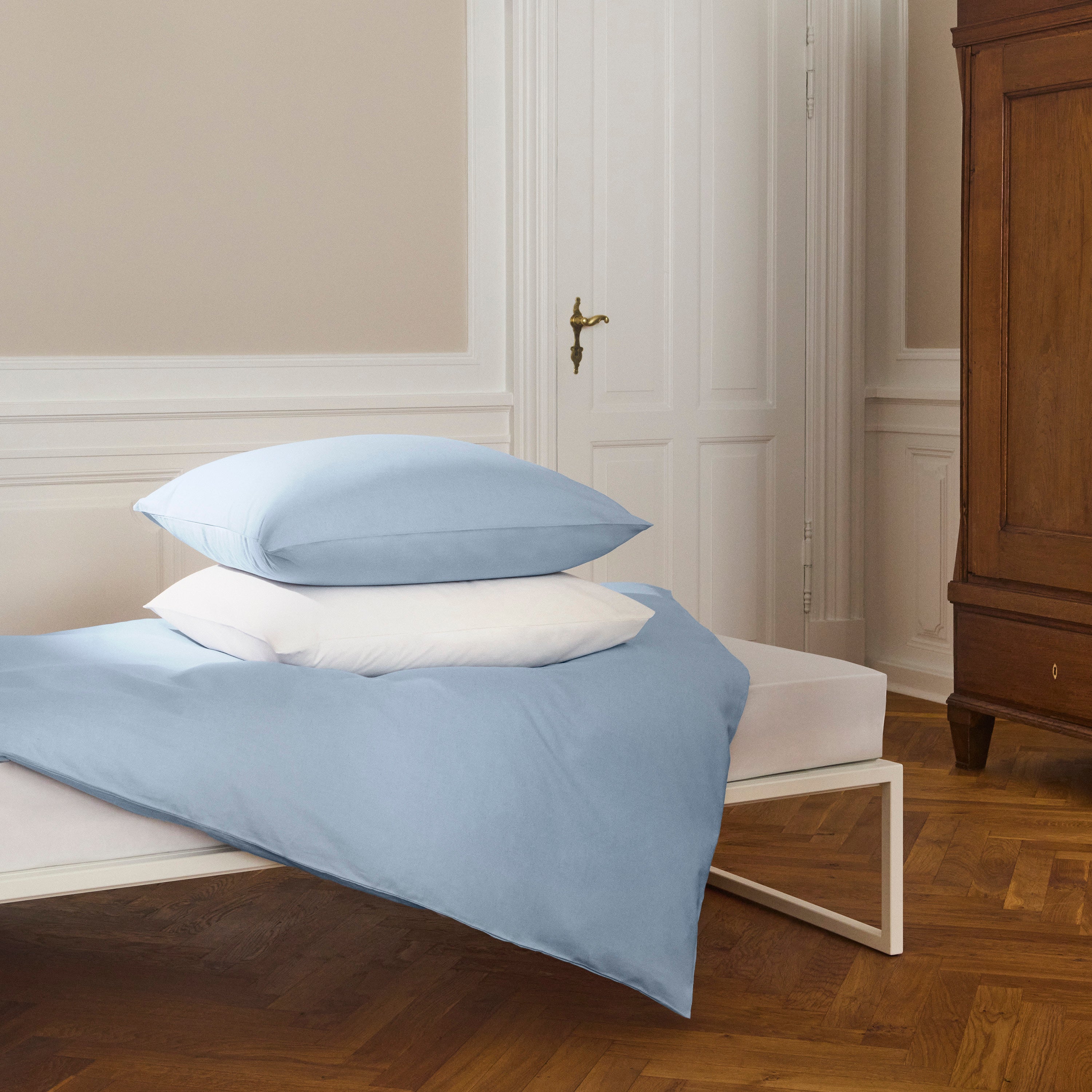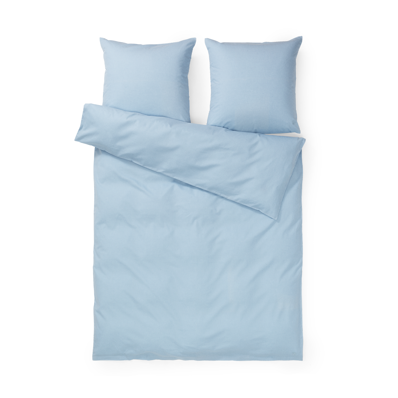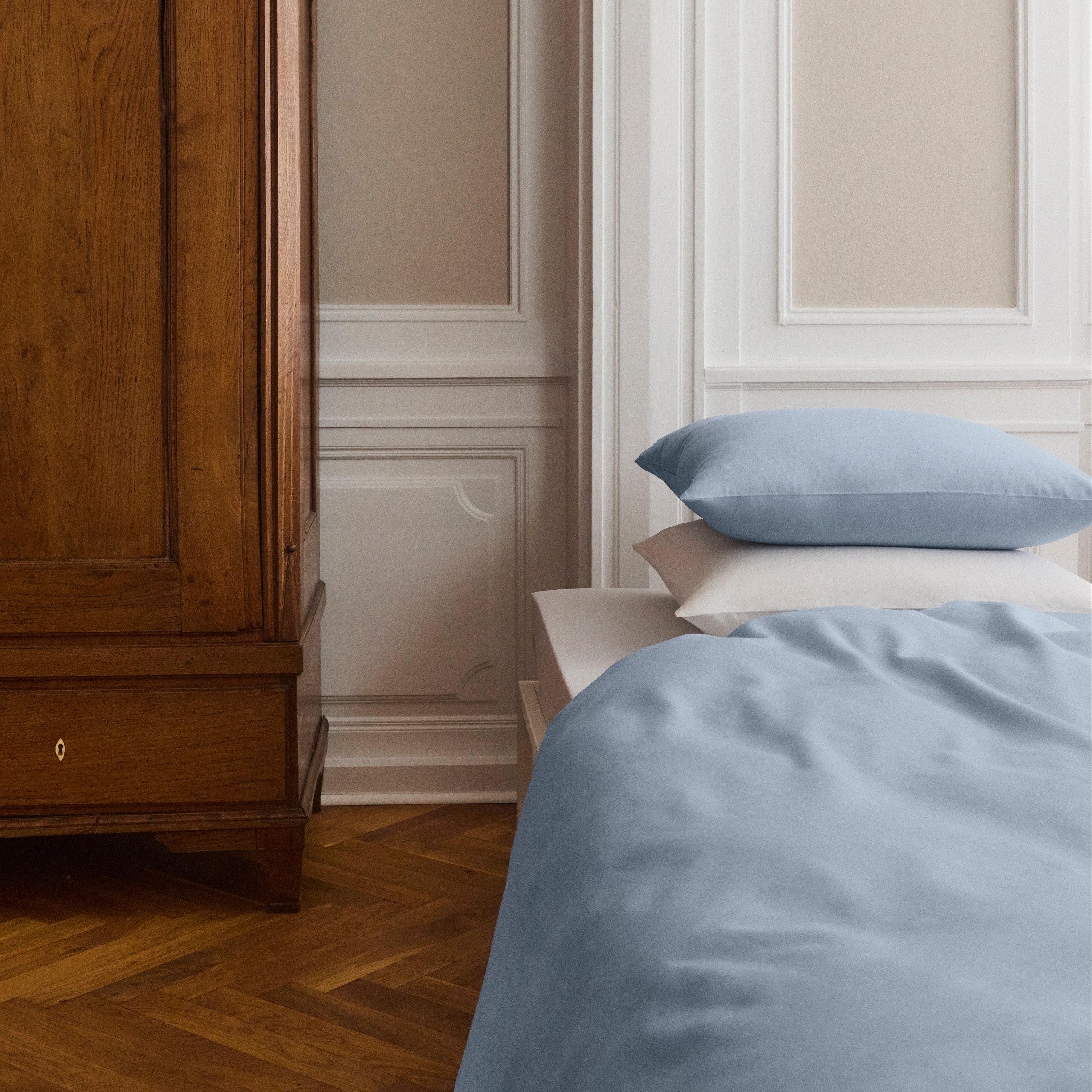 Die Even-Bettwäsche ist in Leinen und Baumwolle gewebt, um die besonderen Eigenschaften beider Materialien zu vereinen. Die natürliche Textur des Leinens kombiniert mit der Weichheit und Formstabilität der Baumwolle. Zusammen ergibt dies eine schöne, matte und weiche Oberfläche – sowie eine atmungsaktive und langlebige Bettwäsche. Die Farbe Blue Haze ist ein heller, pudriger Blauton.