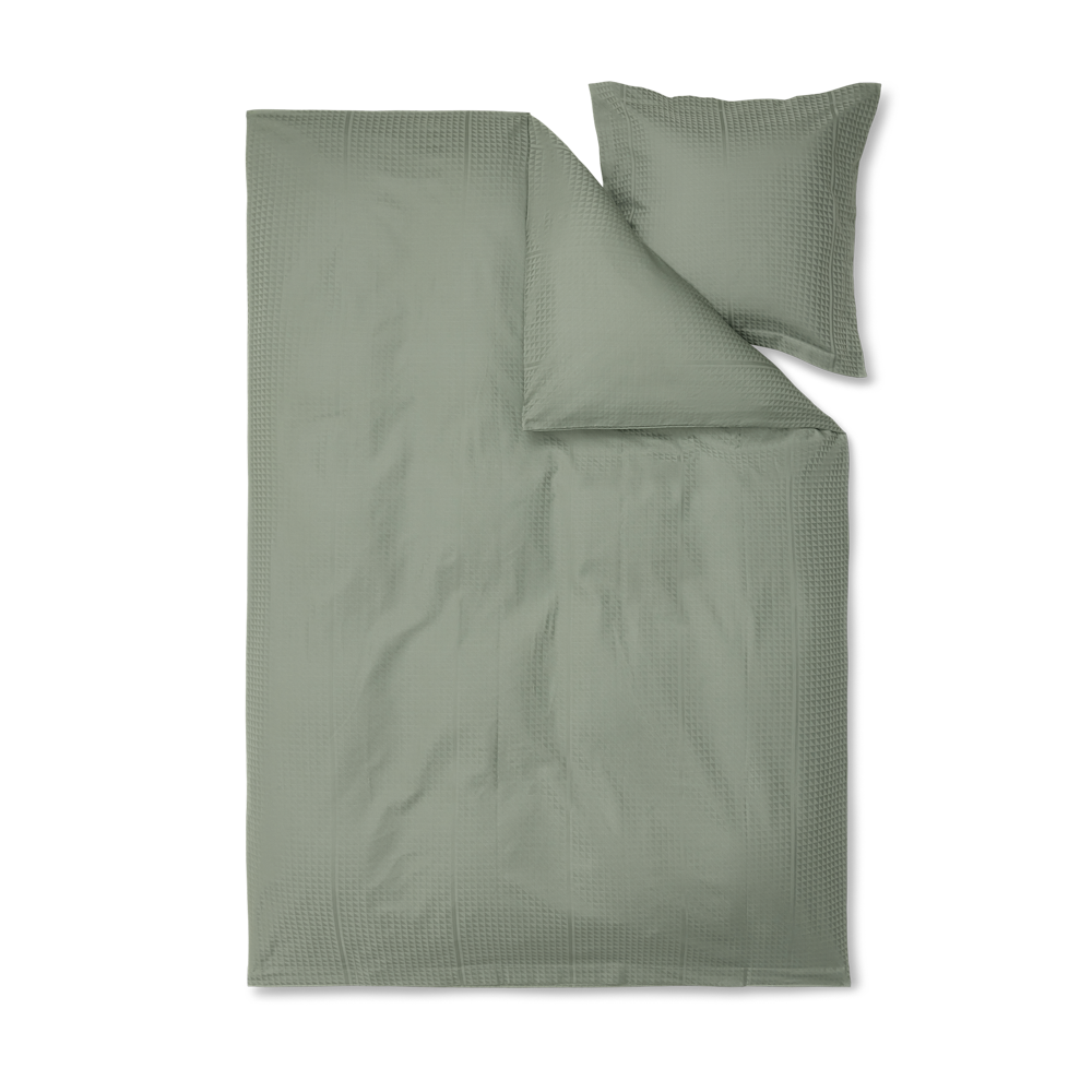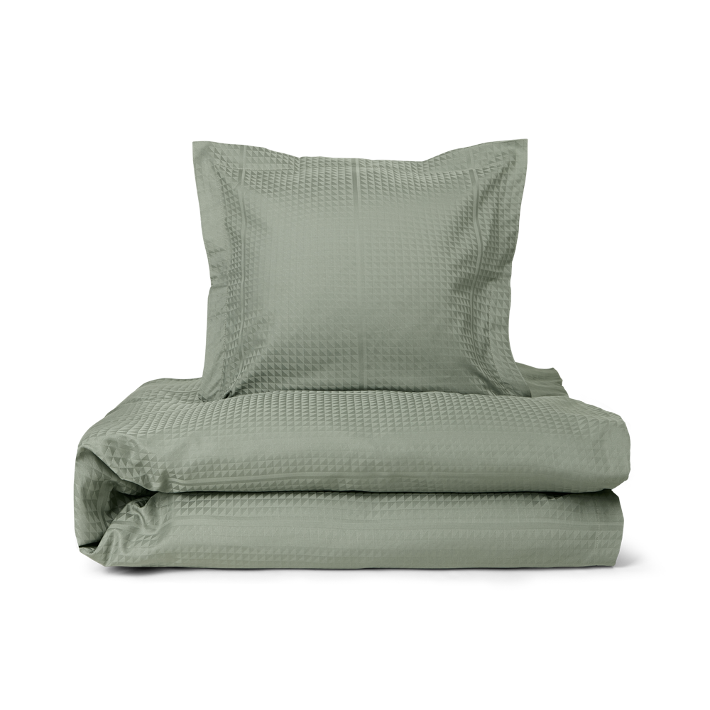 Das Facet-Bettwäsche-Set von Georg Jensen Damask für die Jüngsten der Familie besticht durch ein klares Design und ist in 100 % gekämmter Baumwolle damastgewebt, was eine weiche und glatte Oberfläche ergibt. Mit dem Facet-Design nutzt die Textilkünstlerin Jette Nevers die klassische Damastbindung, um ein elegantes Spiel von Licht und Schatten zu schaffen, das in der dunkelgrünen Farbe Mineral Green besonders zur Geltung kommt.