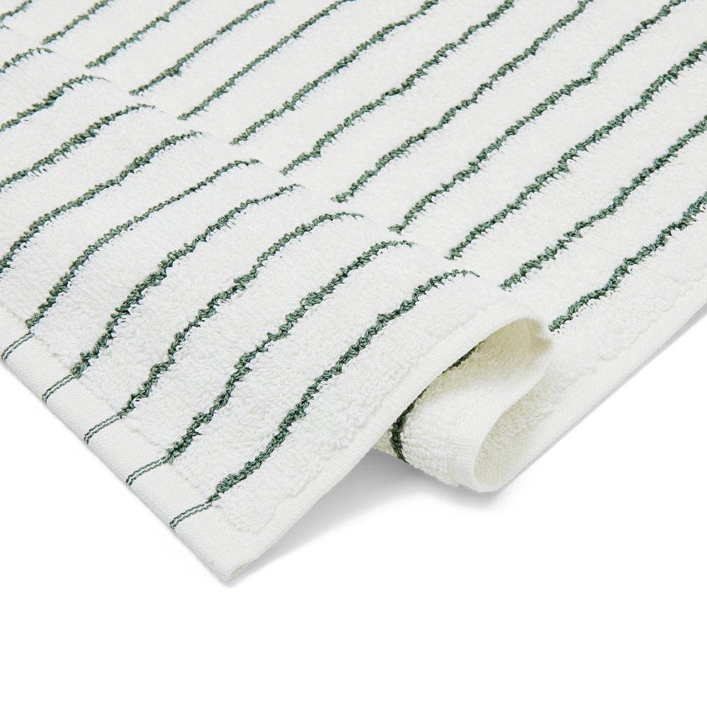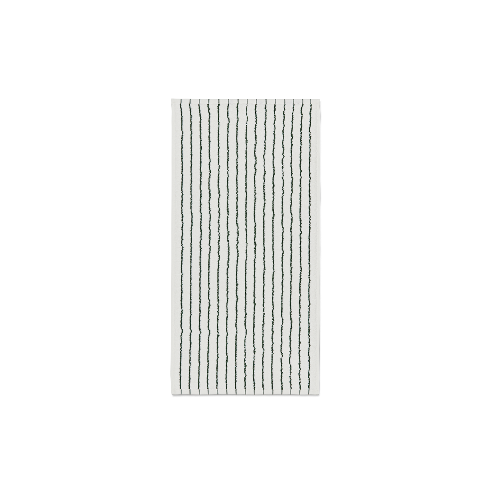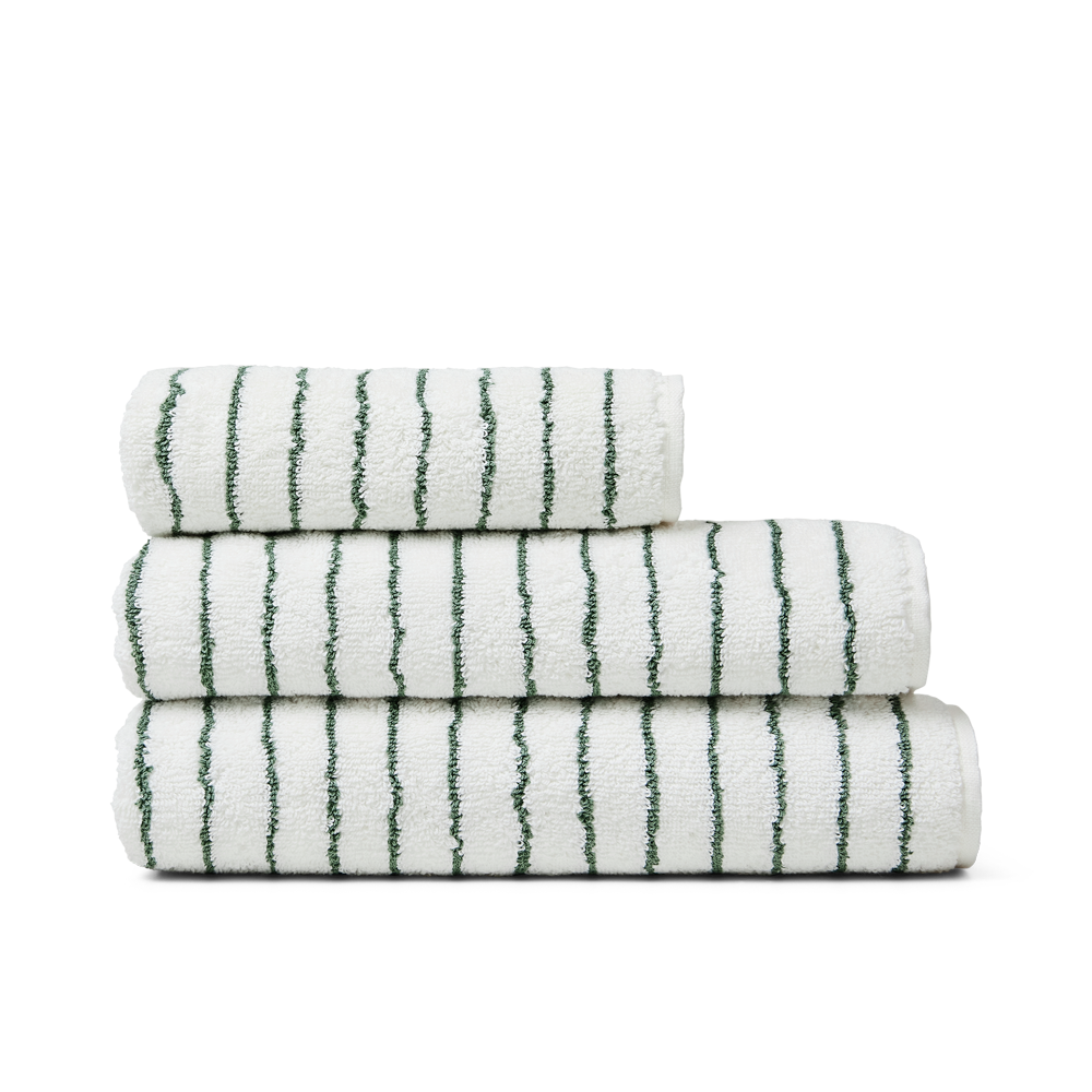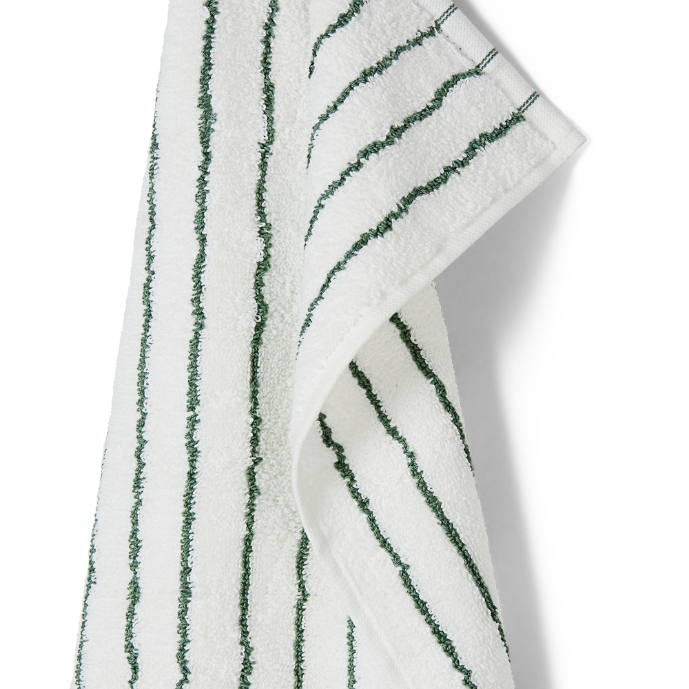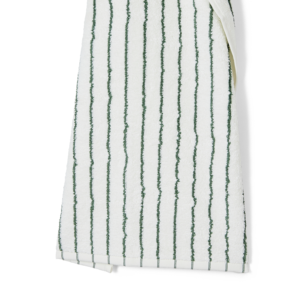 Die schmalen dunkelgrünen und weißen Streifen verleihen den Handtüchern einen modernen Look. Die gestreiften Handtücher sind alleine schön – oder in Kombination mit unifarbenem Frottee. Unser Frottee wird immer besser, je öfter es verwendet wird.