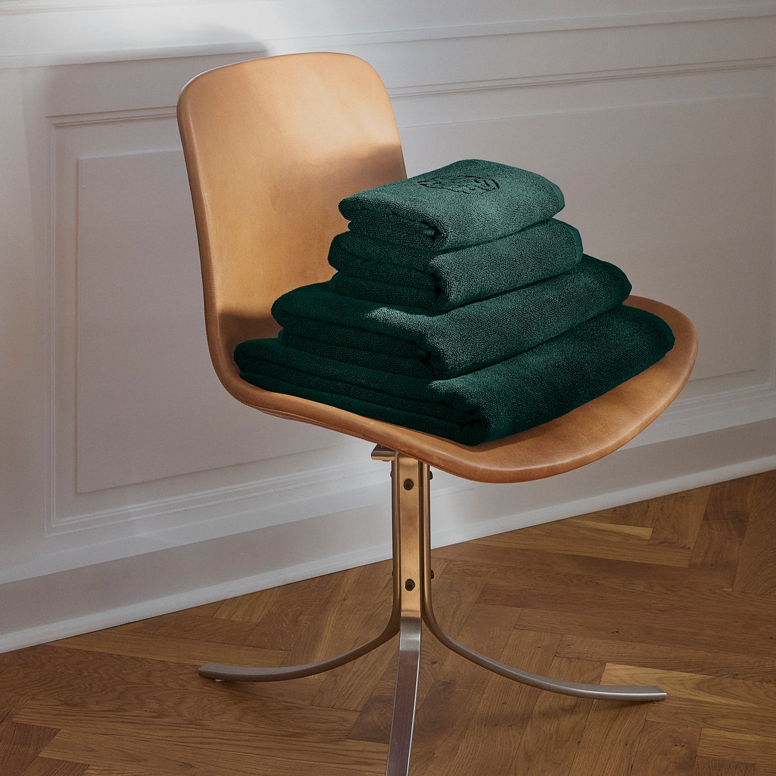 Das Damask Terry Handtuch zeichnet sich durch ein schlichtes Design aus, mit dem ikonischen Logo von Georg Jensen Damask als elegantes eingewebtes Detail. Evergreen ist ein ganz dunkles und kühles Grün. Klassisch und anspruchsvoll.