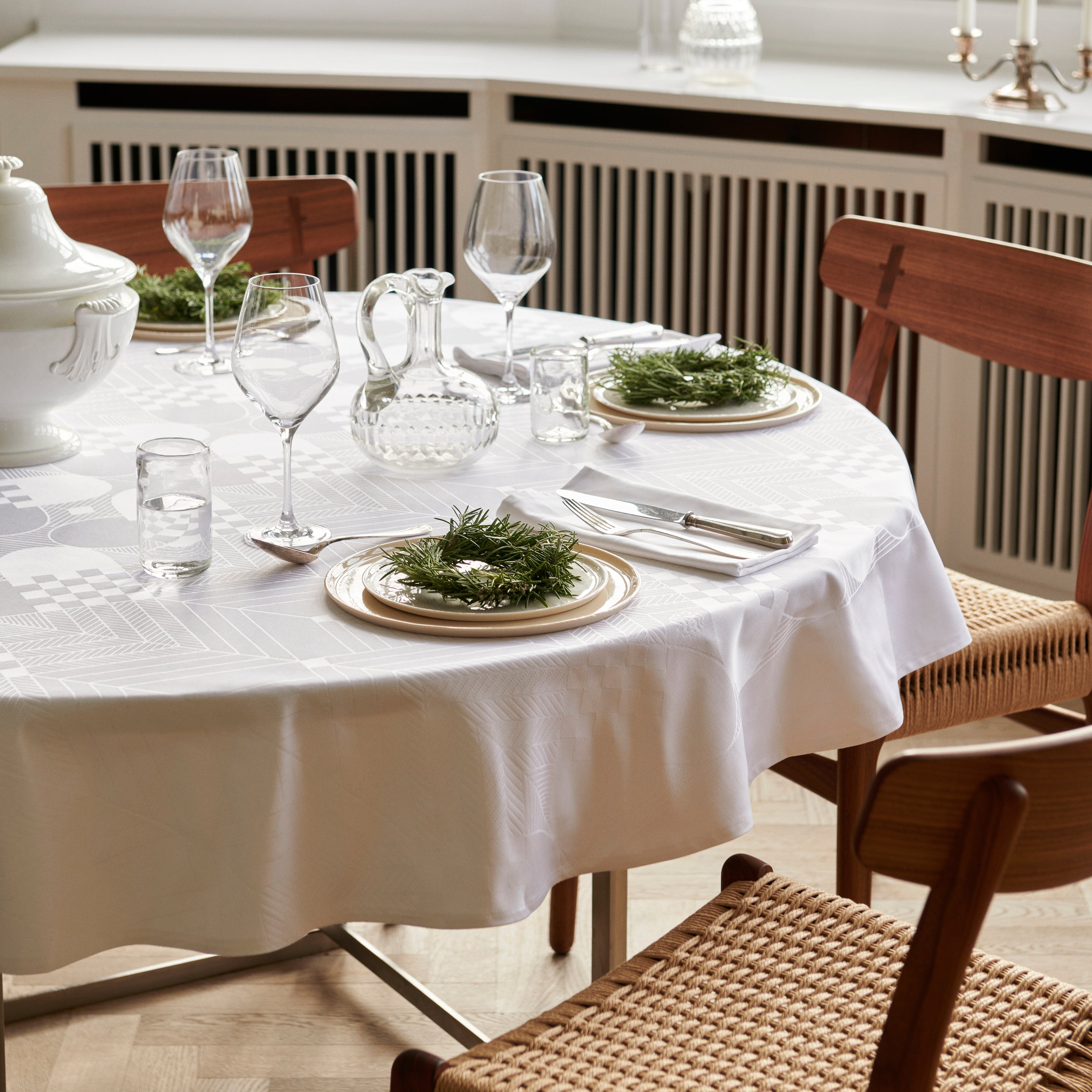 Das Motiv der Tischdecke wurde von Bodil Bødtker-Næss entworfen, die in den 1970er-Jahren Teil des inneren Kreises um Georg Jensen Damask war und auch hinter dem klassischen Osterdesign aus der gleichen Zeitperiode steht. Die geflochtenen Weihnachtsherzen und stilisierten Tannenzweige stellen seit mehr als 40 Jahren den Inbegriff von Weihnachtsstimmung dar und dieses Design ist bei vielen zu Hause ein unverzichtbarer Bestandteil der Weihnachtszeit.