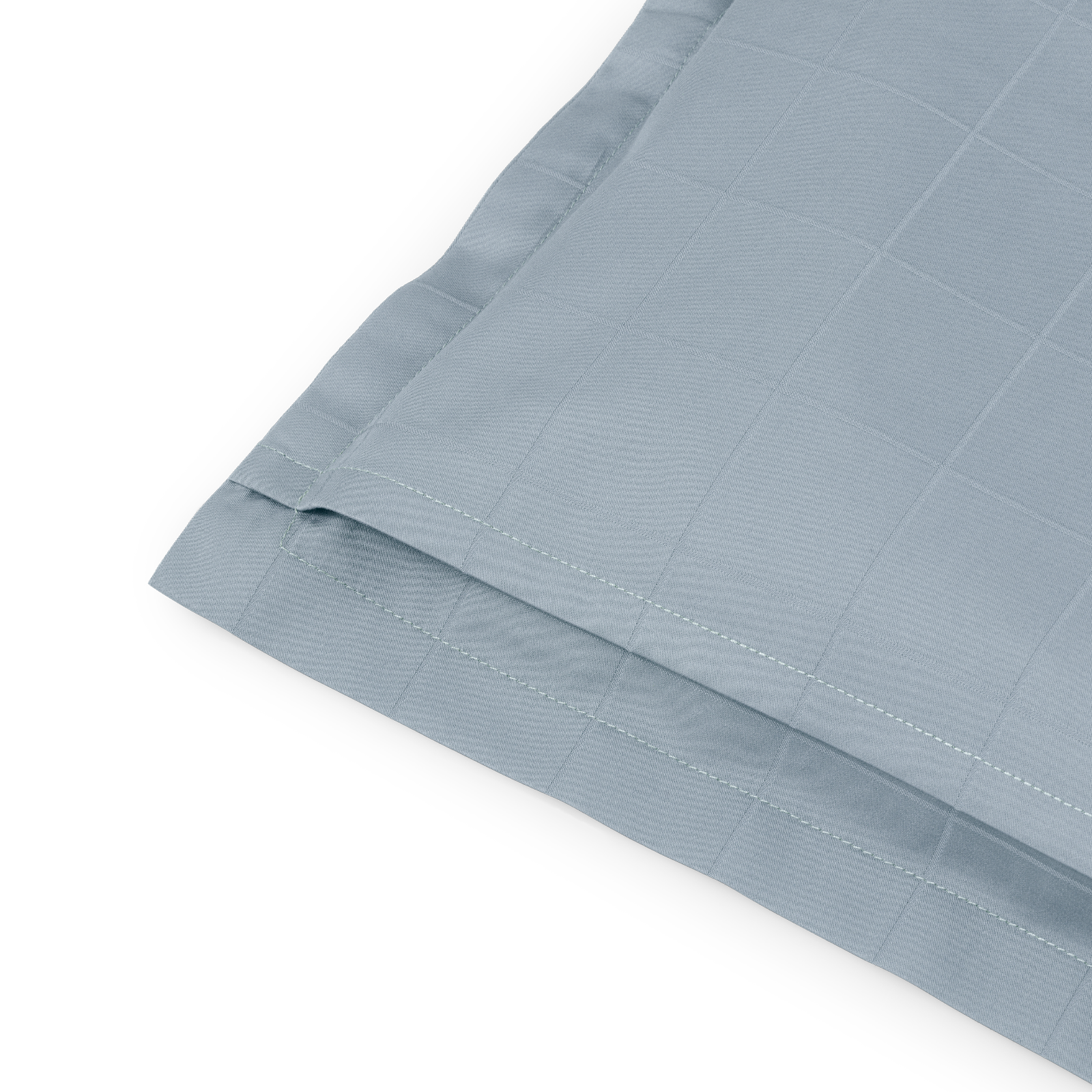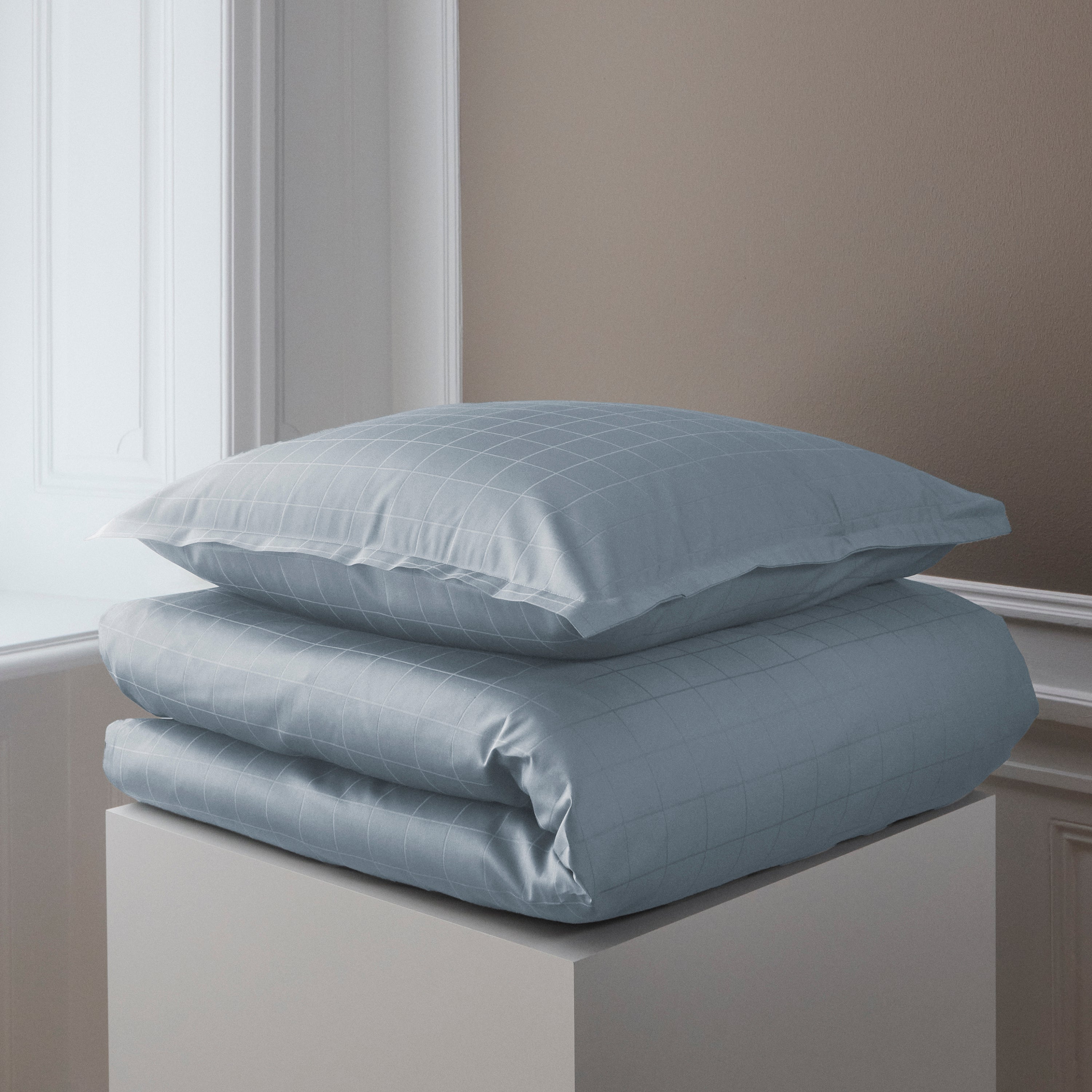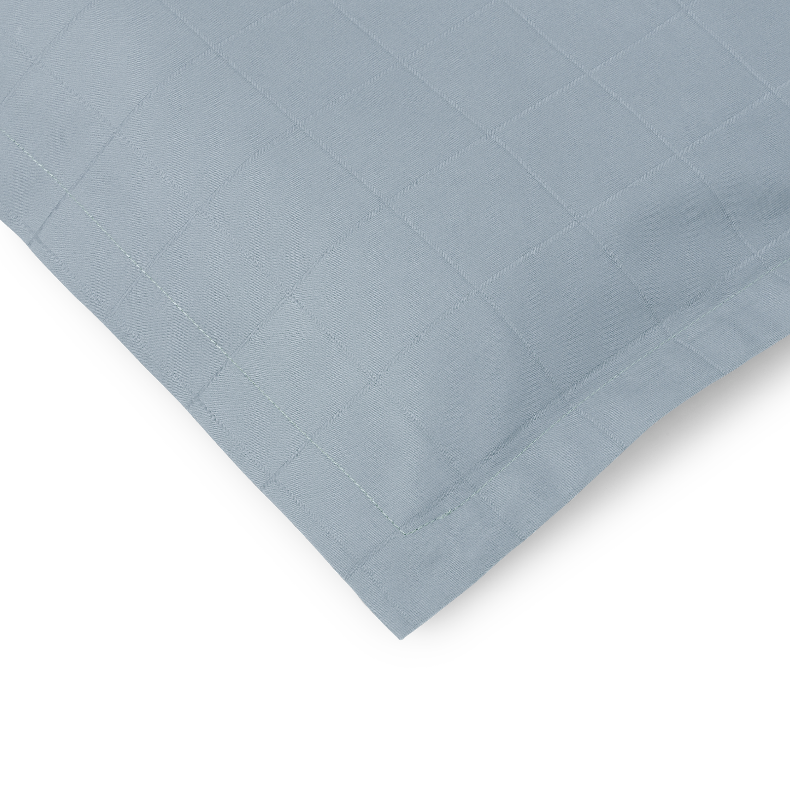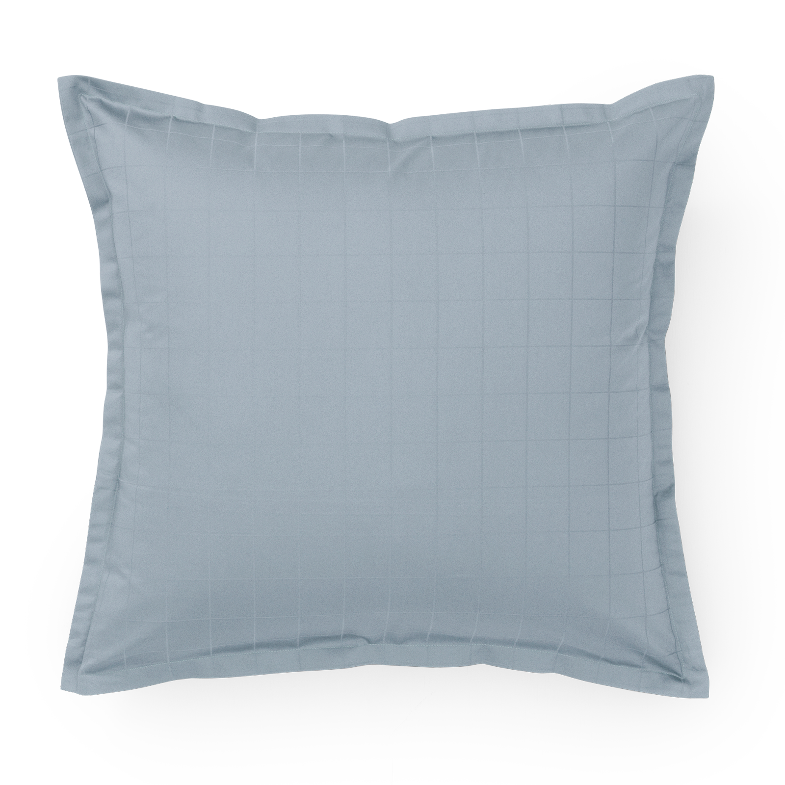 Light Squares Kissenbezug mit einem leichten grafischen Muster, das in der feinen Satinbindung hervorgehoben wird. Light Squares ist aus 100 % gekämmter Baumwolle gewebt, was eine starke und weiche Oberfläche verleiht. Die Farbe Blue Haze ist ein heller und gedämpfter Blauton.
