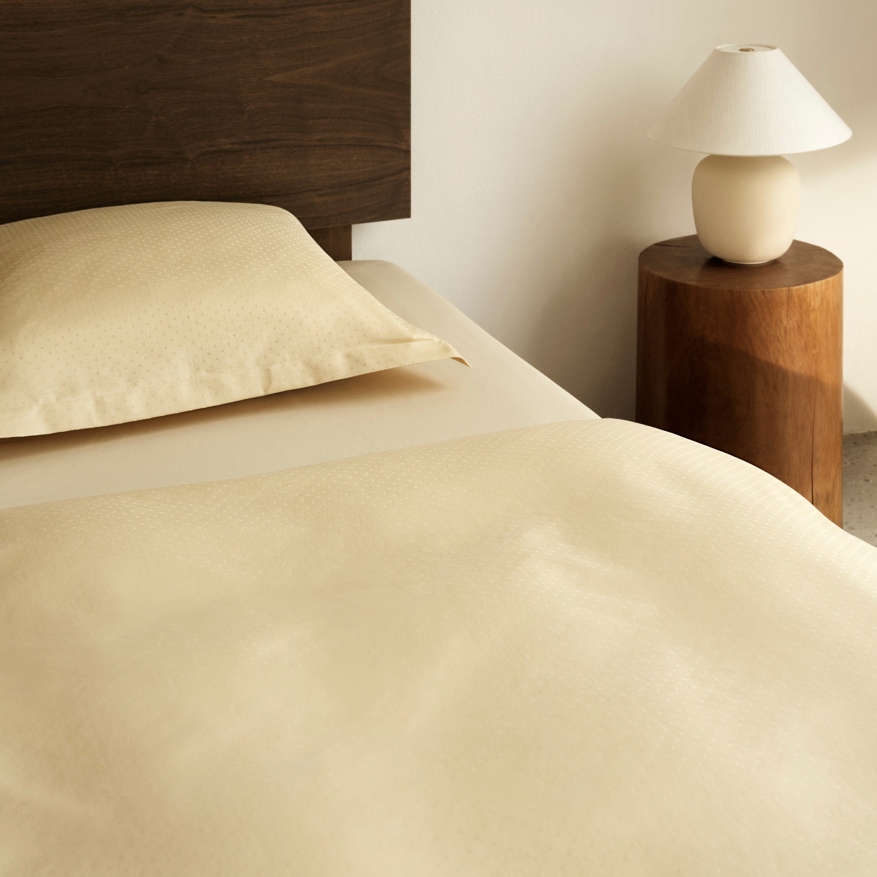 Die Nordlys-Bettwäsche besticht durch ein elegantes Design, bei dem die organischen Formen des Nordlichts in ein zeitloses geometrisches Muster übersetzt wurden. Wheat ist ein sanfter, hellgelber Farbton, der von der goldgelben Farbe des Weizens inspiriert ist.