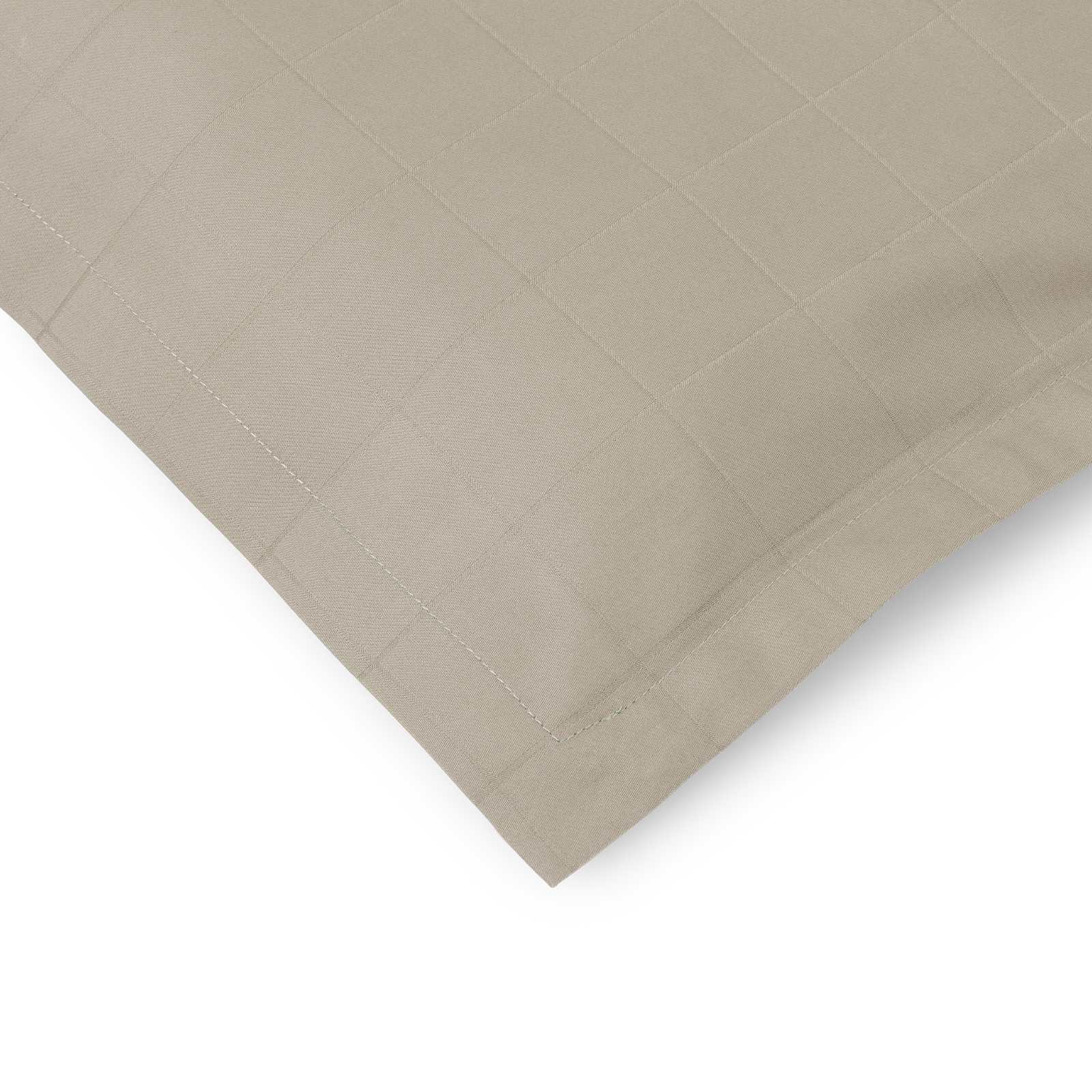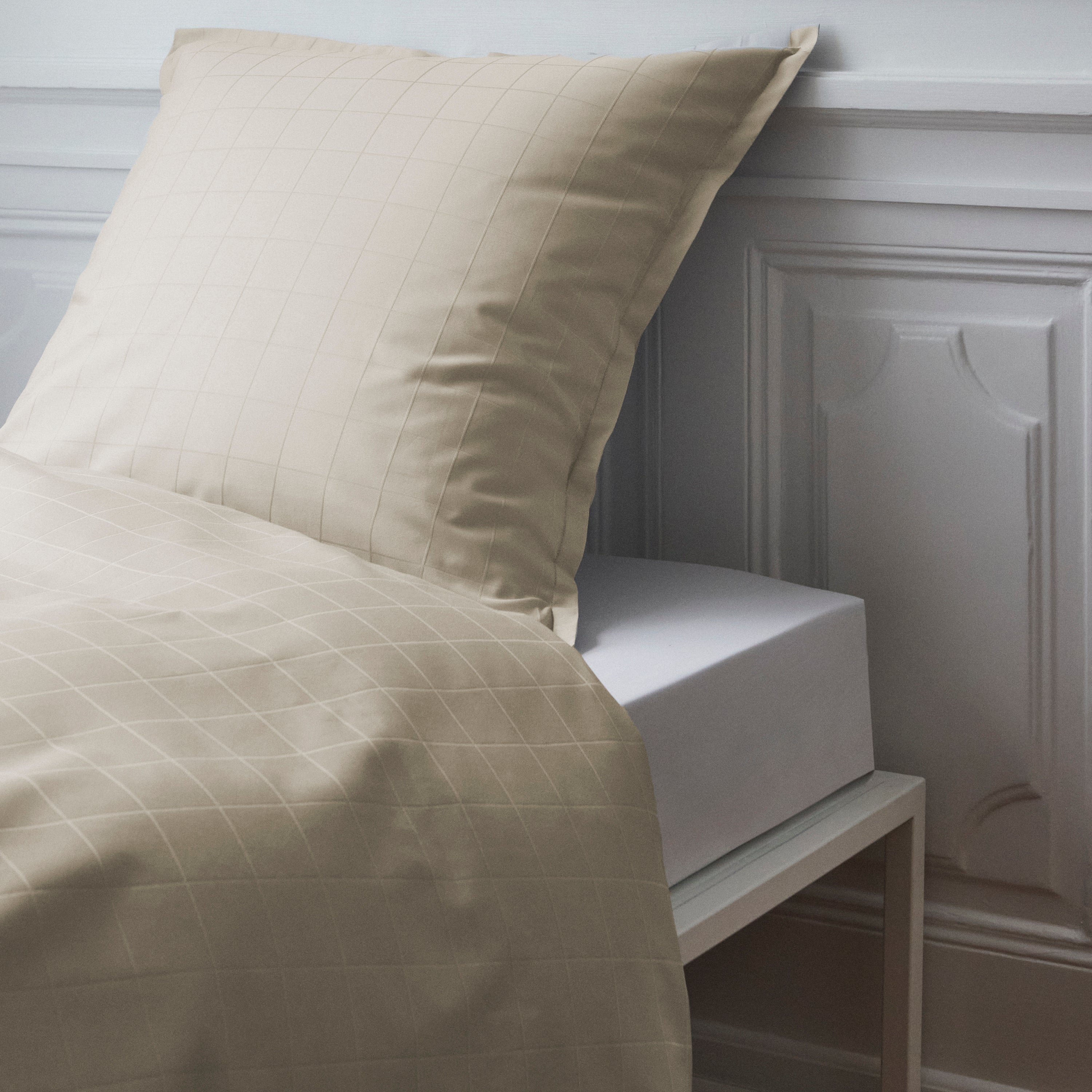 Light Squares Kissenbezug in der Farbe Grey Sand. Light Squares hat ein leicht grafisches Muster, das in der feinen Satinbindung hervorgehoben wird. Es ist aus 100 % gekämmter Baumwolle gewebt, was eine starke und weiche Oberfläche verleiht. Grey Sand ist ein warmer Grauton.