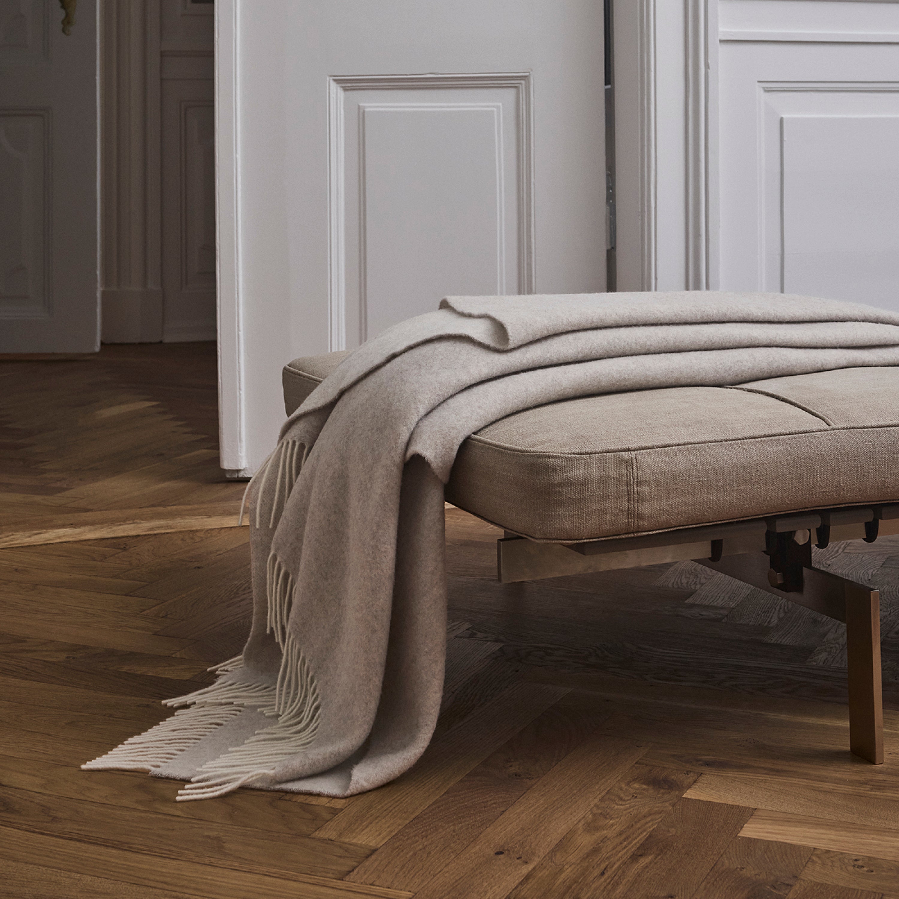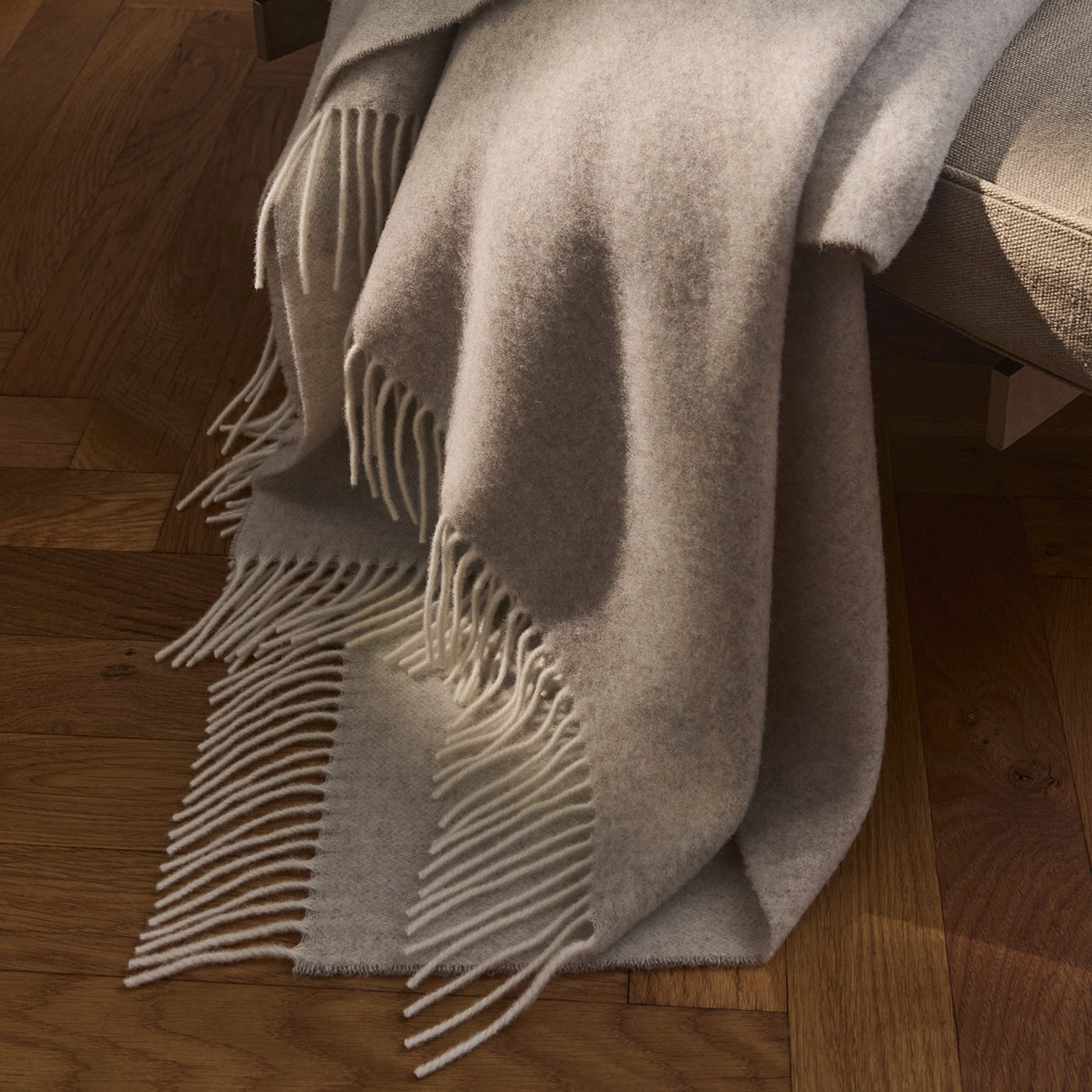 Union-Plaid aus Merinowolle und Kaschmir, das eine besonders weiche und leichte Oberfläche bietet. Das Plaid ist in sandfarbenen Tönen gewebt und hat lange Fransen. Der dezente Farbunterschied zwischen Vorder- und Rückseite verleiht einen eleganten Ausdruck.