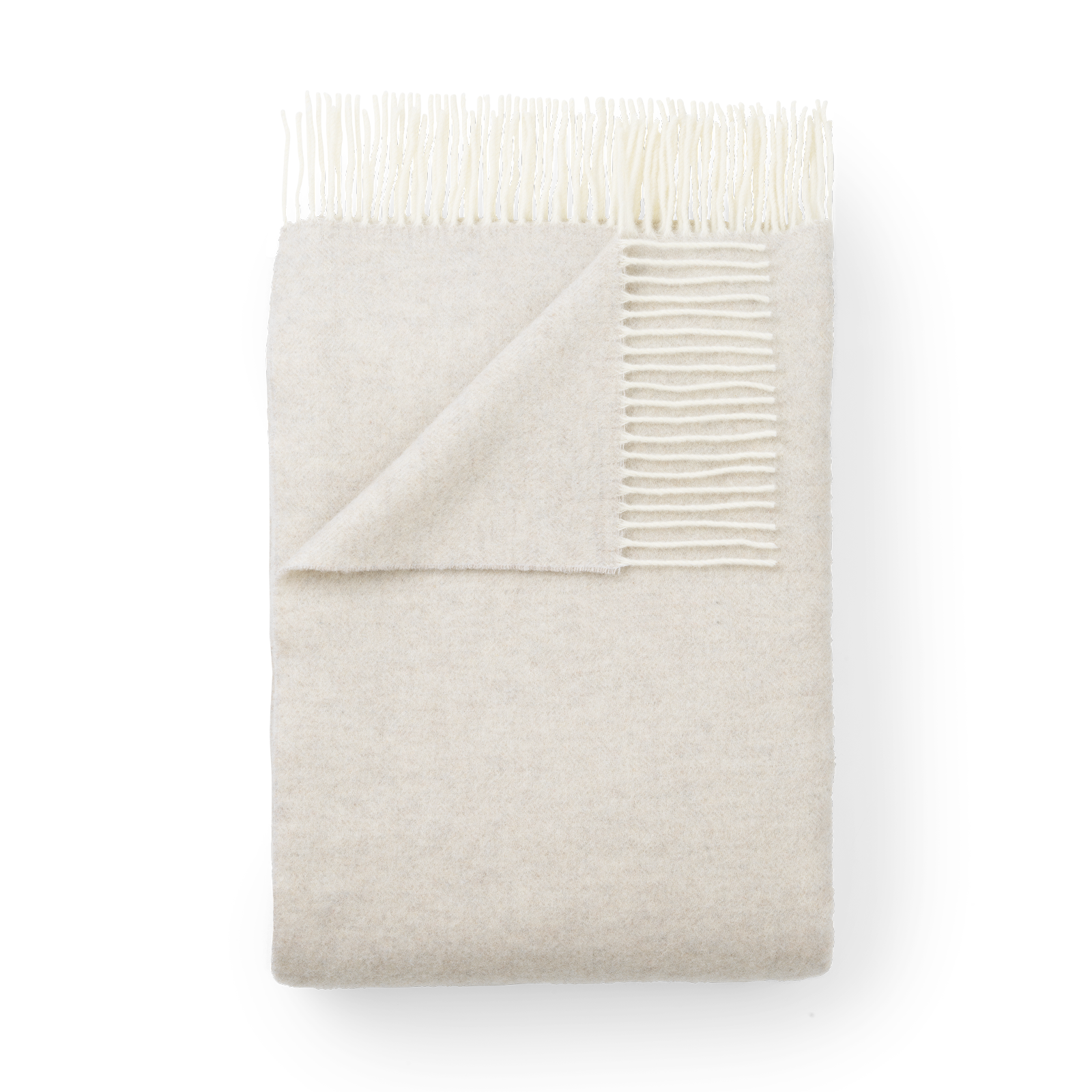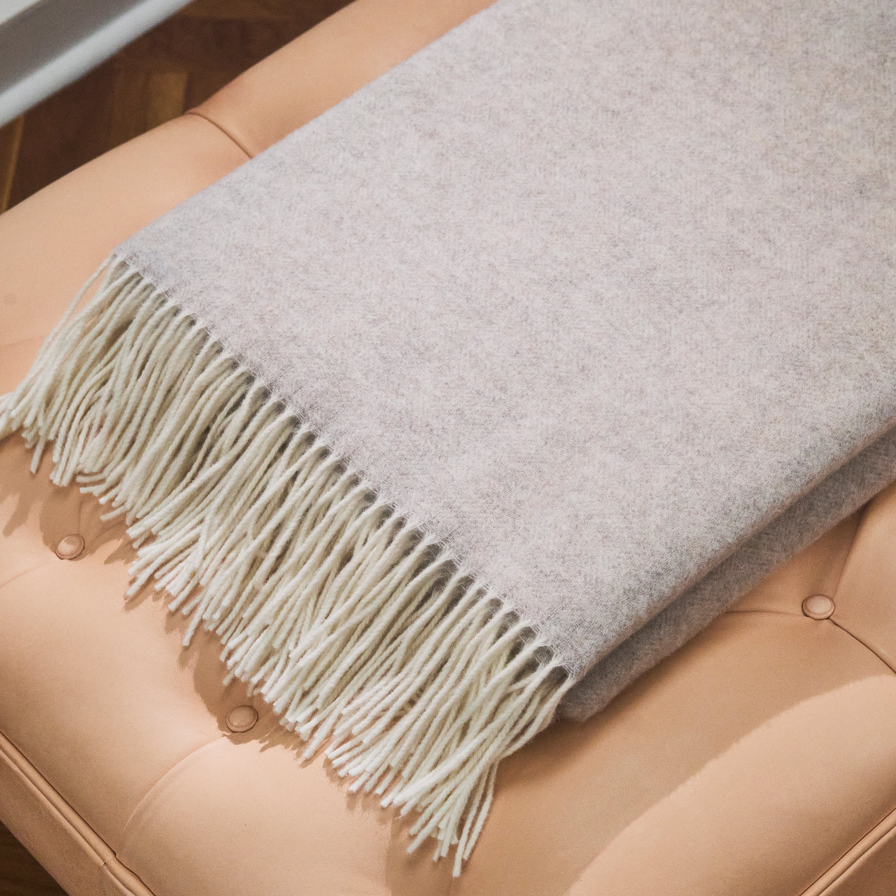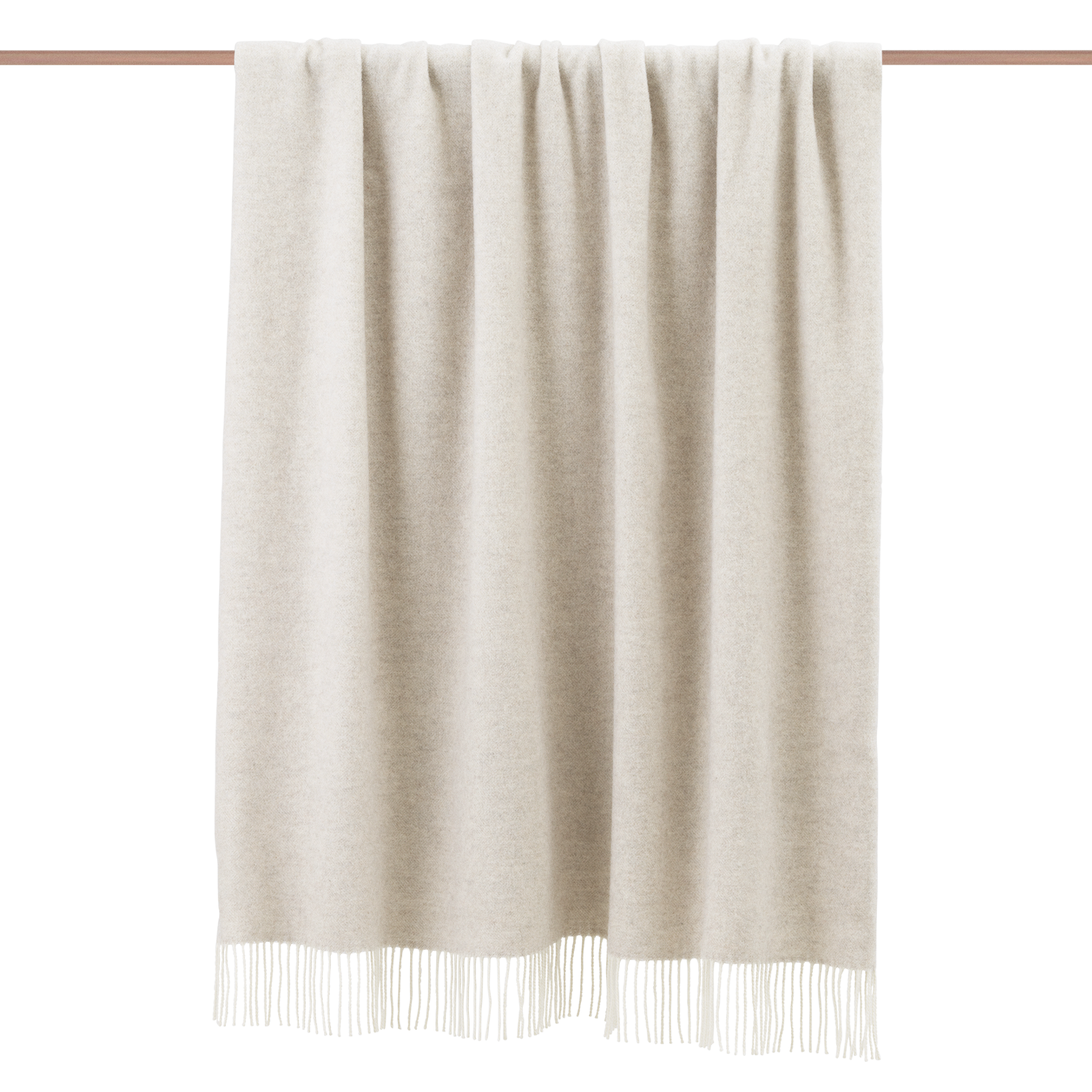 Elegante Plaid aus Merinowolle und Kaschmir. Das Drift-Plaid in der Farbe Soft Sand ist in einem raffinierten Fischgrätmuster aus Garnen in sandfarbenen Nuancen gewebt, was ihm ein schönes und natürliches Erscheinungsbild verleiht. Das Drift-Plaid besteht aus 90 % Merinowolle und 10 % Kaschmir, wodurch es die Wärme gut speichert und sich perfekt zum Einkuscheln eignet.