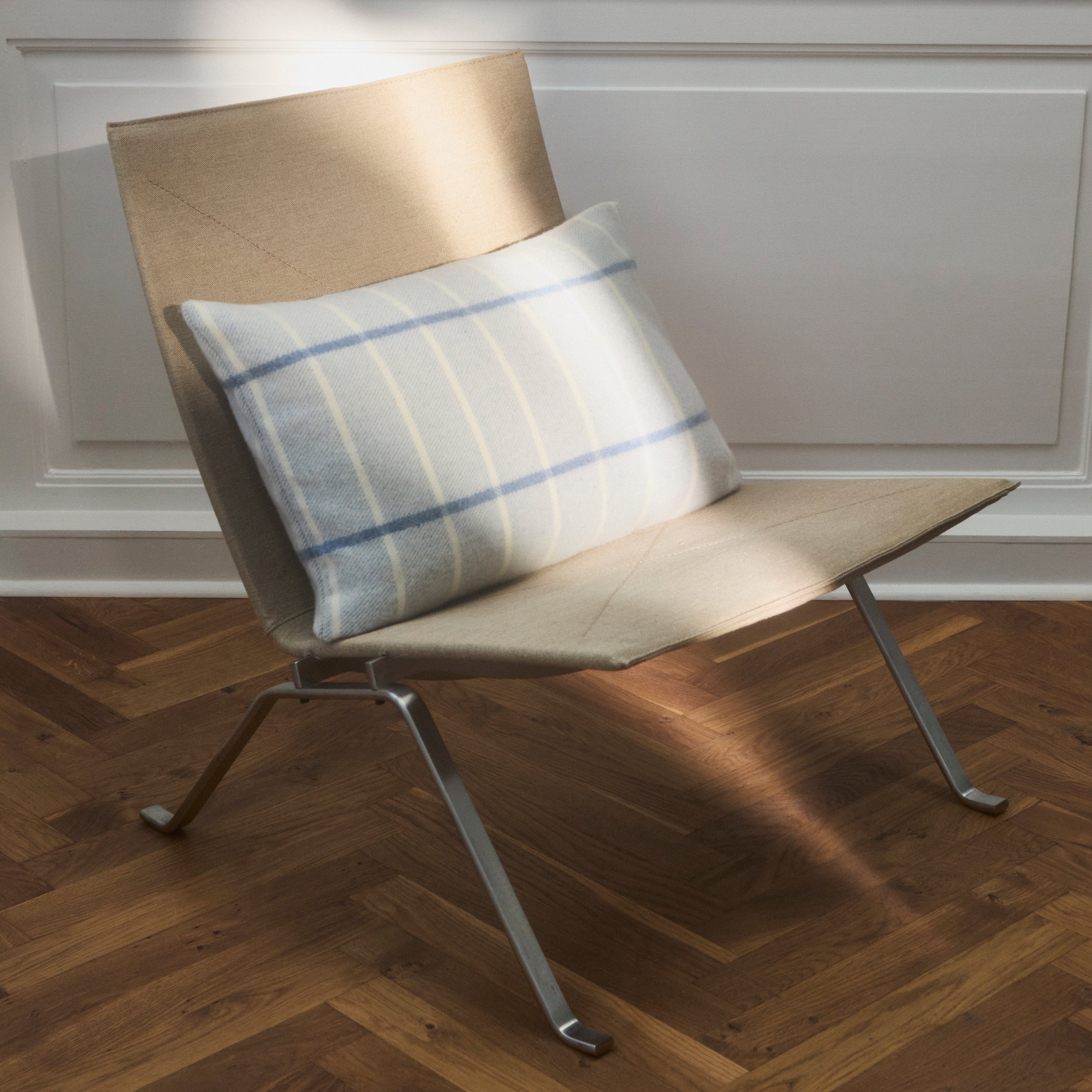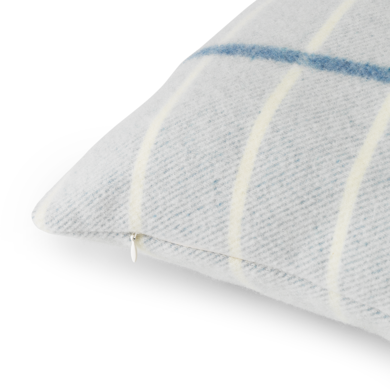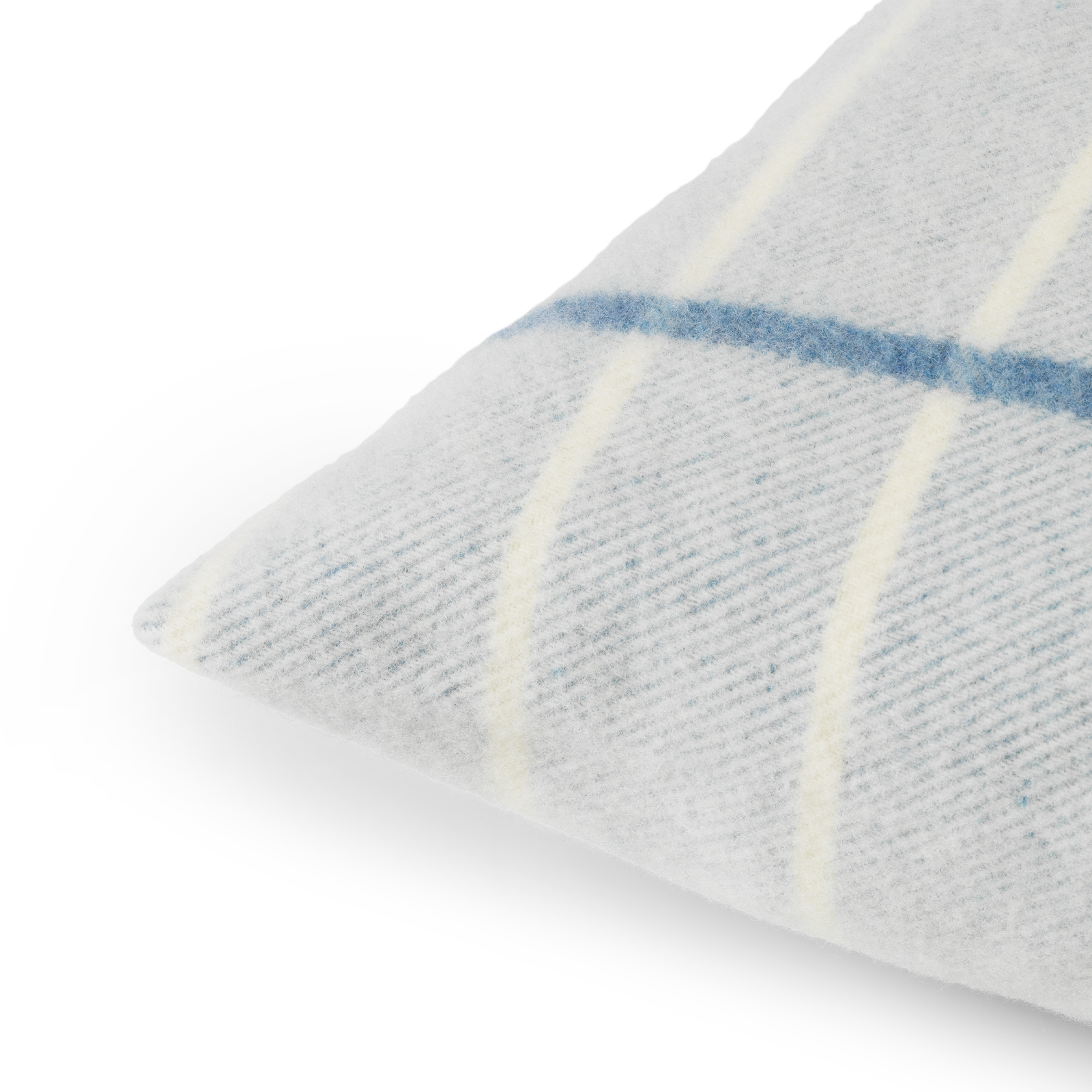 Das Tartan-Kissen hat ein elegantes und klassisches Karomuster. Die Kombination aus 90 % Merinowolle und 10 % Kaschmir macht das Kissen besonders weich, und die feine Struktur der Wolle verleiht ihm eine besondere Leichtigkeit. Es ist in Blau- und Weißtönen gewebt.