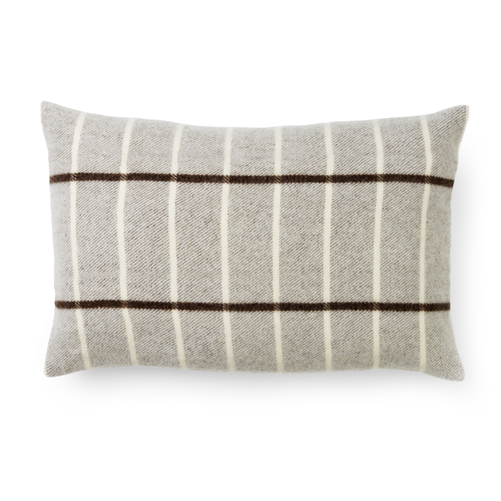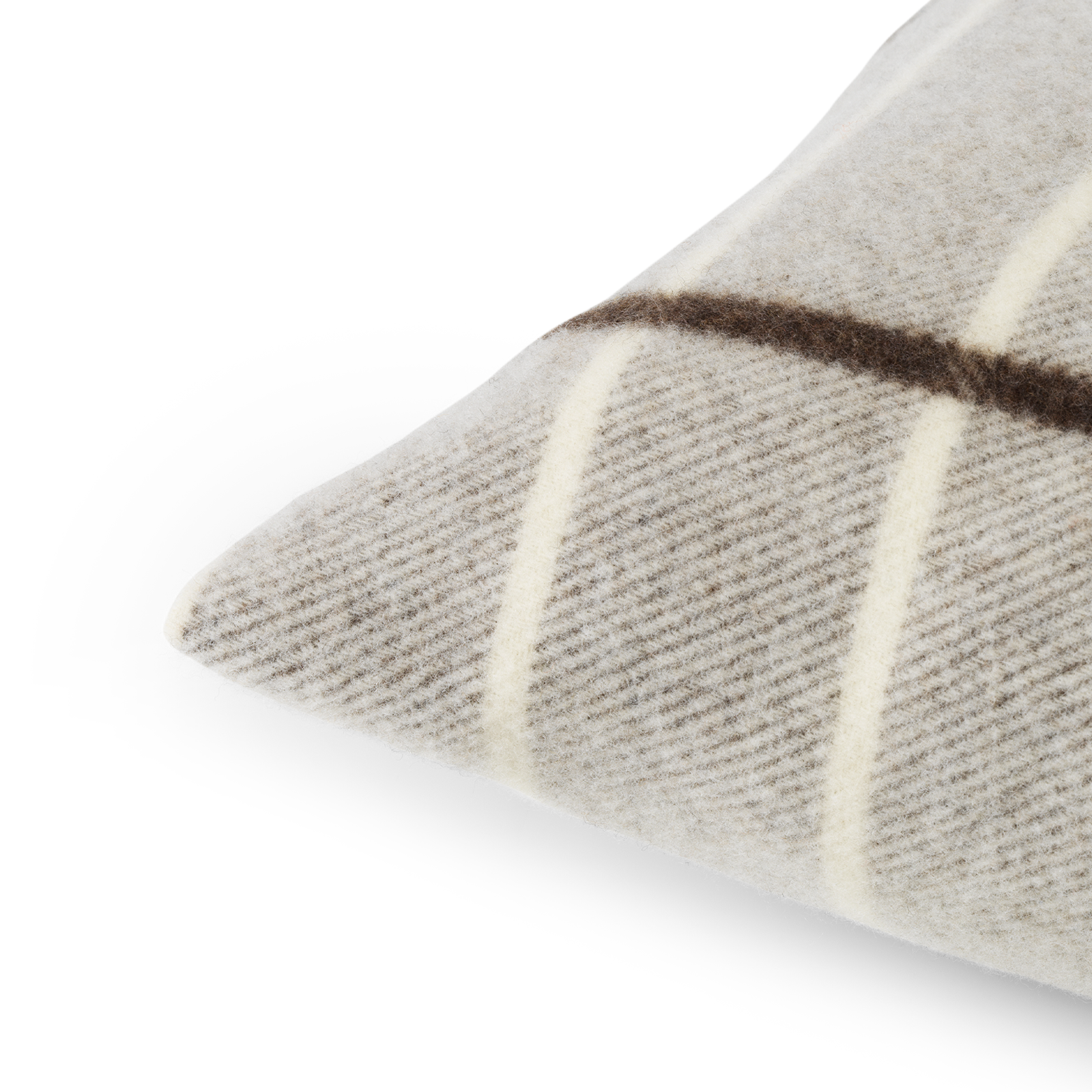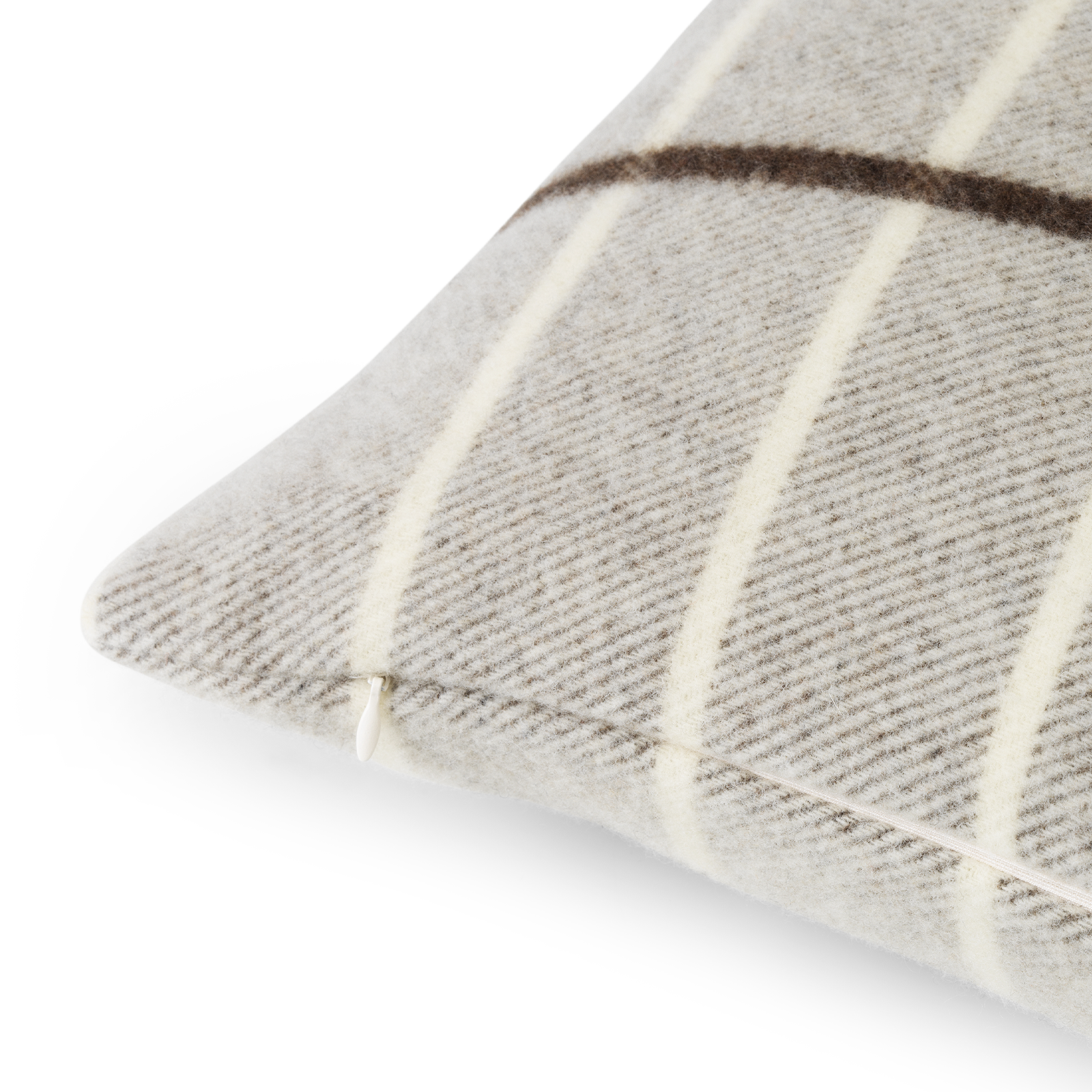 Das Tartan-Kissen hat ein elegantes und klassisches Karomuster. Die Kombination aus 90 % Merinowolle und 10 % Kaschmir macht das Kissen besonders weich, und die feine Struktur der Wolle verleiht ihm eine besondere Leichtigkeit. Es ist in Braun- und Weißtönen gewebt.