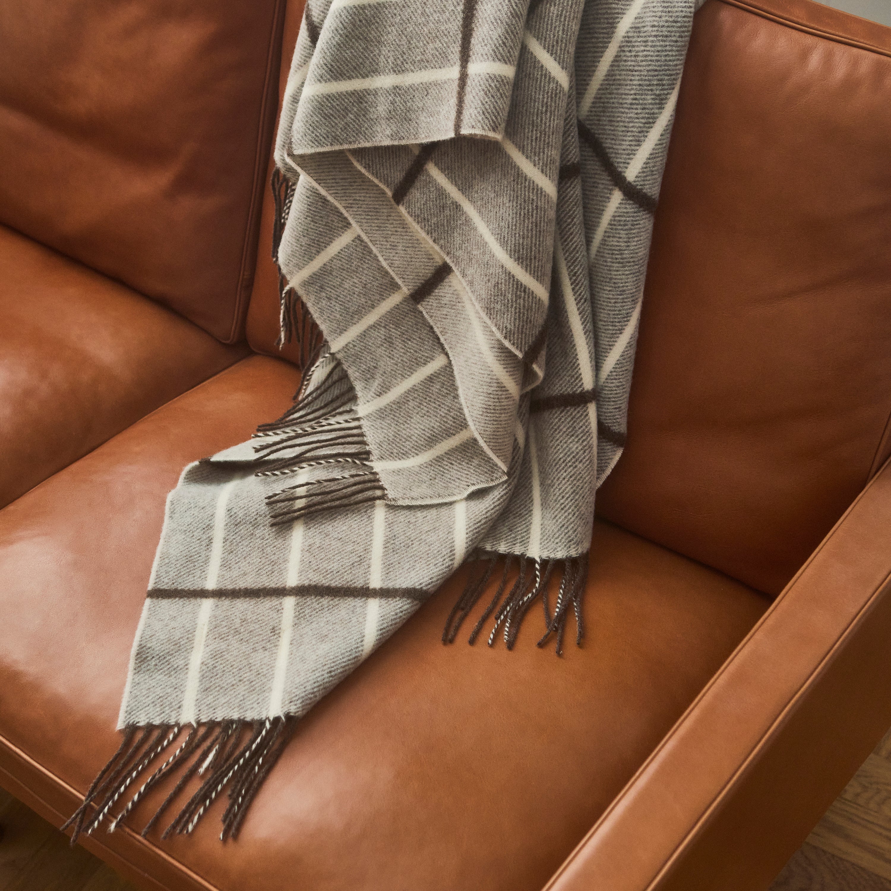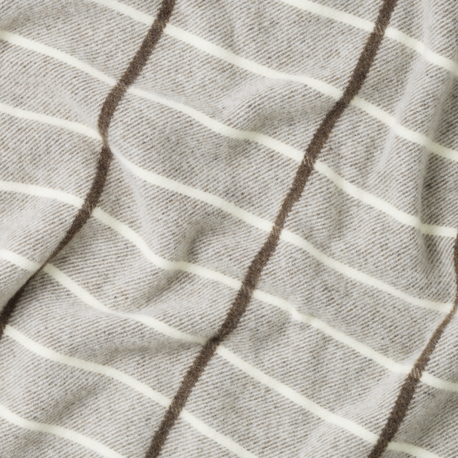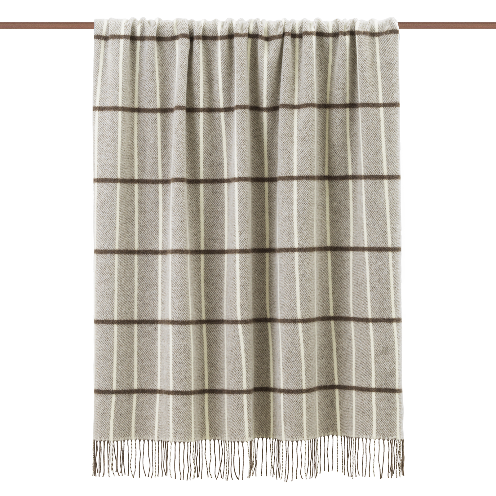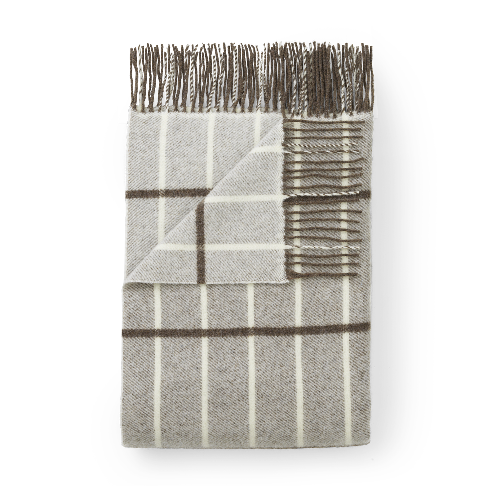 Die Tartan-Decke hat ein elegantes und klassisches Karomuster. Die Kombination aus 90 % Merinowolle und 10 % Kaschmir macht die Decke besonders weich, und die feine Struktur der Wolle verleiht ihr eine besondere Leichtigkeit. Sie ist in Braun- und Weißtönen gewebt und an den Enden mit Fransen versehen.
